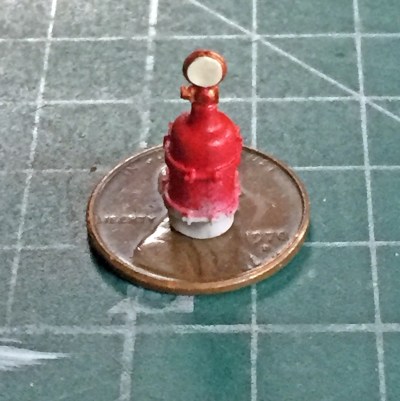 At least I remembered to paint the on-board fire extinguisher. Tamiya X-7 Gloss Red was used on the canister (the bottom will never be seen once it’s in place) and Tamiya XF-6 Copper was used on the valve body. Vallejo 71.132 Aged White was used on the gauge face (later I will use a SHARP pencil and draw on the face details):