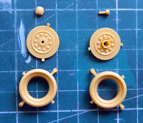 The road wheels are also multipart subassemblies. Every road wheel is comprised of six parts and there are five road wheels per side (and three return rollers just about as complex as the road wheels):
