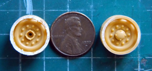 The idler wheels are beautifully cast and like the idler wheels on the actual tank, they have an inner lip on both sides of the rim. Had I bothered to check references I would have seen that these rims are recessed and not even with the outer edge of the rims the way I have them (and all nicely puttied, too). The plastic is SO thin that I’ve no doubt that if I try to pop those out of there to place them deeper, they won’t “pop,” they’ll “snap.” Fine…I’ll live with my mistake. Again:
