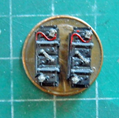 I drilled sockets for skewers so that I had handles to make painting small parts easier. Some sections were painted with Tamiya X-18 Semi-Gloss Black over the flat black. There’s a shroud at the rear of the floor (left in the photo below), the caps to the radiators and oil cooler (not shown), and the batteries that were painted semi-gloss: