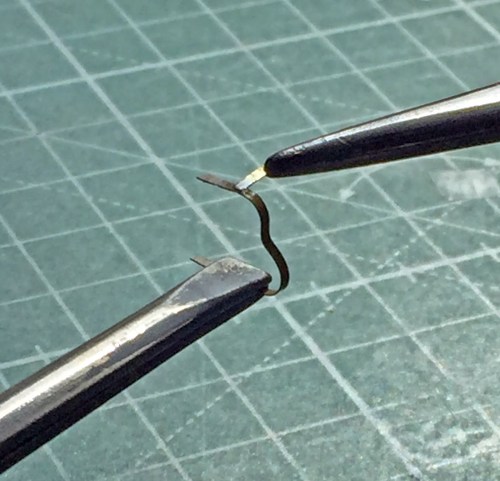 This kit provides a PE fret for the really tiny stuff, like headlight guards. The kit also provides a forming buck that the PE can be bent over! Nice touch! I annealed the brass before bending. I tried my best to solder the braces to the main hoop but that didn’t work at all, so I ended up resorting to superglue: