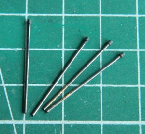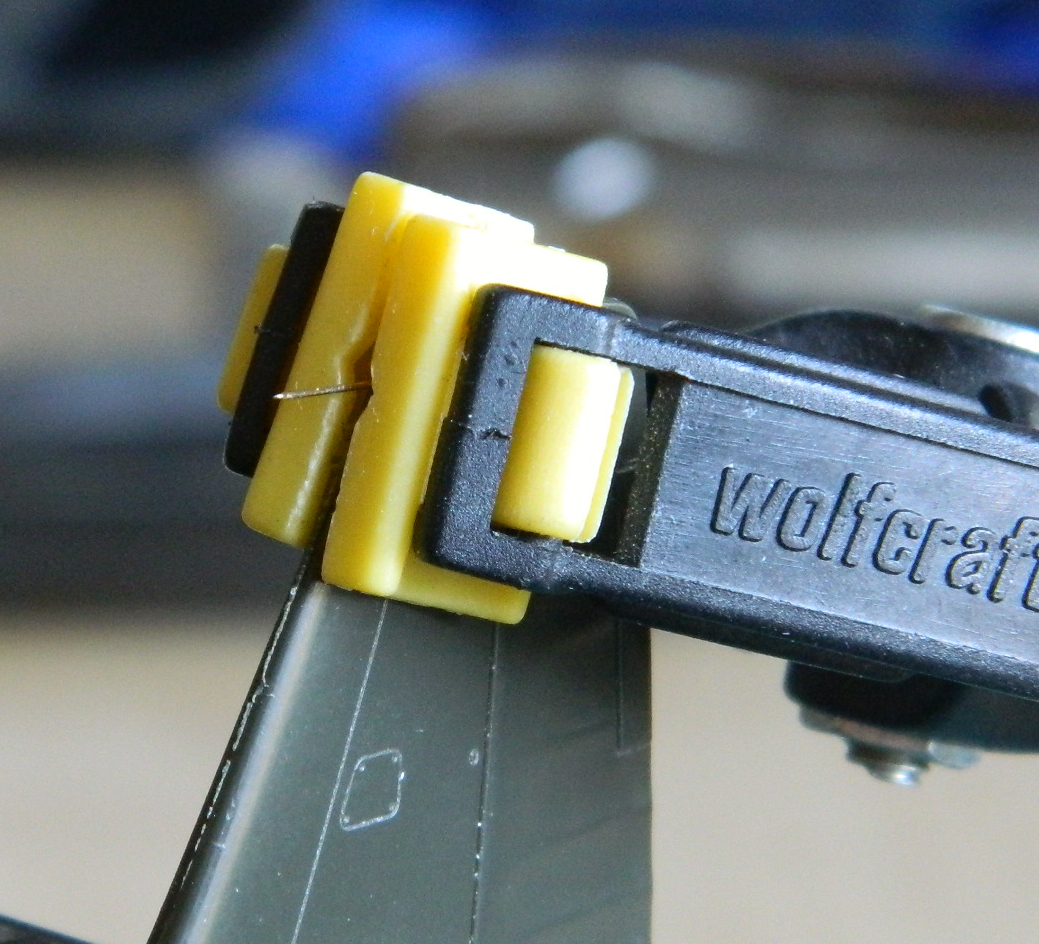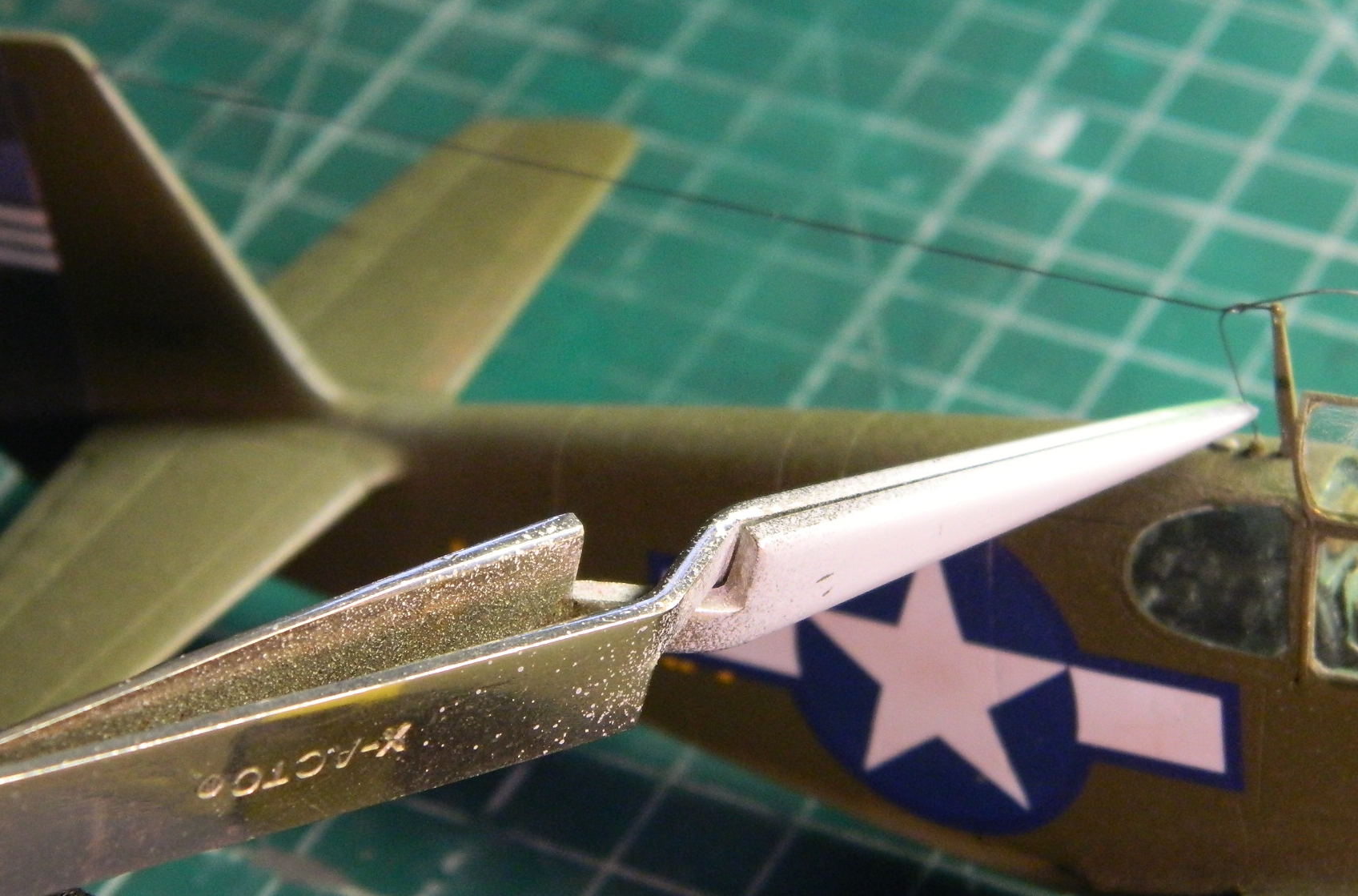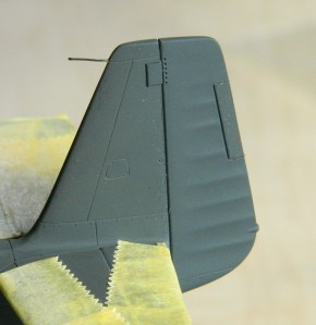 My usual method of doing antenna wires has been the classic stretched sprue “fun.” Time marches on (quoth the old fart in the mirror who is really surprised at the “old” part of that) and technology evolves. Rather than take the stretched sprue path (which isn’t really all that smooth and hassle free in general, and often very annoying in specific), I had a roll of EZ Line delivered (“fine,” .02″ (.508mm) black). I needed to drill out the tip of the antenna mast and vertical stabilizer to accept the line. In doing so, I discovered that the front upper half of the leading edge and about half the top of the vertical stabilizer hadn’t been glued! Easily fixed, and I added a small piece of stainless steel wire to keep the opening to socket the EZ Line into: