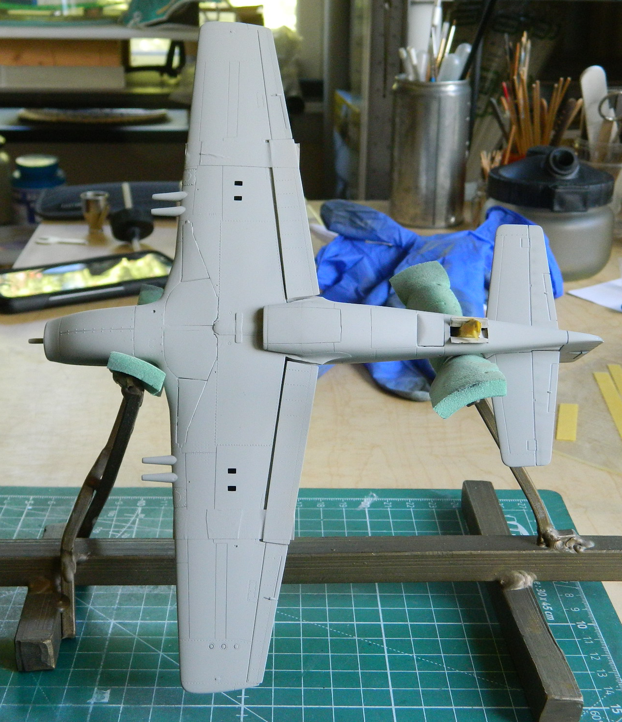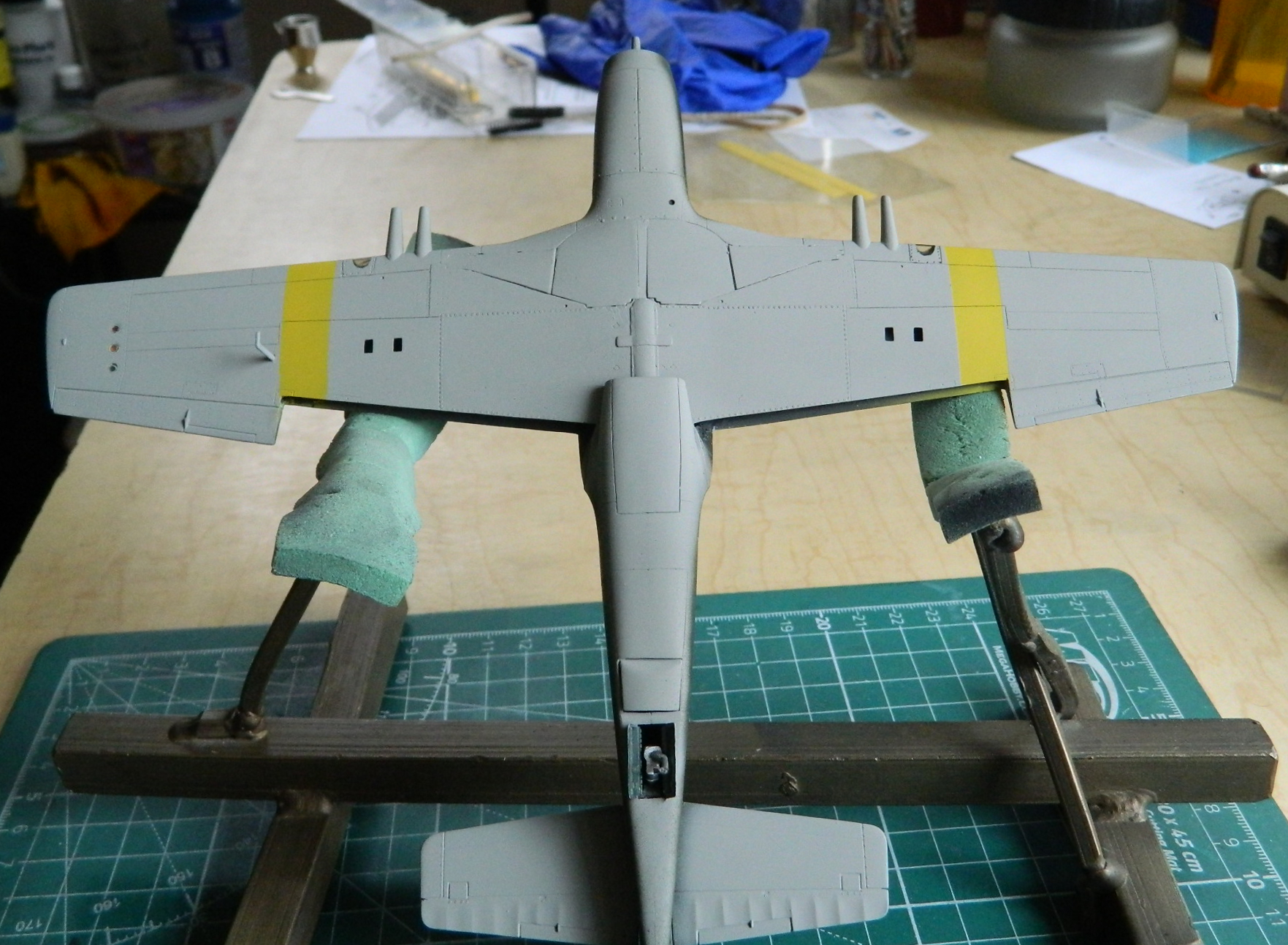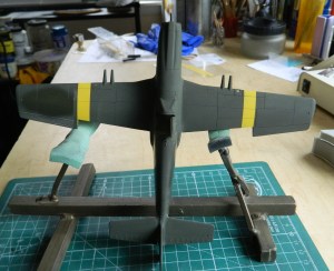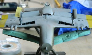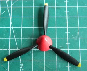 I wanted the gray to sit overnight before I turned it over for the OD Green. While that was set aside, I painted the prop and spinner (the previous day using Tamiya’s rattle can flat black TS-6 and the toned down yellow of the ID wing bands on the tips; the spinner was 4 parts Tamiya X-7 and 1 part XF-2 flat white), which is more satin anyway, (which is what I wanted ) and assembled them: