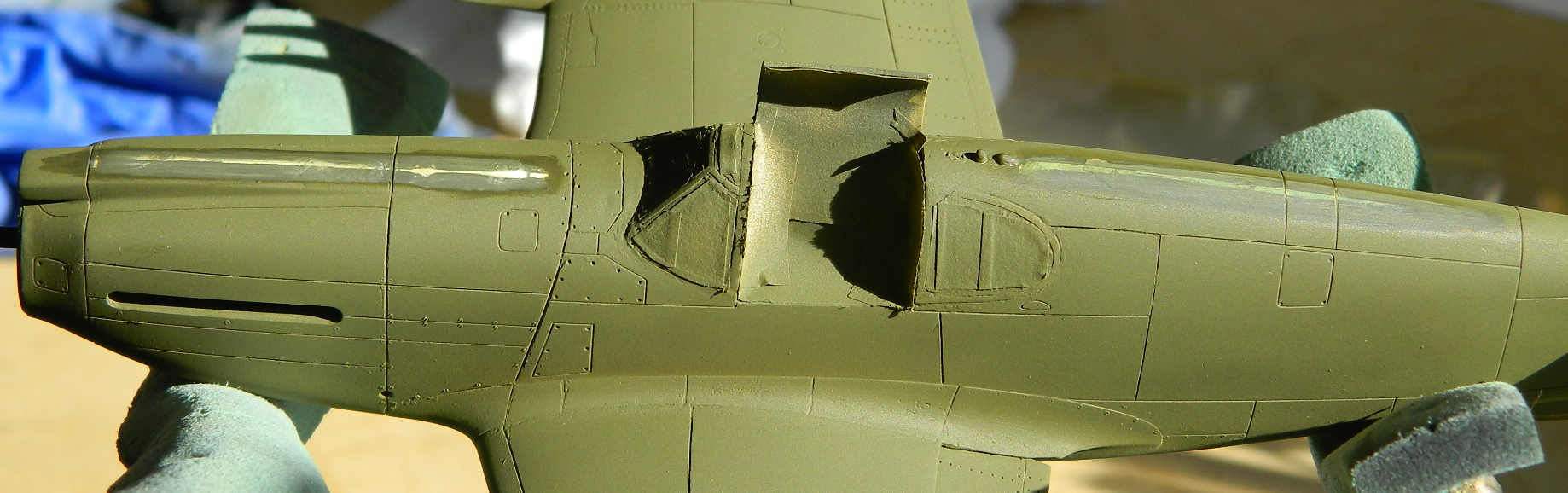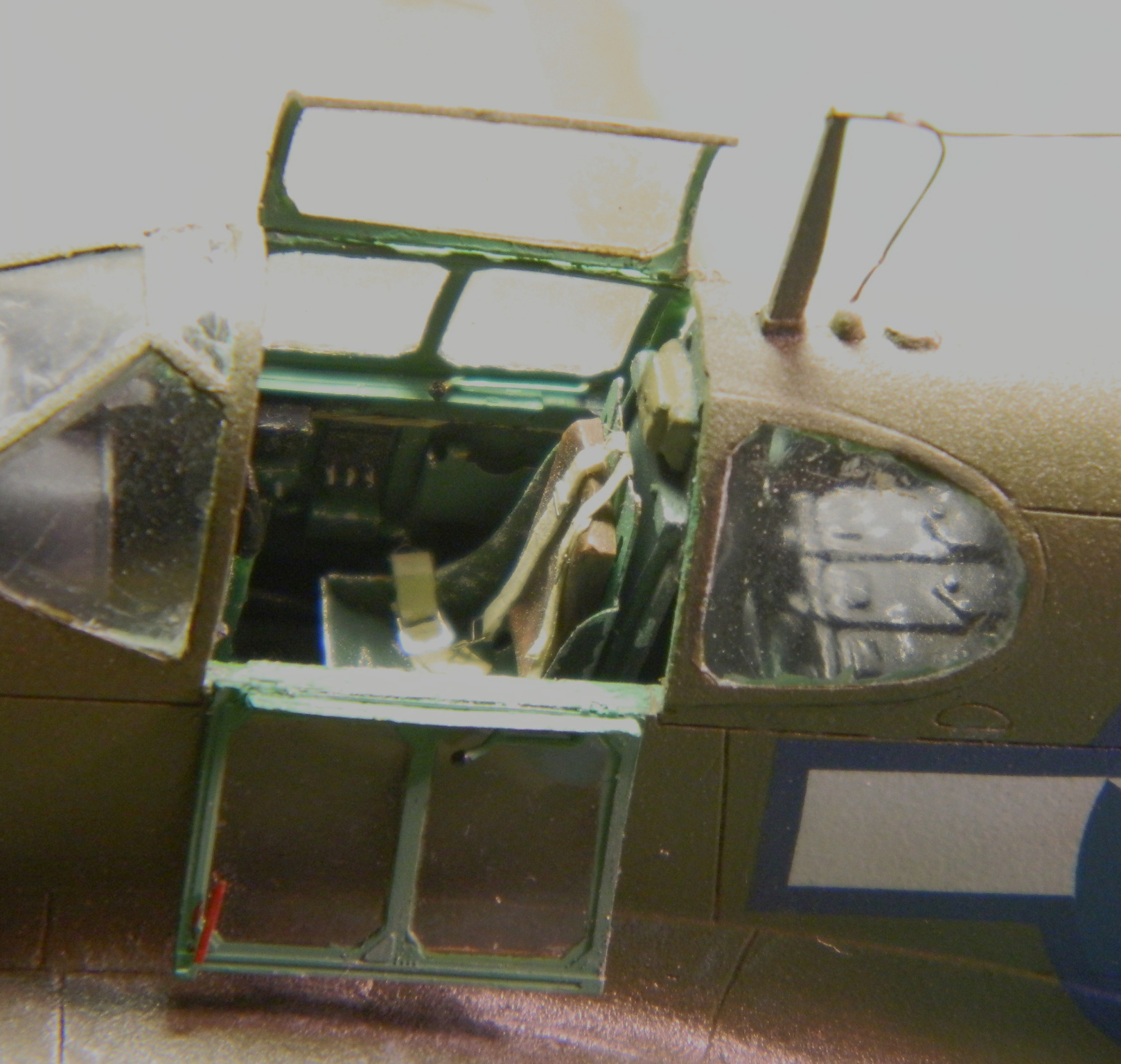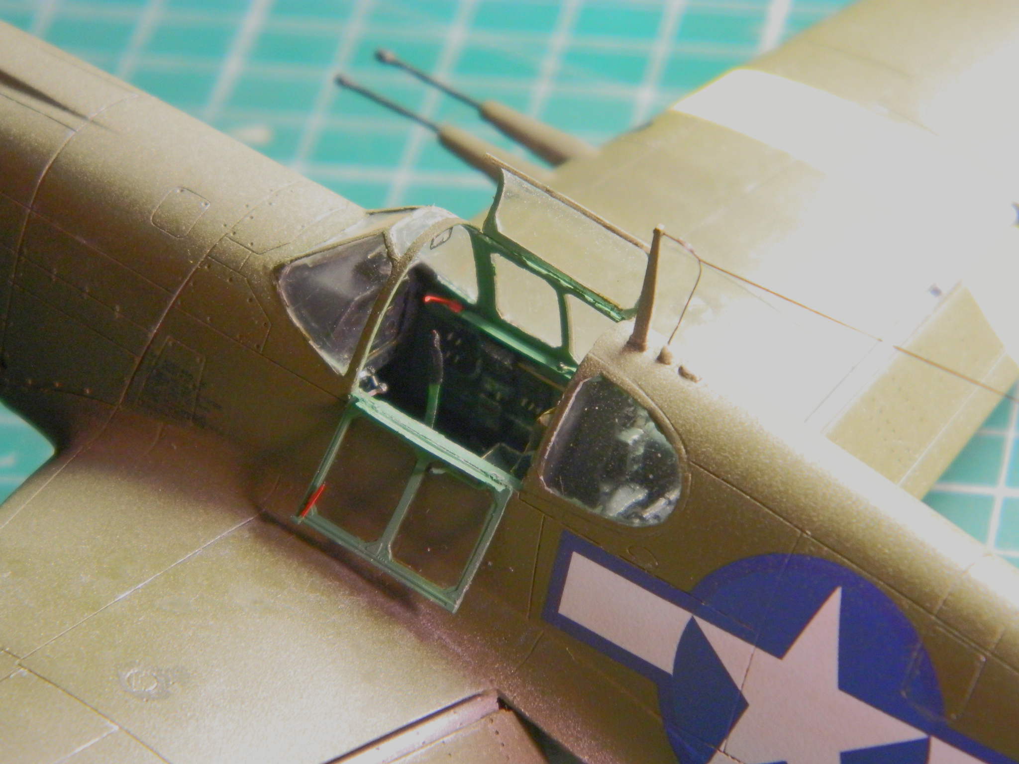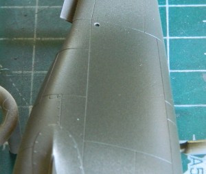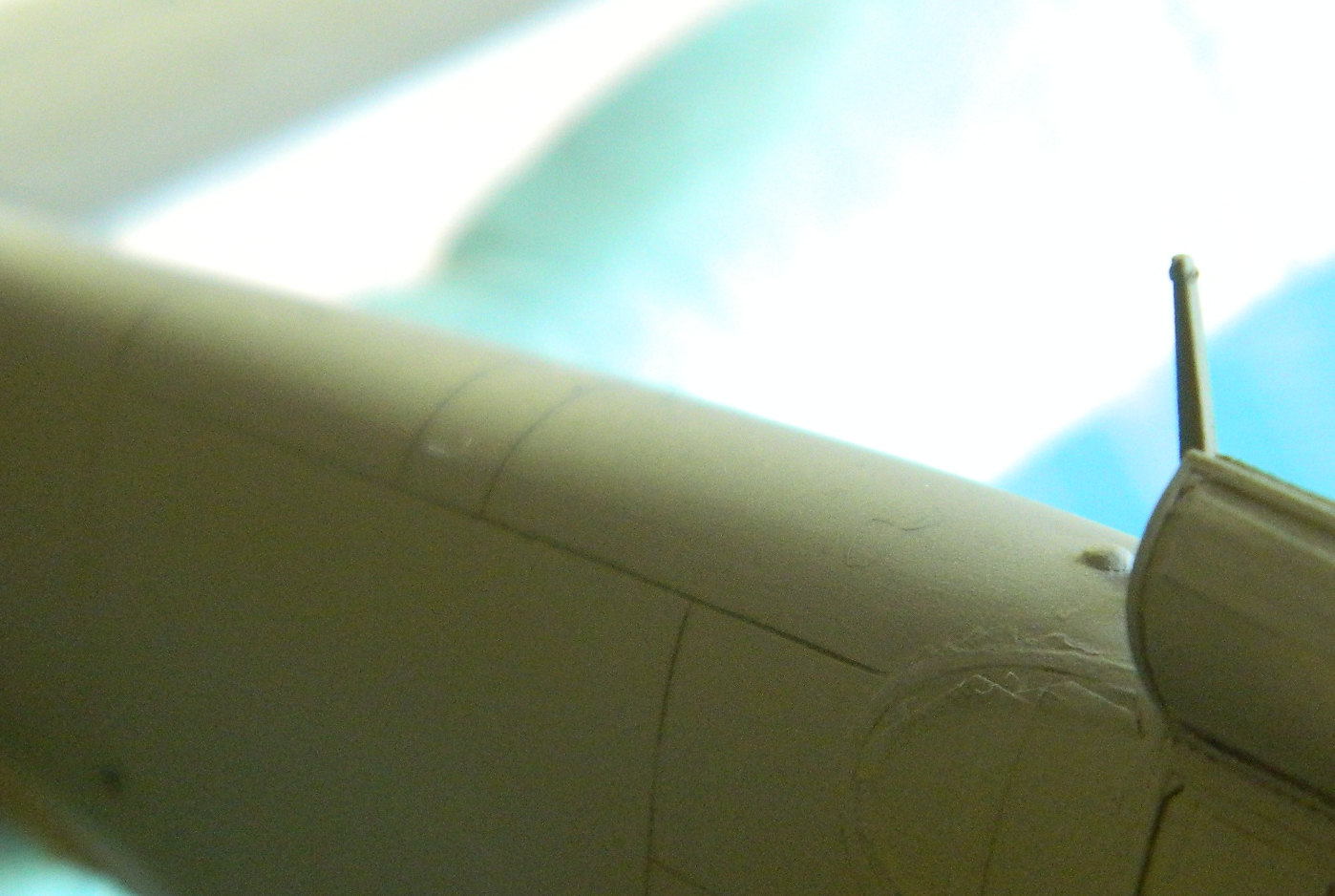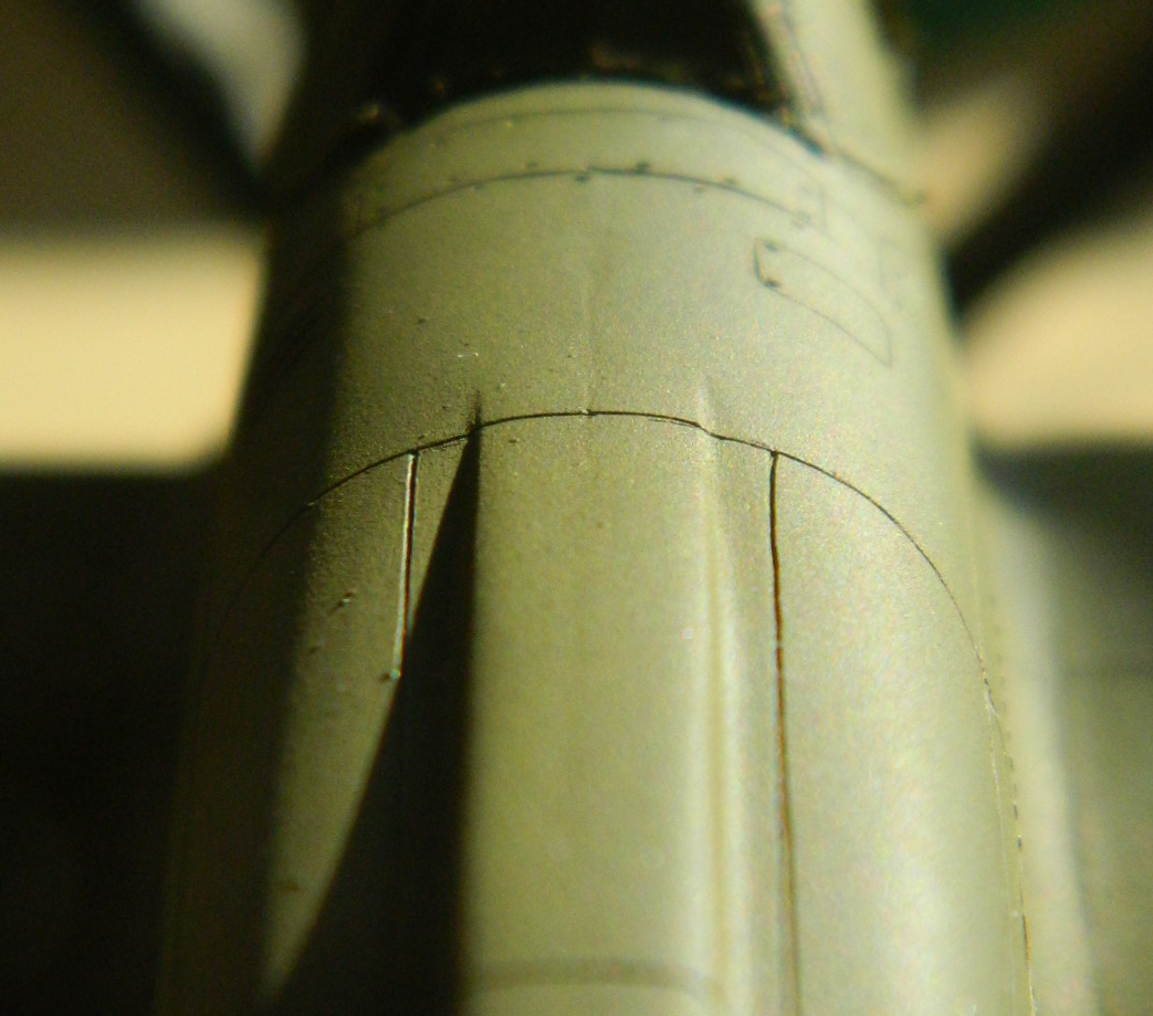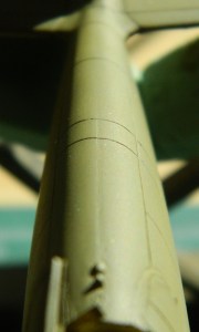 One of the other differences in the second paint job is the color. I noticed from a couple of WWII color photos that the Olive Drab was more green than the first Olive Drab I used. For the second painting, I mixed Olive Drab (6 parts) with Yellow (1 part) and Flat White (1 part). All looked okay until I looked at the fuselage seams in bright light. Either I had not done a proper job the first time (like that ever happens) or the denatured alcohol did more than just remove paint. Regardless of the cause, I found these two spots: