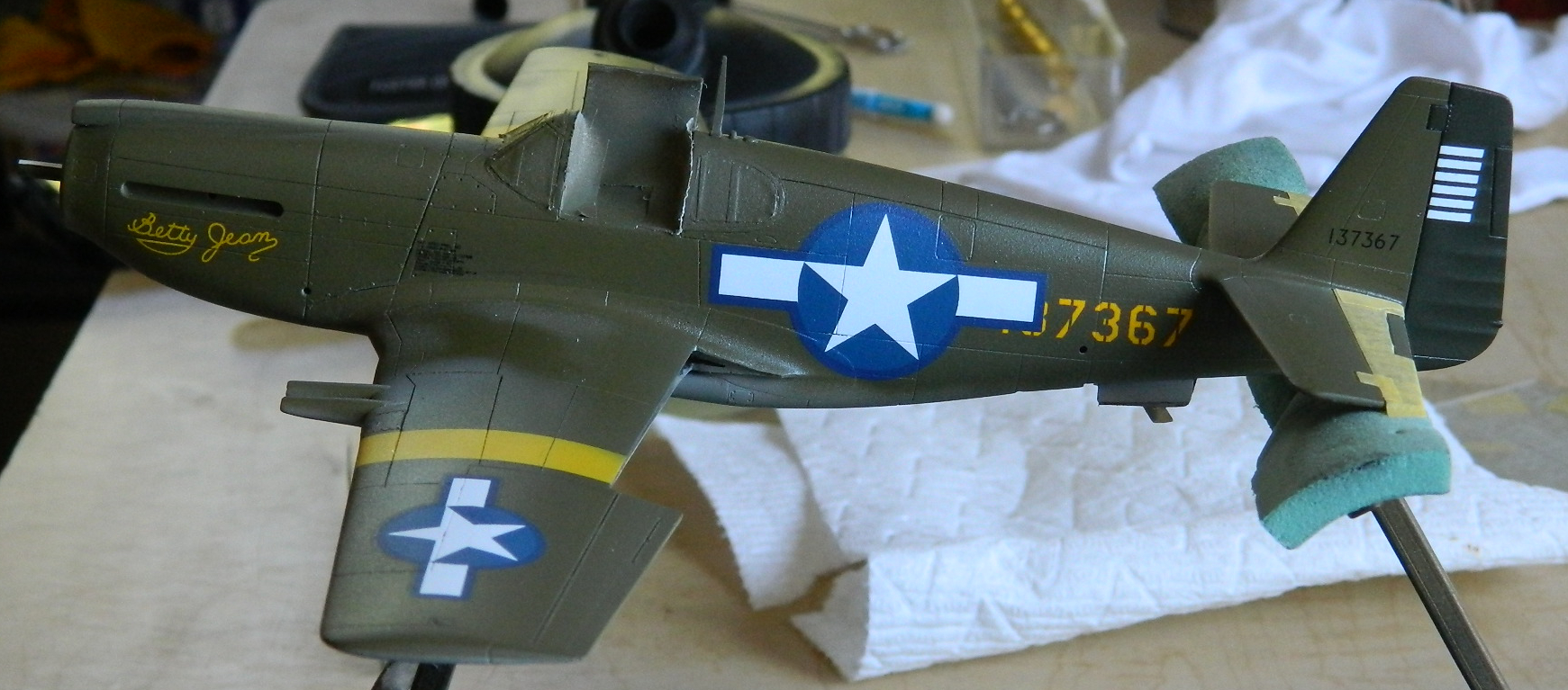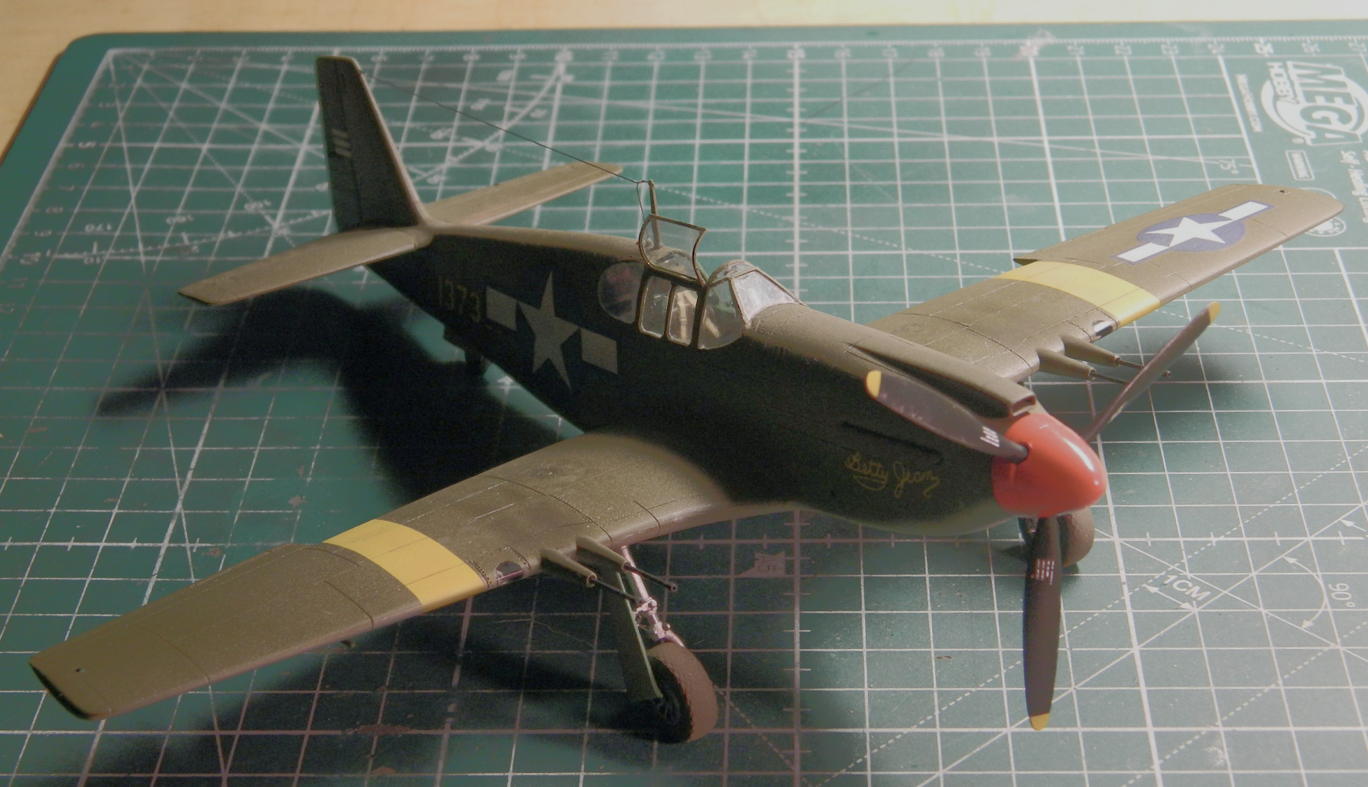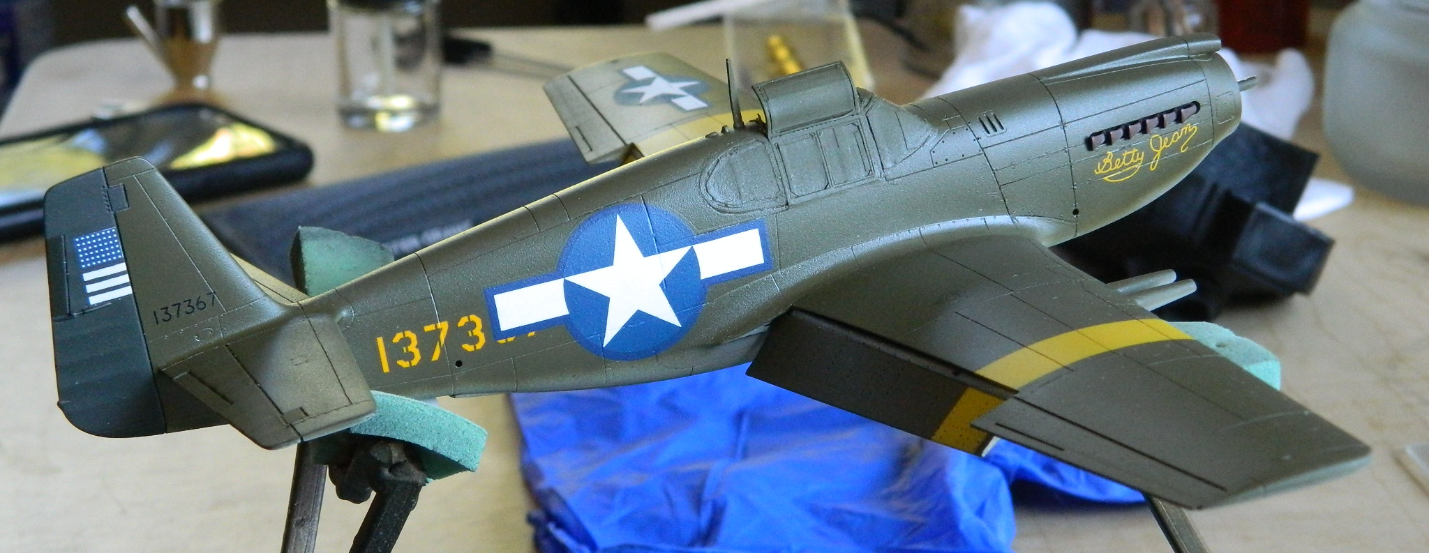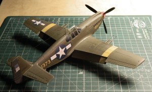 The one photo I have of this aircraft (from P-51 Mustang in Action, by Larry Davis; page 12) isn’t exactly conclusive as to color (no surprise since it’s a b/w photo) or tint (the rudder is deflected to the left and catches sunlight more directly). After unmasking the vertical stabilizer, I was unsure as to whether or not I’d gotten the difference right…something that would mostly fix itself shortly. (Ominous thunder on the soundtrack.)