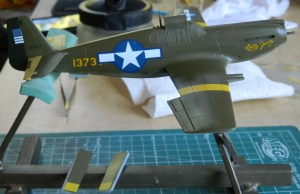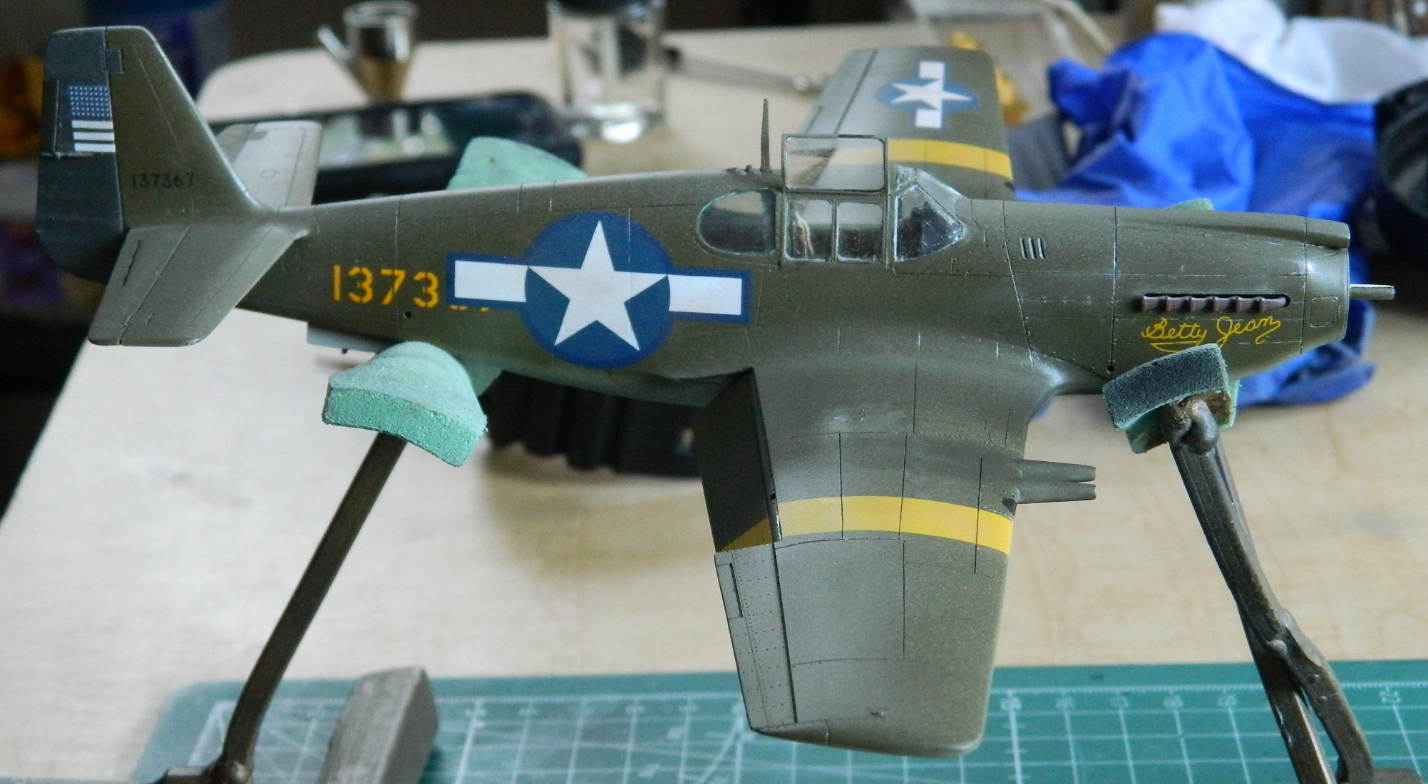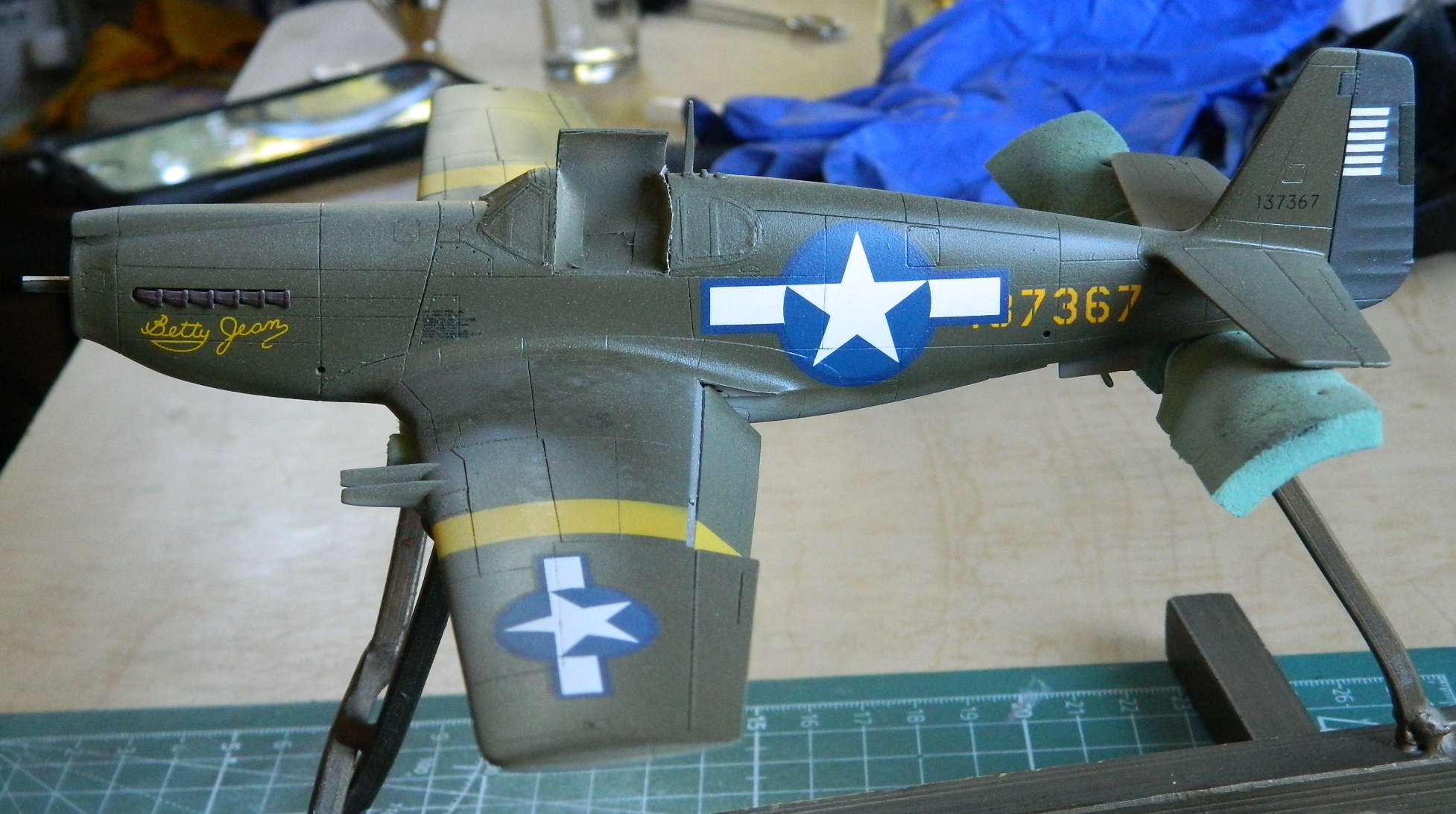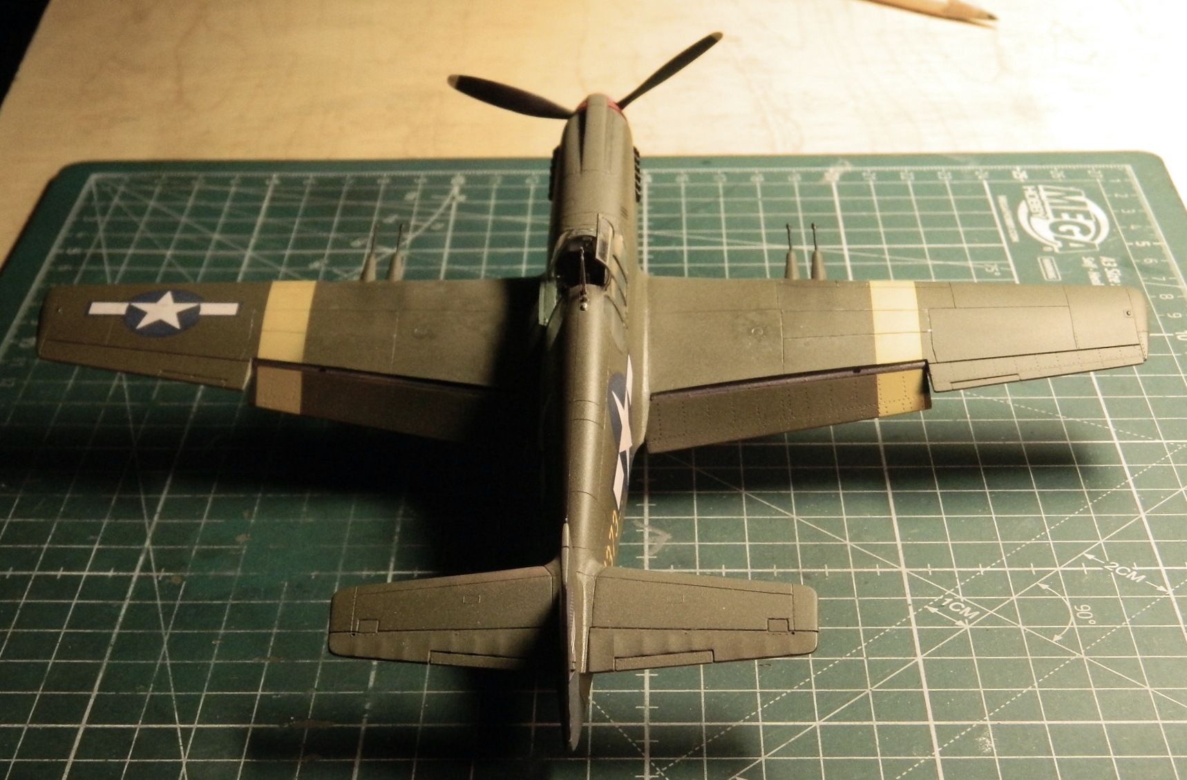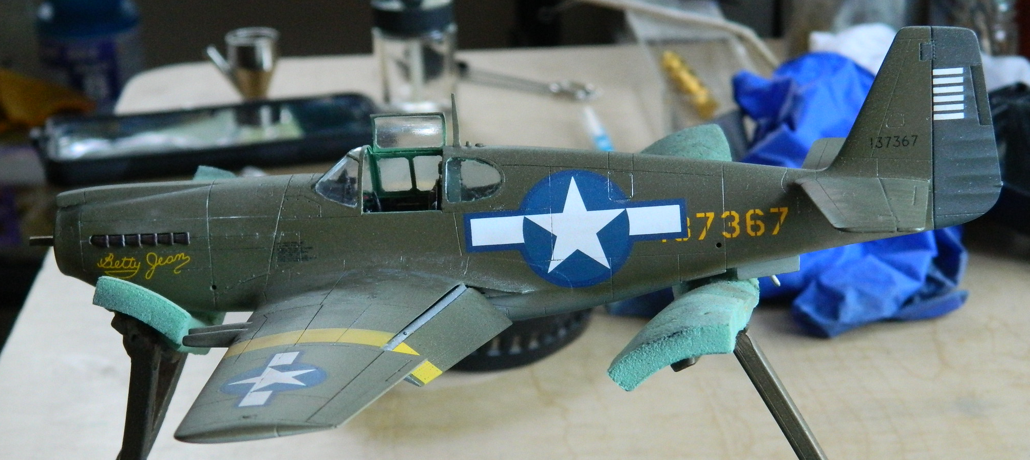The one photo I have of this aircraft (from P-51 Mustang in Action, by Larry Davis; page 12) isn’t exactly conclusive as to color (no surprise since it’s a b/w photo) or tint (the rudder is deflected to the left and catches sunlight more directly). After unmasking the vertical stabilizer, I was unsure as to whether or not I’d gotten the difference right…something that would mostly fix itself shortly. (Ominous thunder on the soundtrack.)