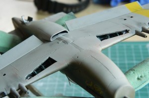 Again, after letting it sit overnight, I overshot the olive drab areas with semi gloss and then added the exhaust nozzles and flaps: