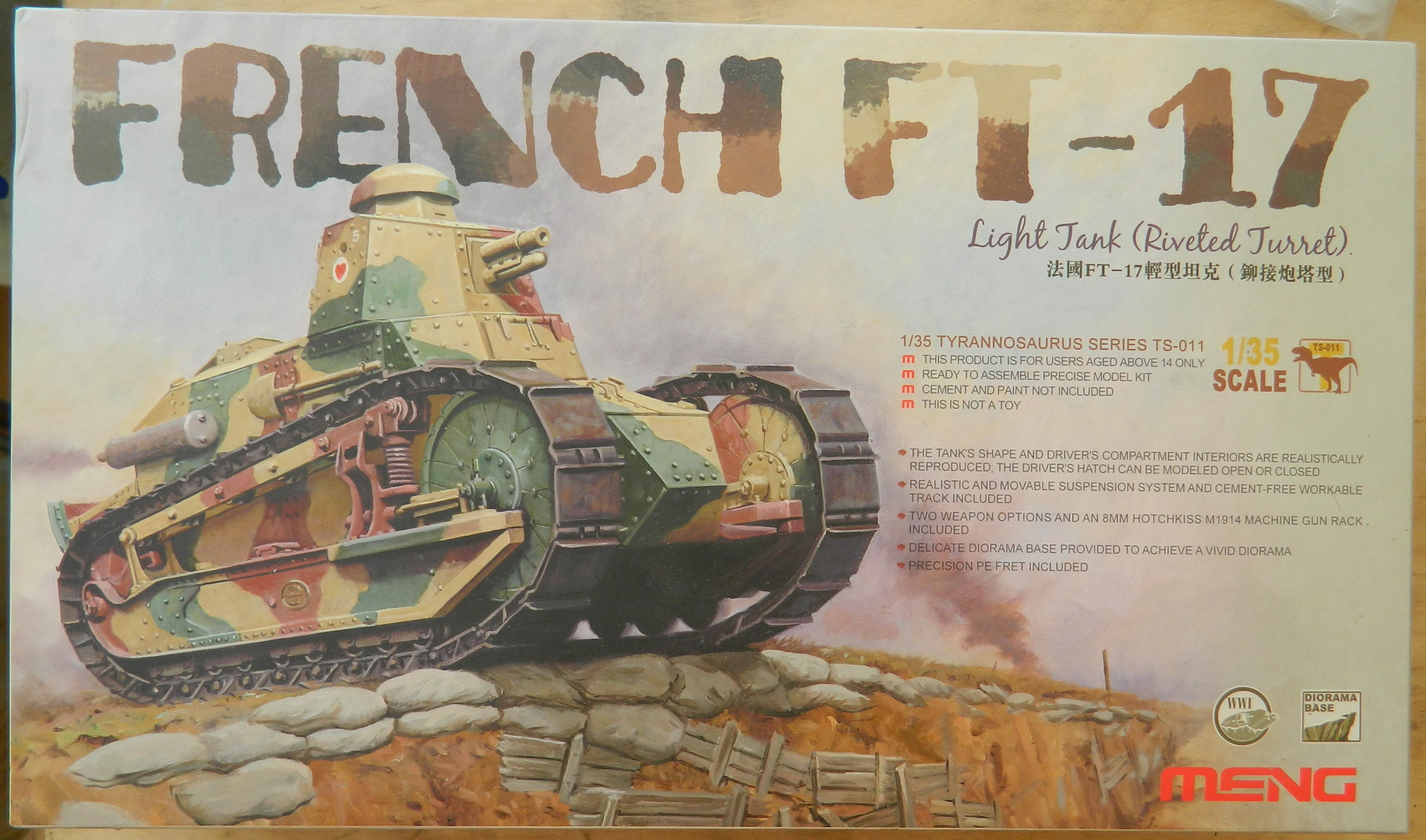 Meng makes two kits of the FT-17 in 1/35 scale. #TS-M008 (has an engine for the engine compartment) and #TS-011 (no engine). Since I didn’t want to model it with the engine compartment open, I’m building the TS-011 kit.