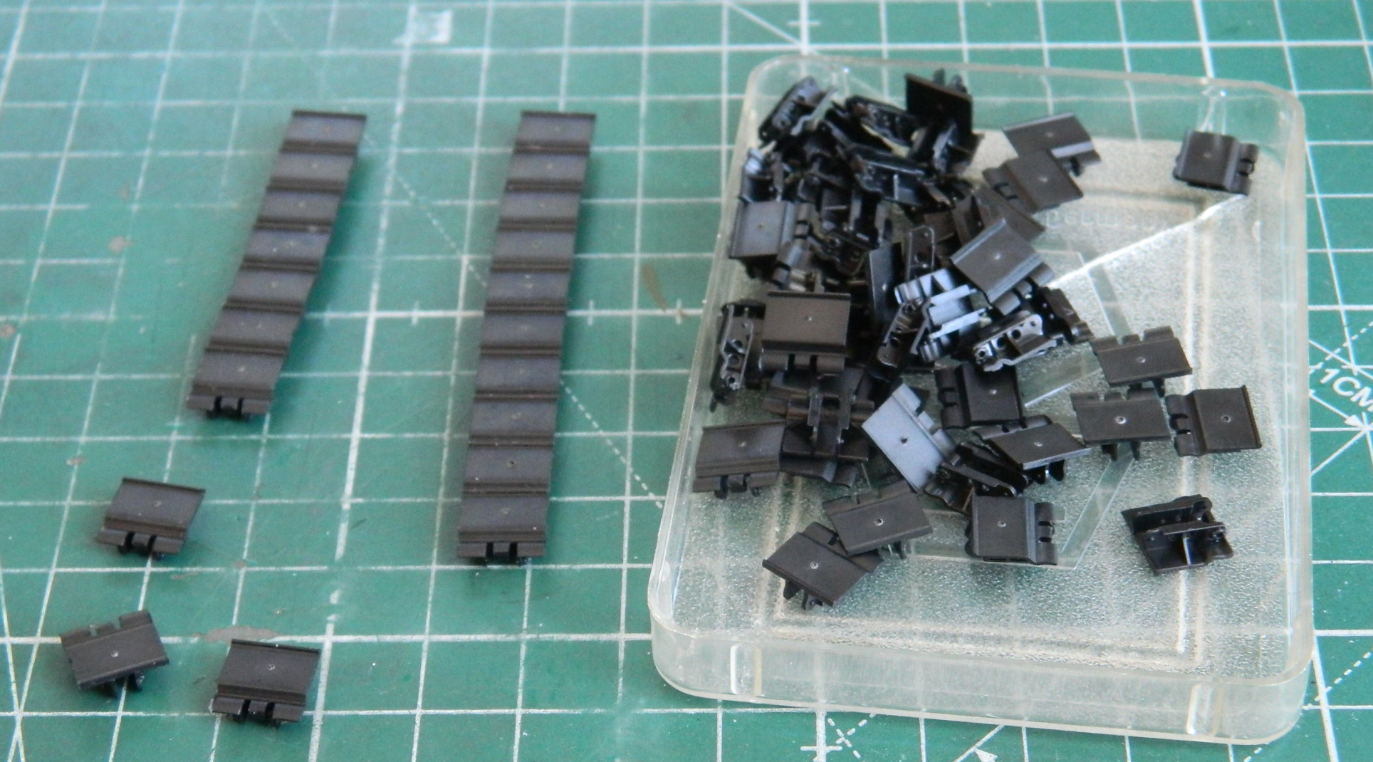 Since this has individual track links, I started by assembling them. I was going to do that with my new traditional method, assemble track links while having my tea and waiting for my brain to start functioning. They were so easy to assemble that rather than do ten a day, the second day I just finished them all; the instructions state there’s only 32 links per side. They were cleanly molded with only a few instances of flash. There is a nipple in the center of each link that needed to be sanded flat and a circular depression around the nipple that needed to be filled (the white dots you’ll see in the photo):