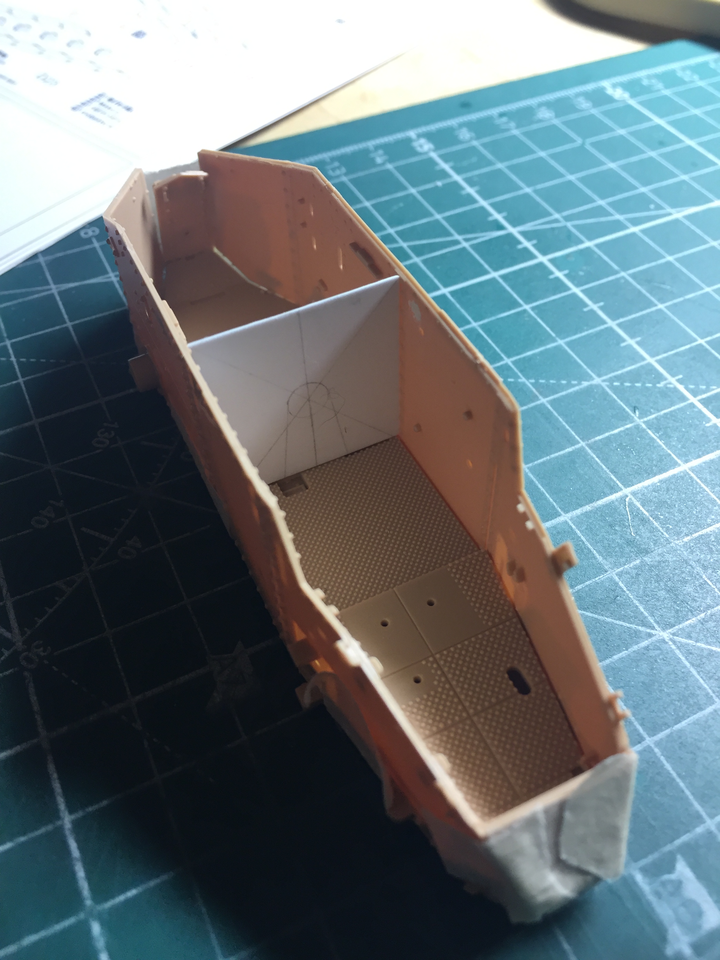 I actually considered buying another kit, the TS-008 kit with engine and missing interior parts. While thrashing about on the ‘Net, I found a firm in Australia that makes a PE update set that happens to include the ammunition and mine racks. Of course, there’s no mines OR ammunition included with the set. I’m guessing that I’ll have more than a few days to decide if I want to add the ammo and mines, and if so, just how the intercourse I’m going to. But in the meantime, I decided to make the bulkhead. That started with taping the sides of the hull and floor together so that I can fit .020″ (.508mm) styrene to make the basic bulkhead: