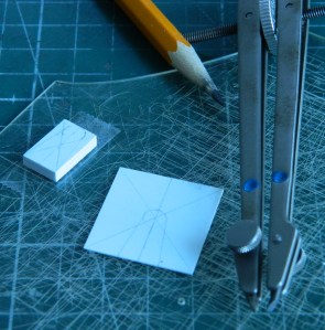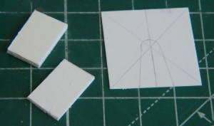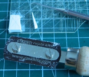 There is a protrusion on the bulkhead with details. One of the details is the crank used to start the engine. The other detail I have no idea what it is and I haven’t found any reference photos that will tell me (my suspicion is that it’s part of the transmission), but since it’s there and visible, I make the attempt to include it. First, let’s start with the bulge itself. After laying out the design on the .020″ (.508mm) that will become the bulkhead, I used .080″ (2.032mm) and .040″ (1.016mm) scrap styrene and bonded them together: