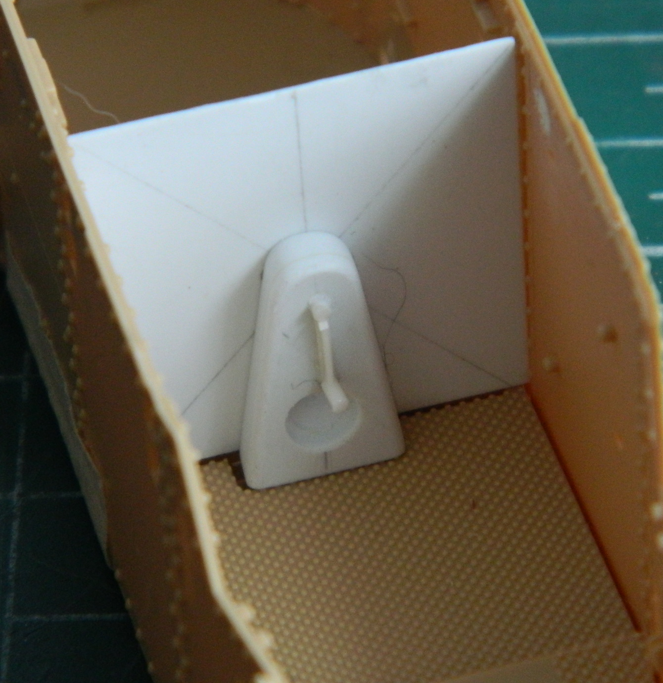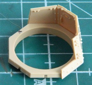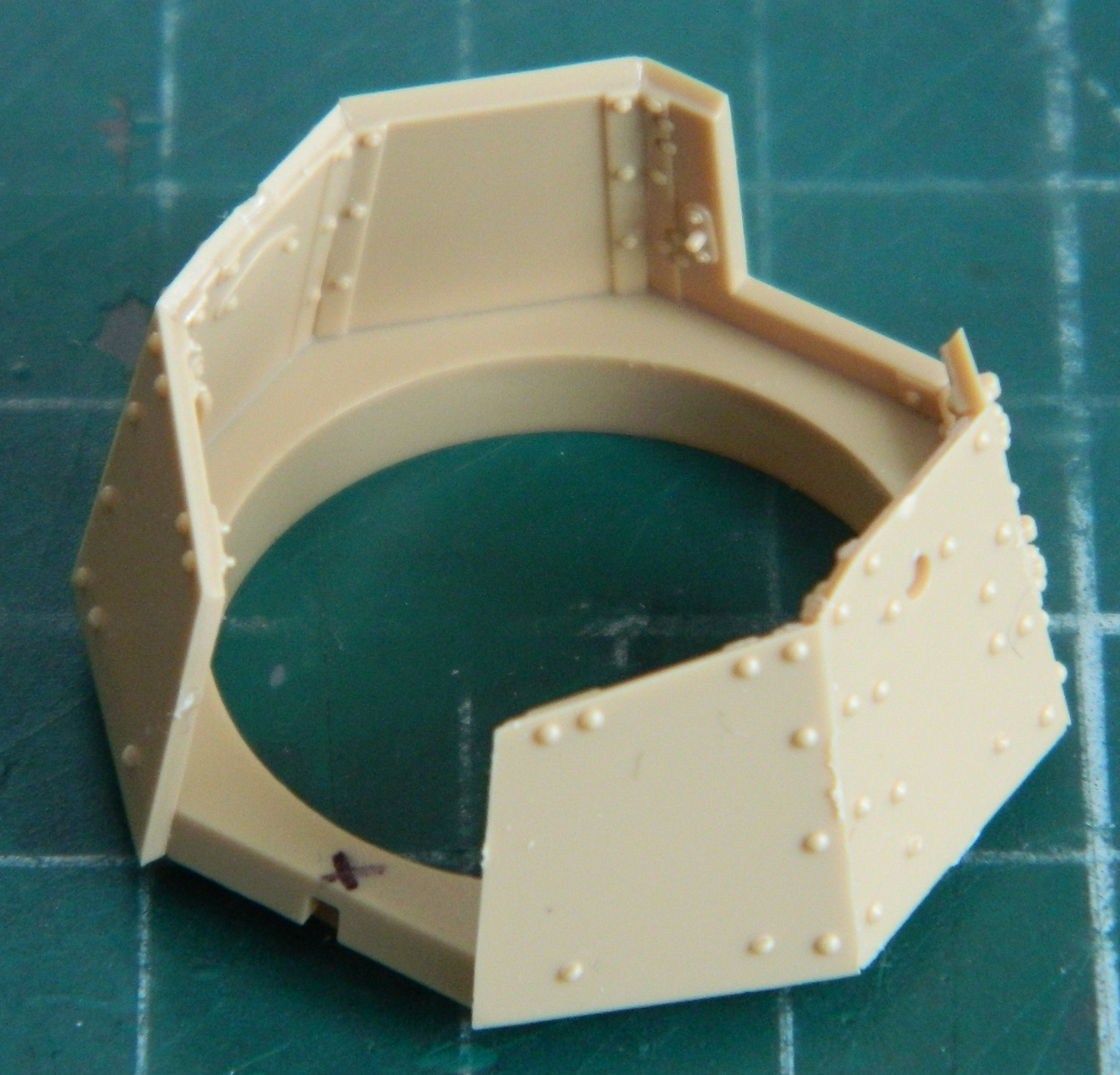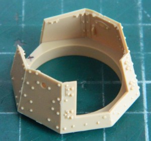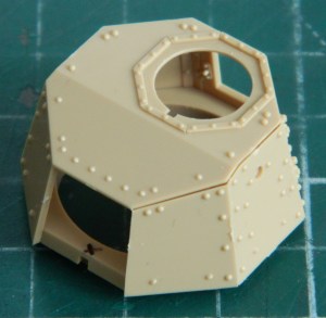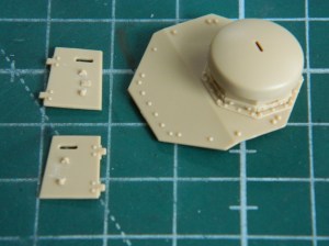 I added the “mushroom cap” hatch to the turret top and removed molded-on location marks on the inside faces of the turret’s doors to add more lead foil “straps” later: