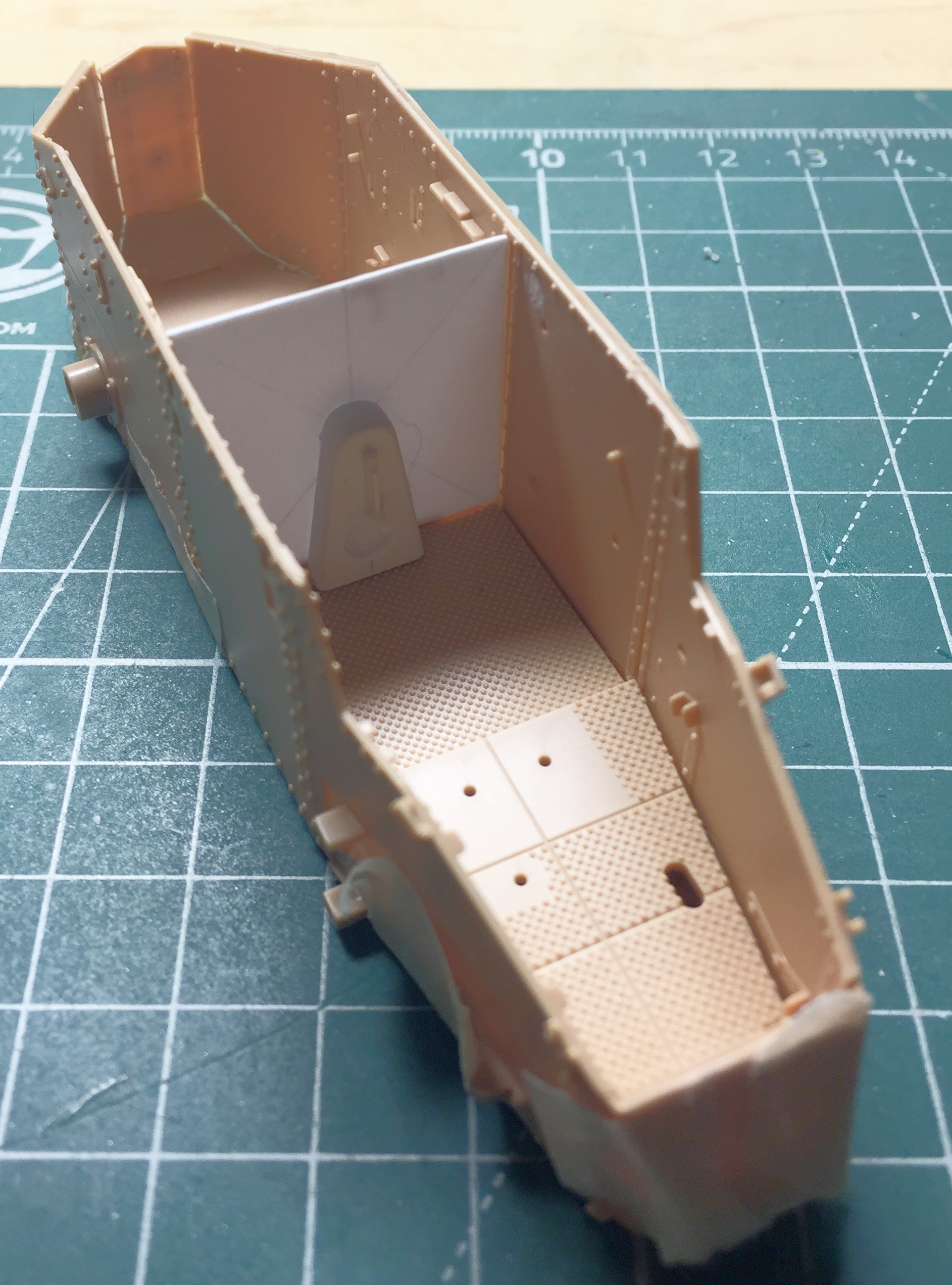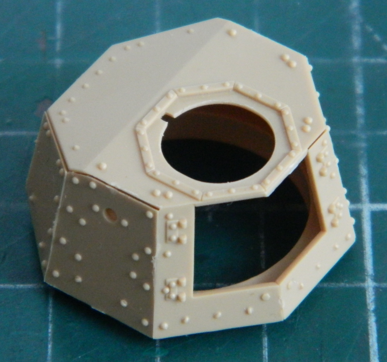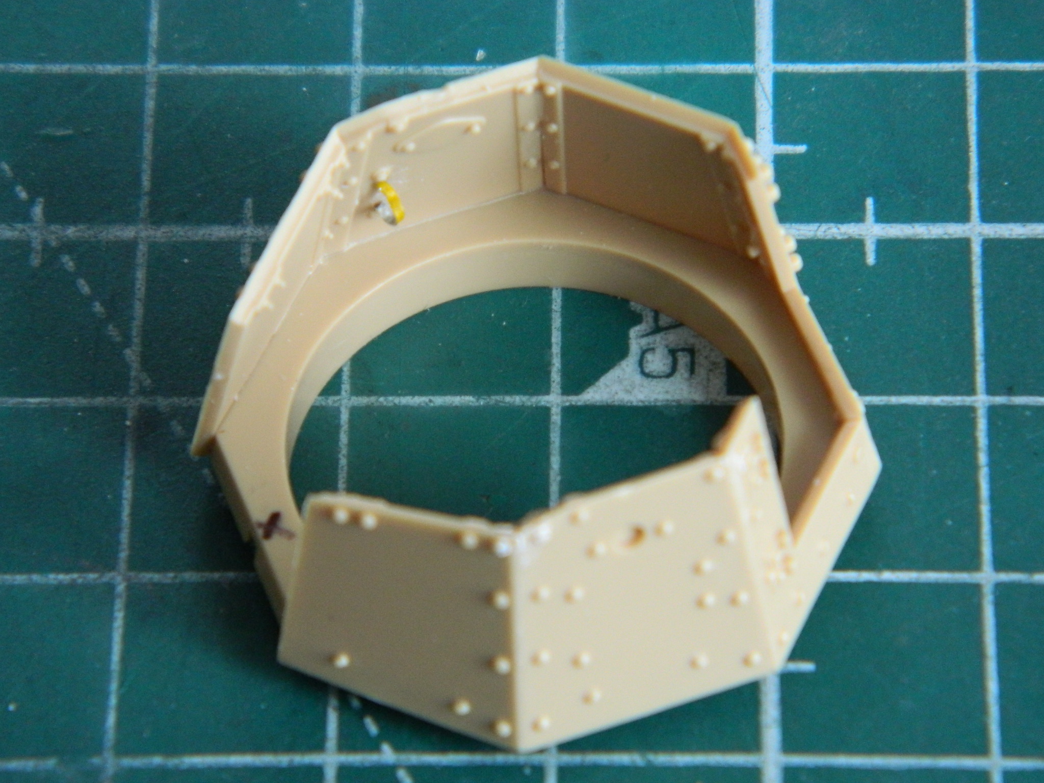 I added the “mushroom cap” hatch to the turret top and removed molded-on location marks on the inside faces of the turret’s doors to add more lead foil “straps” later: