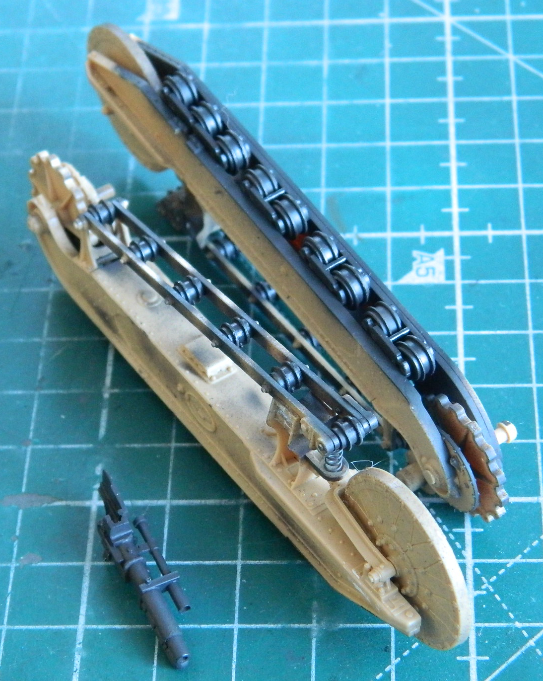 I mixed a batch of my home-brewed “gunmetal” paint (5 parts Tamiya X-18 Semi Gloss Black and 4 parts Tamiya XF-20 Medium Gray) and painted the gun and all the suspension wheels: