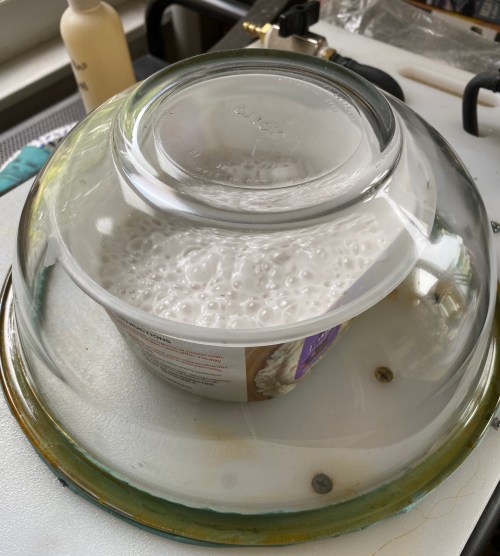 If you will need to degass something to make a mold of it, make sure that thing is solid. It matters less what the thing being molded is made of (as long as it’s not super-porous like a marshmallow is), but it certainly matters if there are air pockets inside it. Guess what happens if there are air pockets inside it and it’s then exposed to vacuum.