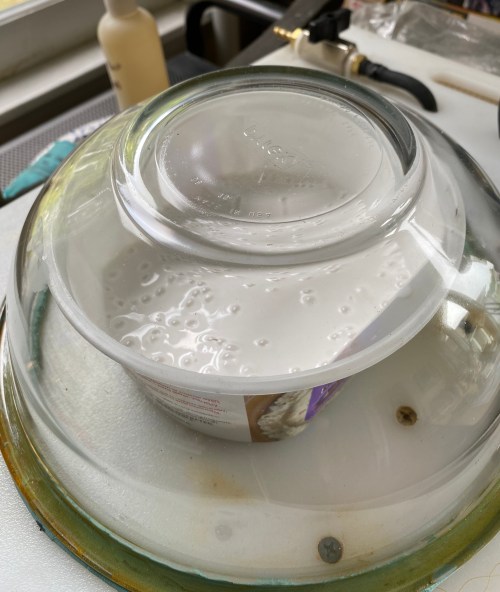 Resin is a different beast than rubber. Rubber molds require degassing (regardless of what the manufacturer will sometimes state to the contrary). If the rubber compound generates heat (if I’m being fancy I’ll call that property “exothermic”), it’s so little that I have never noticed. Resin is a different beast! It is obviously exothermic. I had an “interesting” experience the first time I mixed resin. The result looked more like a medium to support bubbles and nothing like something that wasn’t supposed to have any bubbles. So I blithely degassed it.