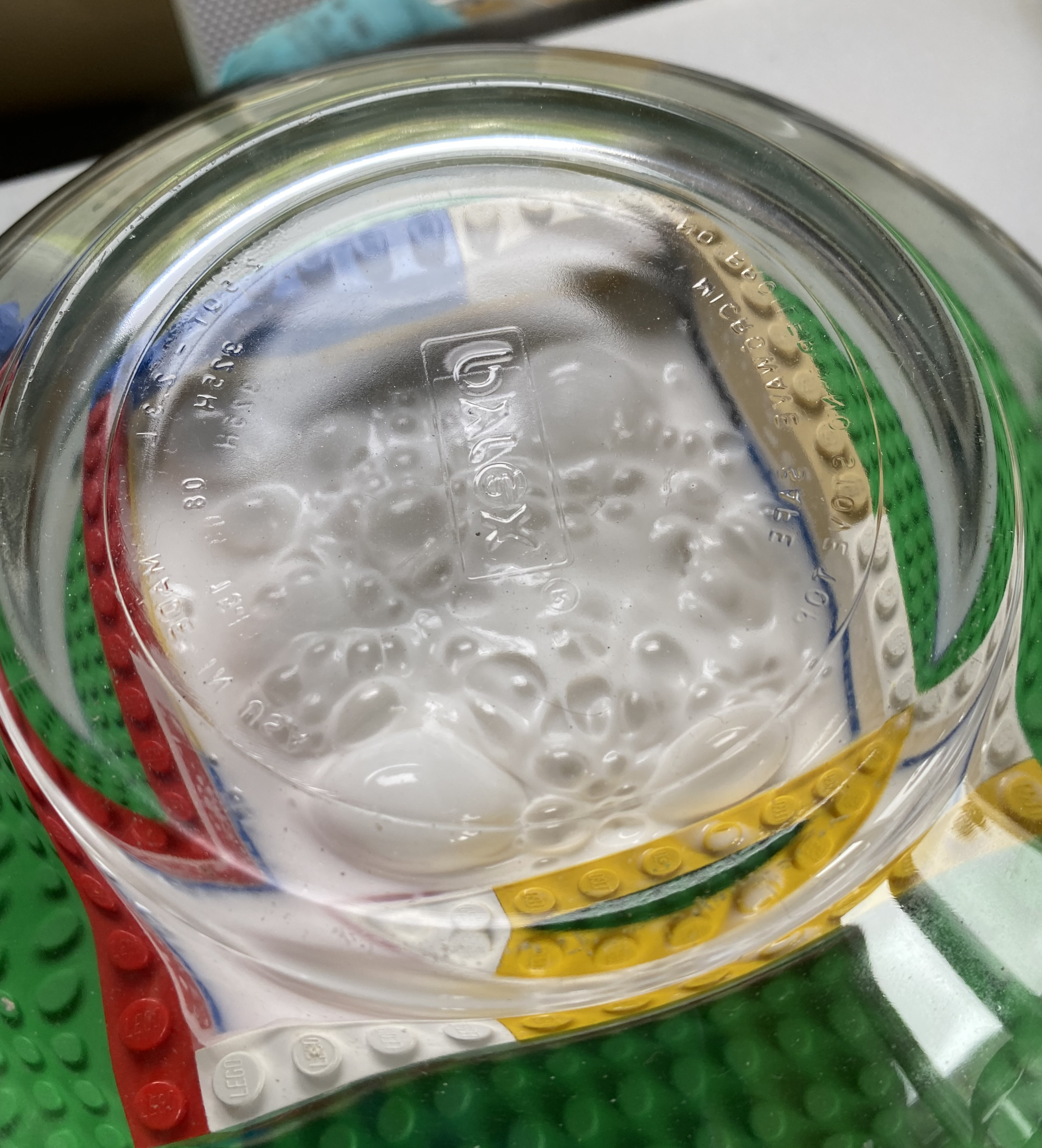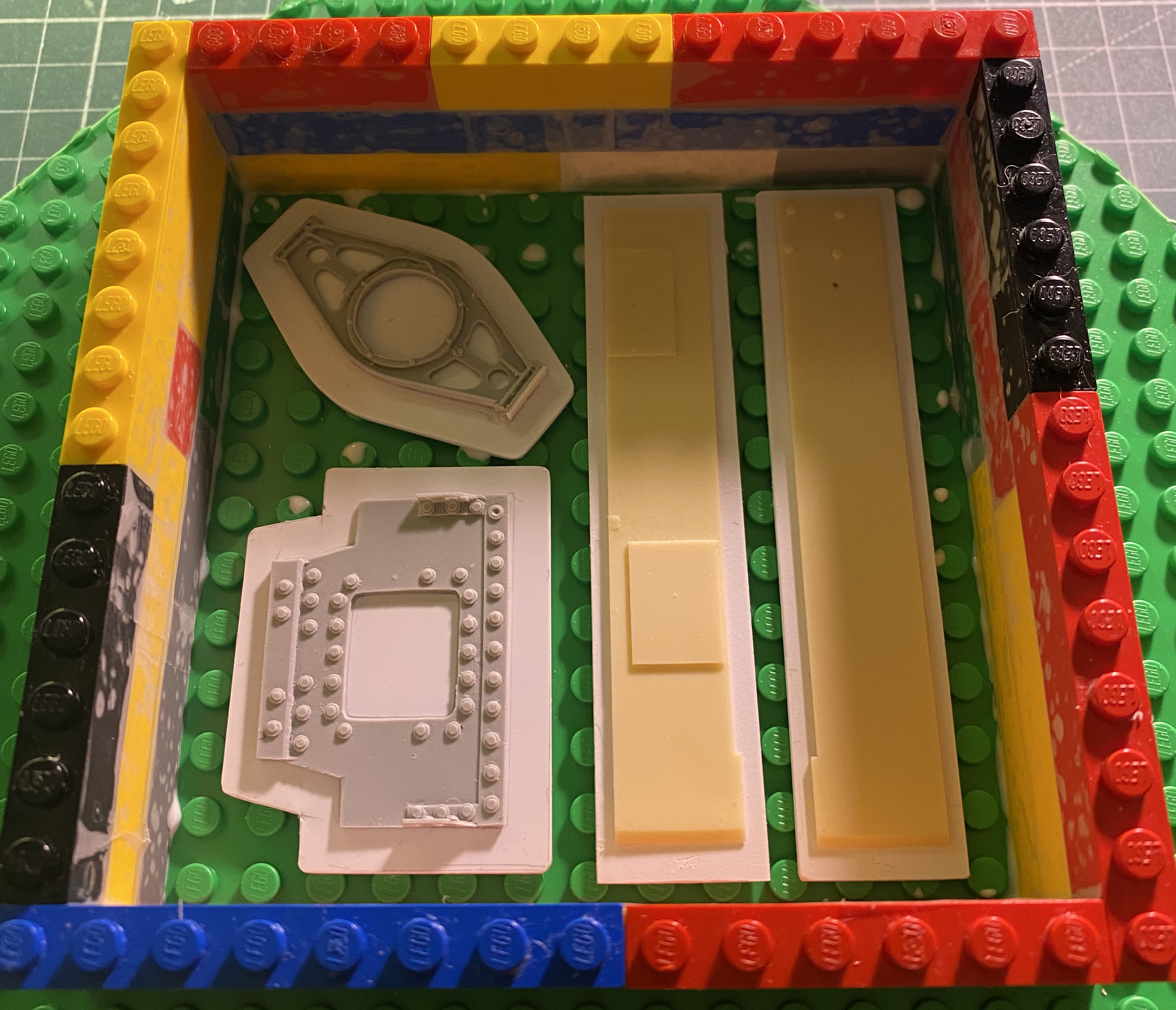 If I don’t attach the parts I’m copying to the base-plate they will float (which you will see evidence of shortly). I use white glue (PVA, if I’m showing off) to temporarily attach parts to the base-plate. And because the rubber will seep through any gap, no matter how small, and continue to seep through said gaps until it hardens (4 hours, y’know), it’s possible to have all the rubber seep out of the mold. Two pounds (0.91KGs) of the rubber costs me about $75 dollars (forget currency conversions, you’re fortunate enough that I convert Imperial size to Metric, so don’t get pushy) and wasting any of it doth vex me most puissantly. Look at the photo above. You will see gaps between the blocks. I line the inside of all my Lego mold boxes with “scotch tape” to block the rubber from seeping out. However, I also make a gasket of PVA (or white glue if I don’t care what you think) around the outer edges of all the blocks that come in contact with the base plate to form a seal. I have learned to let this seemingly pour-ready mold box sit overnight so that the glue (whatever I call it for whatever reason) will set up as well as it can. Here is a Lego mold box all sealed and ready: