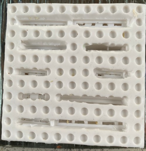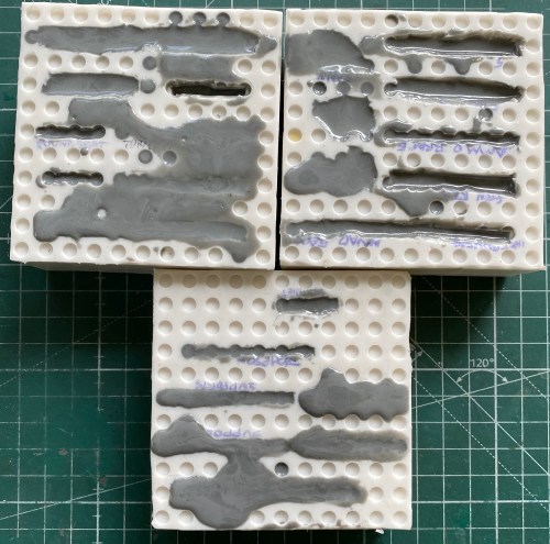 The lighter areas are thin places in the rubber. The really light areas are holes. I patched the holes with discarded rubber bits from previous molds and when I poured the last mold I needed to I dribbled a bit of the excess rubber over the patches hoping that this would render the mold usable to an acceptable degree. Finally I got something right and the mold is usable.