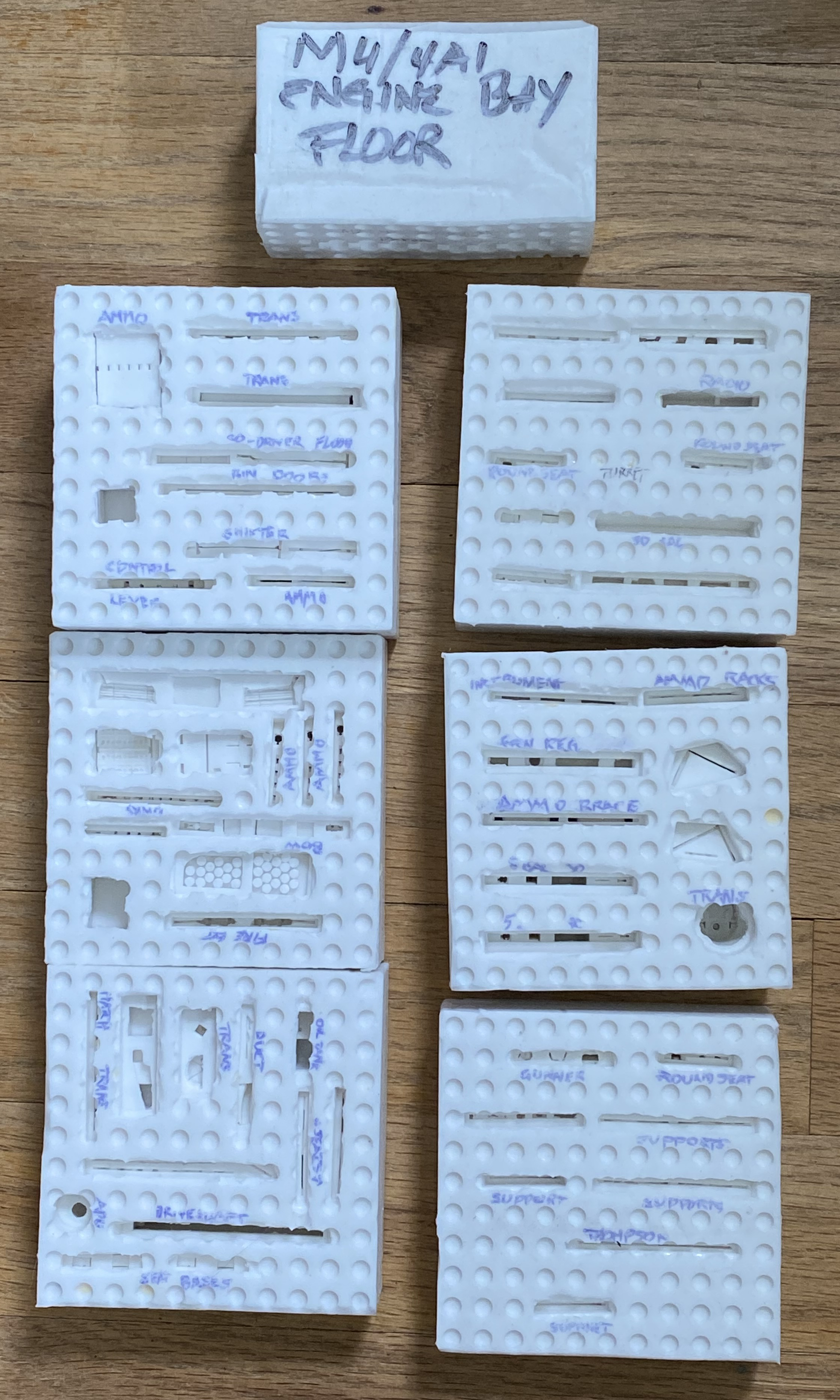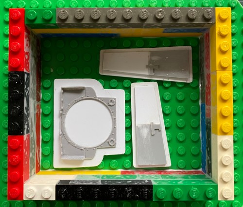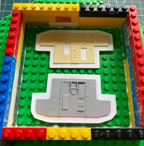 The molding compound isn’t the most expensive thing I’ve tossed shekels at but, being a parsimonious git, I hate wasting money. I want to get as many molds as I can out of the stuff. Because I really cannot use 5 gallons of the stuff before it goes off (yep…it’s got a shelf life), I buy the molding rubber compound in two pound (0.91KGs) lots. I also use modified Lego blocks and base to construct my mold boxes, so I have a mock-up that lets me, well, mock up how the mold will be laid out. To maximize molds with the minimum amount of rubber, I molded turret parts and crew compartment parts at the same time (and a few years from now when it comes time to make more of these parts I’m going to have SO much fun figuring out where what is…clever of me, eh?):
