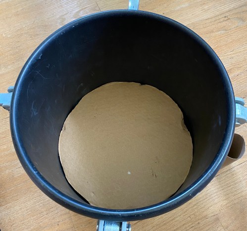 The bottom of the pressure pot inside is concave and I need it to be flat. I took a piece of laminated cardboard and made a base that would give me the level surface I needed (because resin starts as a liquid and tilting a liquid-filled container doesn’t allow the liquid to stay in the container):