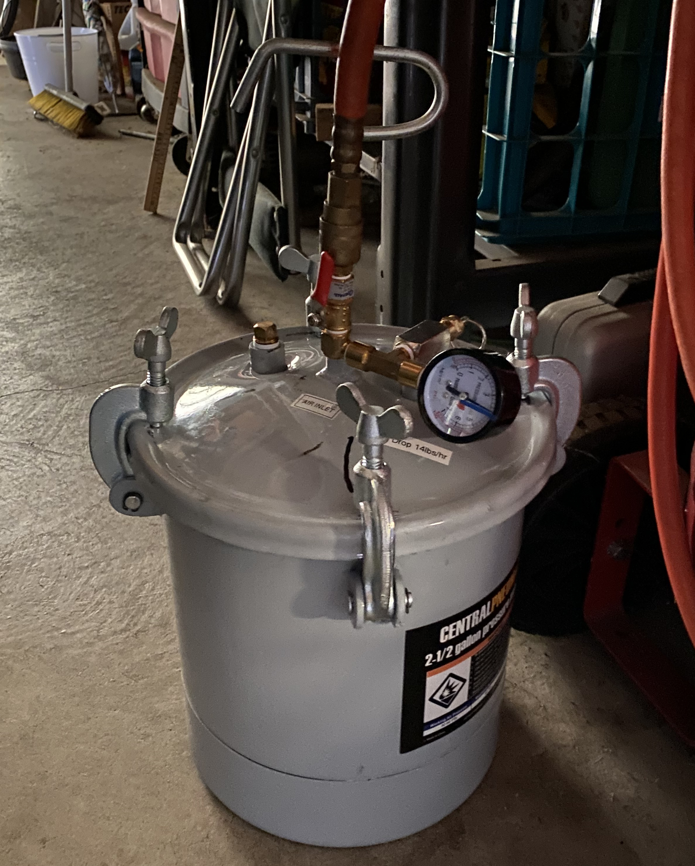 There are pressure pots intended for portable paint spraying. Paint fills the pot, the lid is clamped down, and the pot is pressurized, the hose and the spray gun are attached (think big spray can). But if one removes the siphon tube and plugs the lid, now that pressure pot can be used to pressure cast resin. I used the supplied pressure gauge, plugged the siphon hole with a brass plug, fitted a T-fitting so that I could attach the hose, and a valve to release the pressure slowly, to the over-pressure safety valve (set to blow off at 55 lbs.):