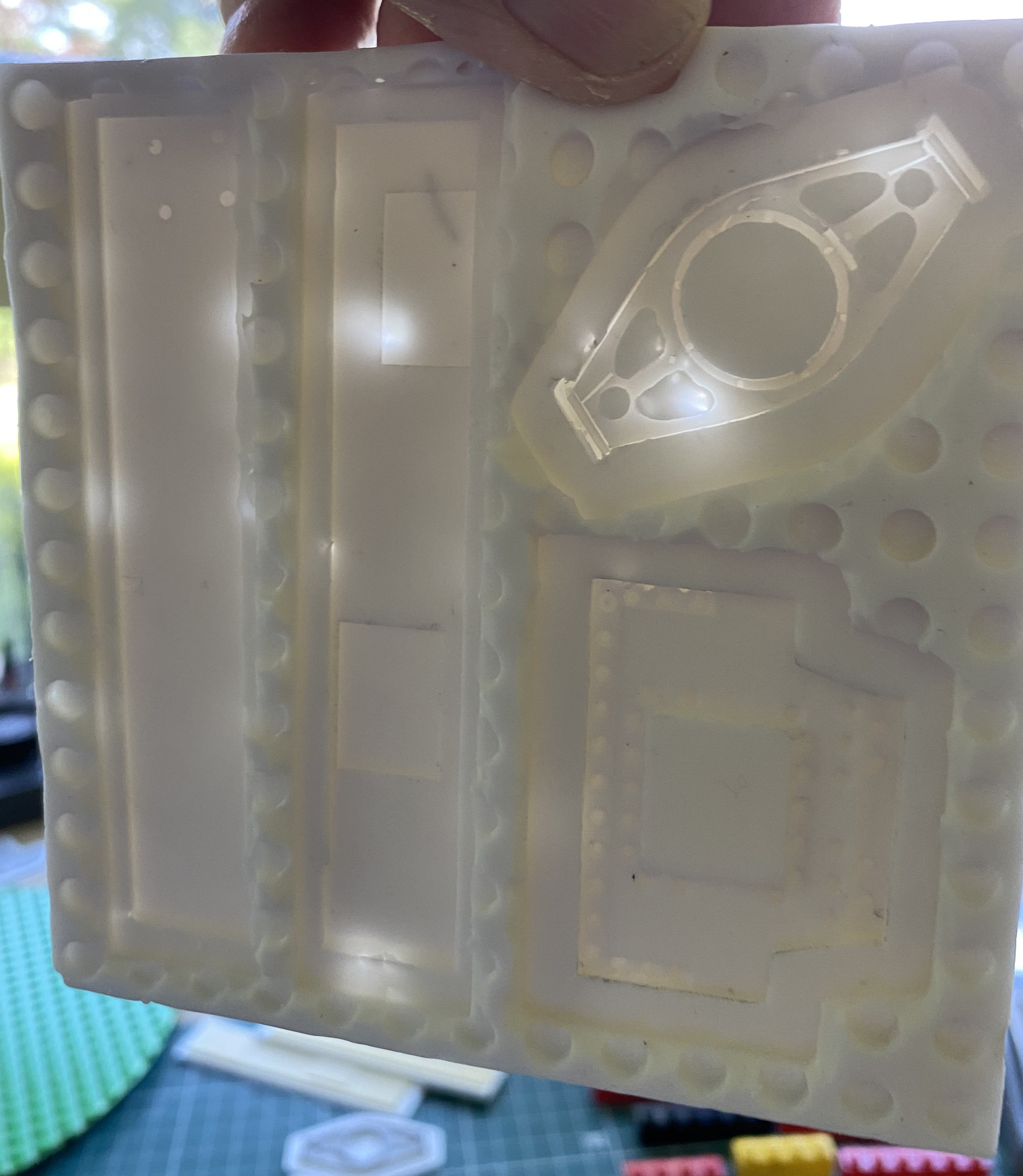 The molds show so far are what I call (because I don’t really know what They call them) “encapsulating molds.” The part molded and copied end up completely encapsulated by the rubber. Sometimes one will have to cut a mold open to retrieve the encapsulated part. Don’t cut the mold completely! If you do, it becomes a stone bitch to align the two parts and the slippery resin to get something useful. Won’t work. I cut only as much of the mold as necessary to extract the part, leaving an uncut “hinge”. Most times that’s just down one side of the area where the part is. Sometimes it requires both sides to be cut. The cut sections will snuggle up to each other quite tightly if the mold is stored correctly. Silicone rubber has a memory. If the mold is stored under stress, as in, not utterly flat, and left that way, you will find that that is how the mold stays…and that means the part you’re trying to copy is deformed as well. Since the vacuum deforms the Lego platform slightly during degassing, I store my molds with the smooth top down. That works.