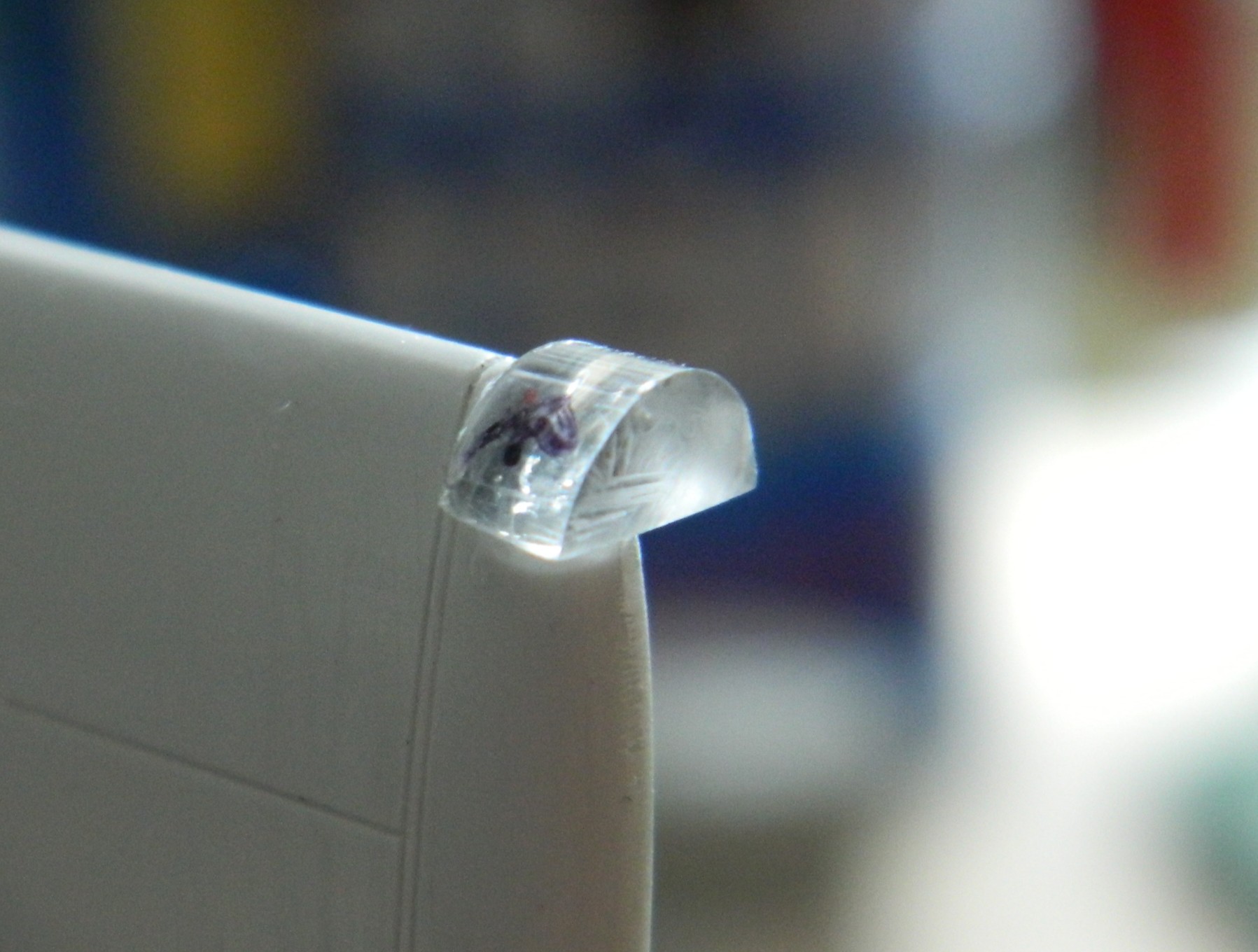 I decided that since I’m using a new-to-me tool, UV-setting resin, that I was going to decrease my ignorance of this material by seeing what I can do with it. Before I started, I used a permanent marker on the areas of the forward canopy that contact the fuselage. This would keep the plastic from looking like, well, plastic. To spread the canopy to the desired width, I started by tacking one side of this part in correct alignment: