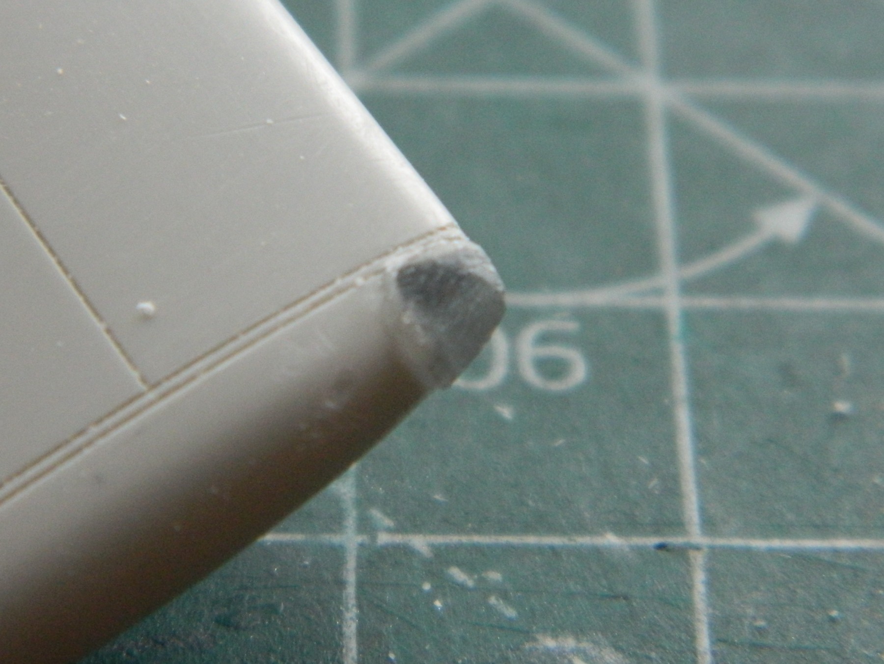 Once the mask was removed and the putty worked, I guess it’s better, but it’s not accurate. It’s just the best that could be done short of splitting the fuselage halves and starting this part over. Nope. Not doing any deconstruction that I don’t have to. Best part of being good is knowing (or guessing correctly) when to stop. So I stopped here (of course finishing down the putty and repainting the affected areas, which were minor).