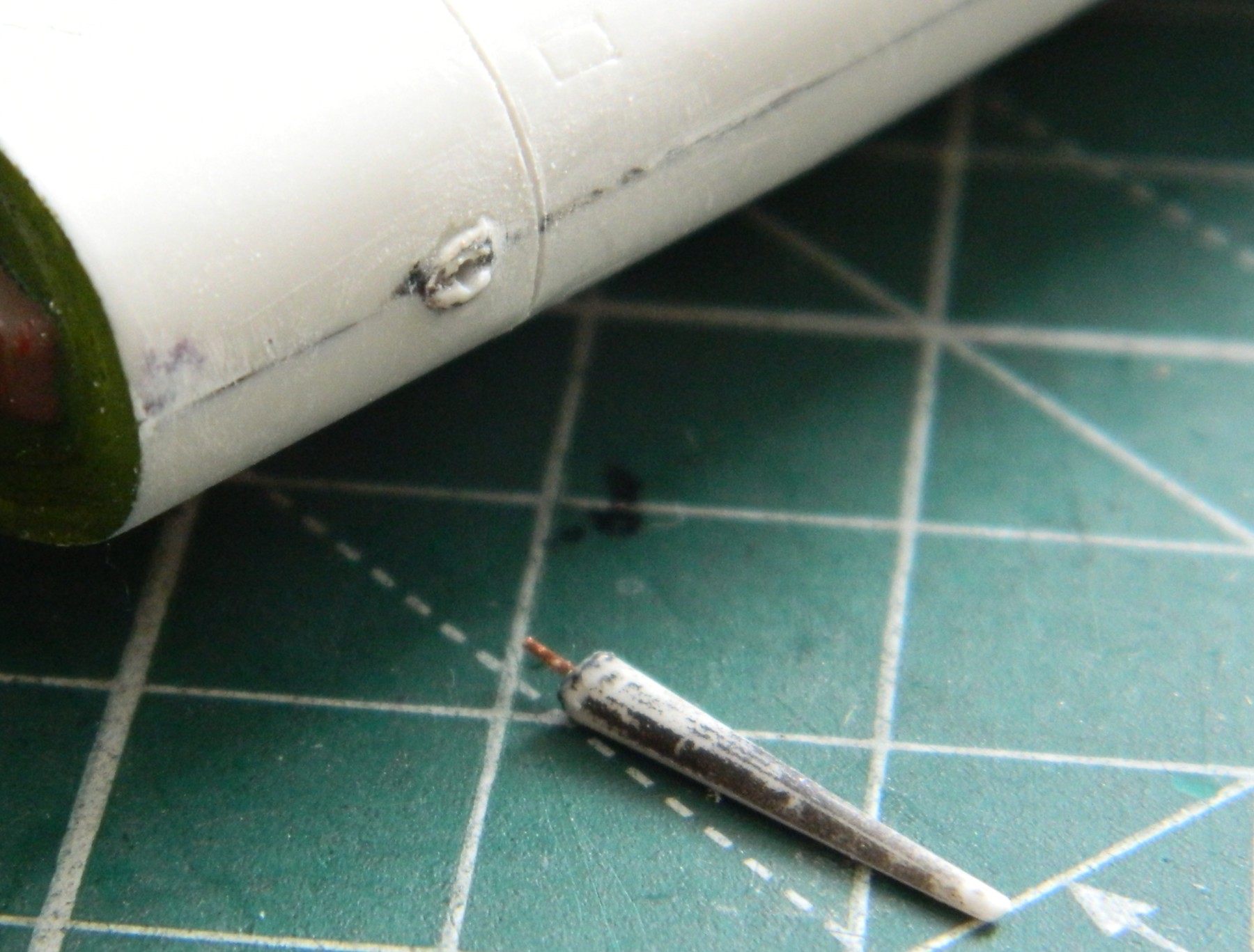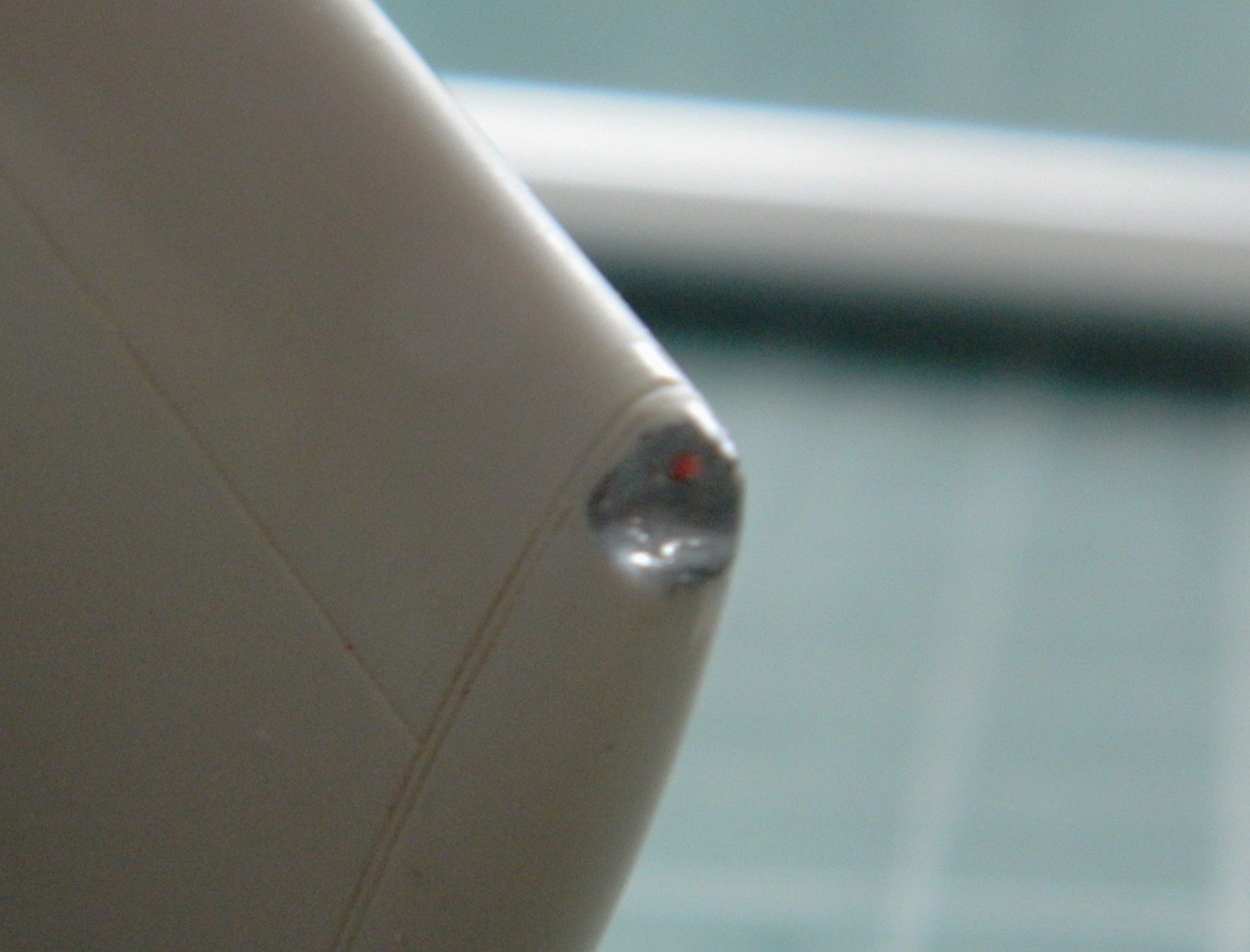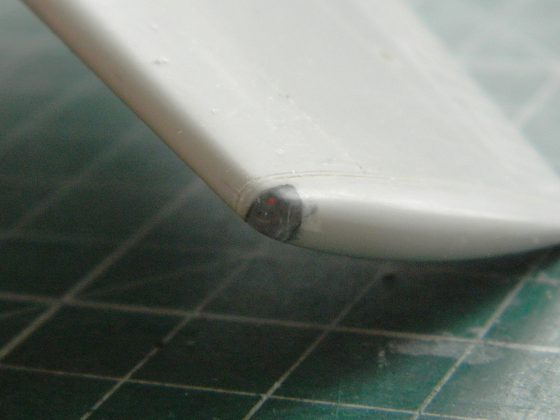 References show that the actual bulb comes in from the side of the wing. Red is used on the left, green on the right, so I drilled a very small depression that I added the appropriate color to (sorry about the blurred photo, the camera clearly needed caffeine as well), then I sanded and polished the faces of the acrylic that will be in contact with the wing before gluing the acrylic (with the properly painted “bulbs) to the wing. Usually I would use superglue for this. This time I decided to see if the UV-setting resin would work…it would certainly give me MUCH more time to get the acrylic correctly positioned and it worked great: