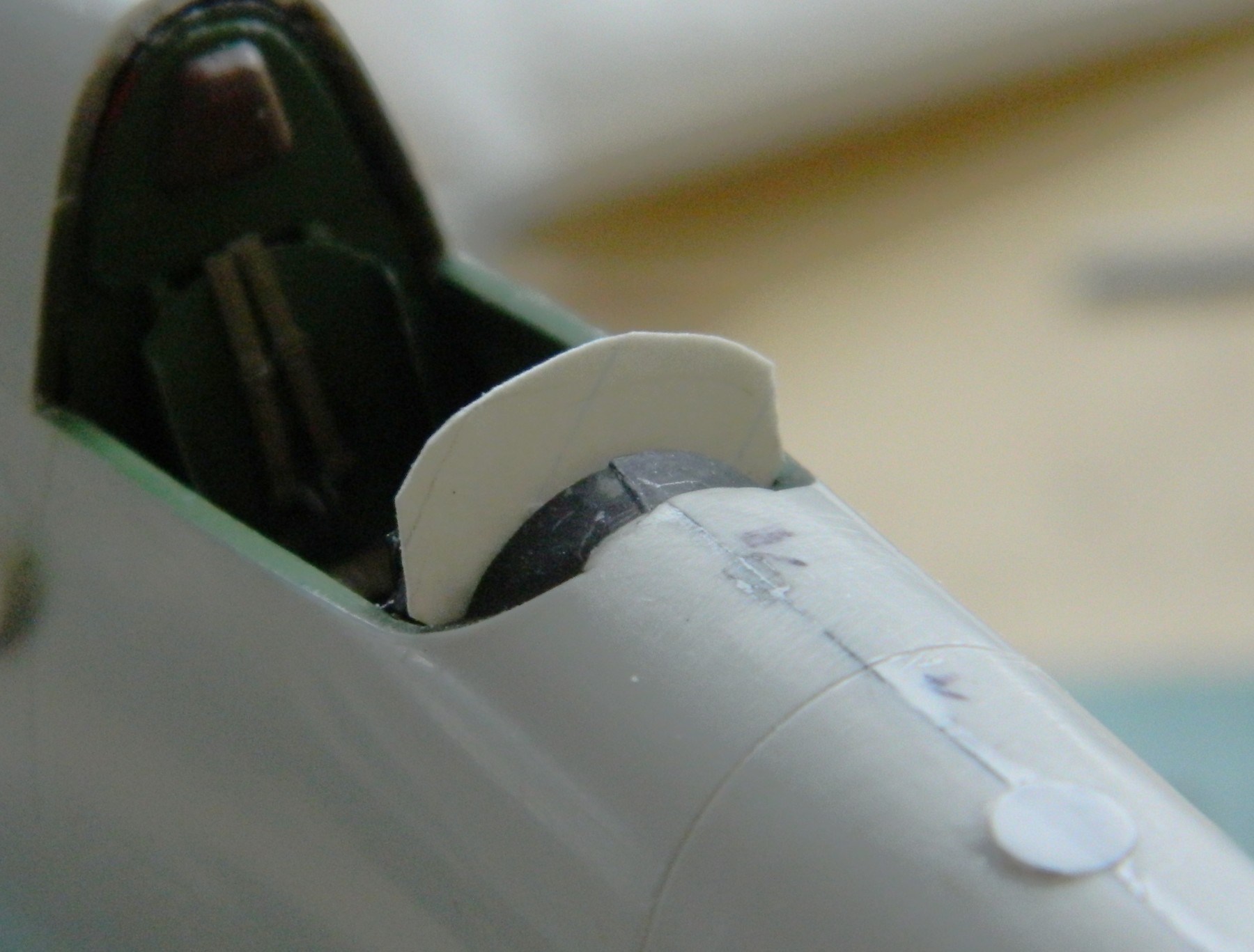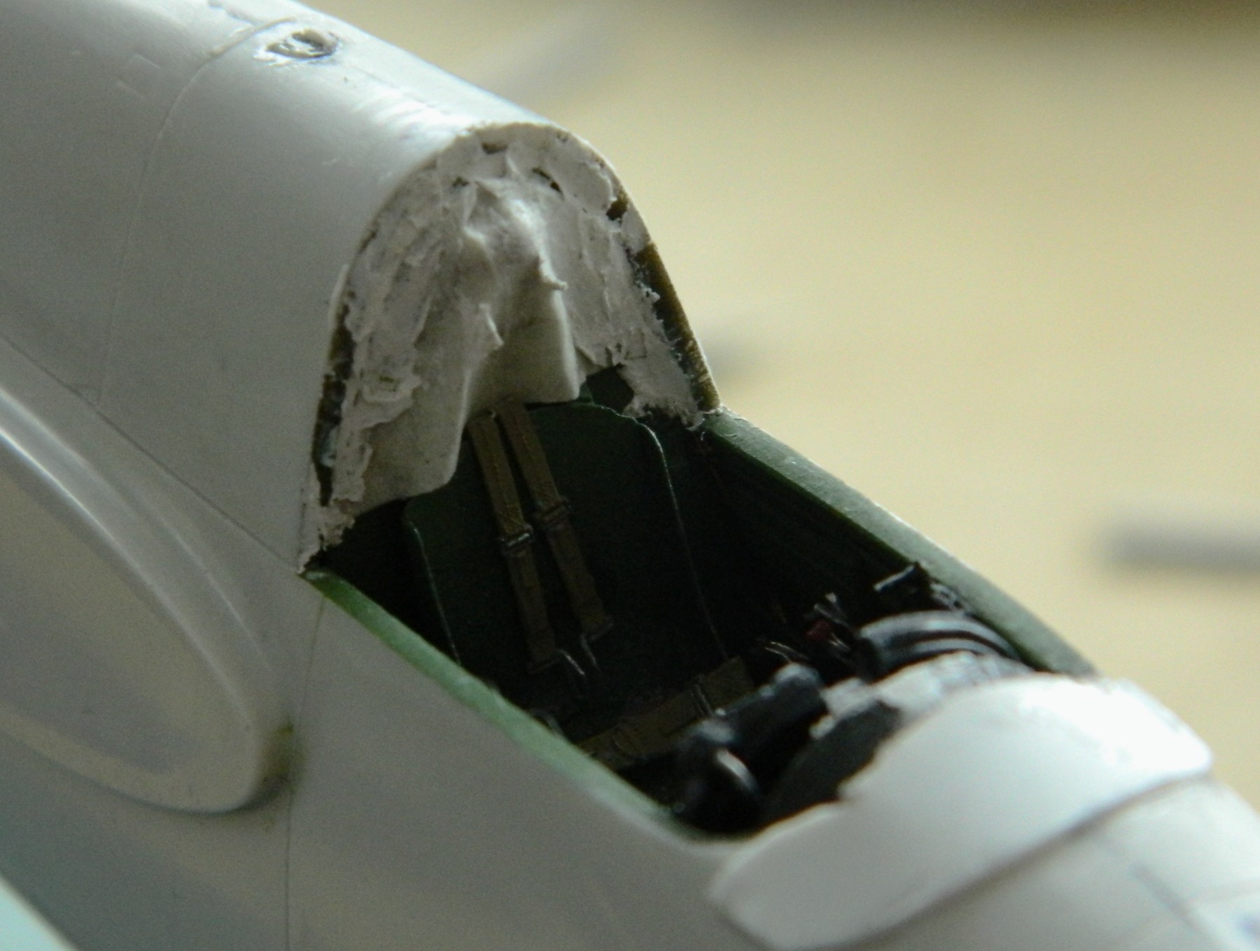 The rear of the cockpit’s interior is flush with the sides of the cockpit opening on the actual aircraft and because of where the cockpit assembly fit, there was a gap around that bulkhead (fit problem, obviously) I’d intended to putty that. But in order to fit the bulkhead where it should go, I’d need a time machine to talk (loudly) to the engineers. Since that’s not possible, I did the best I could with what I had to work with: