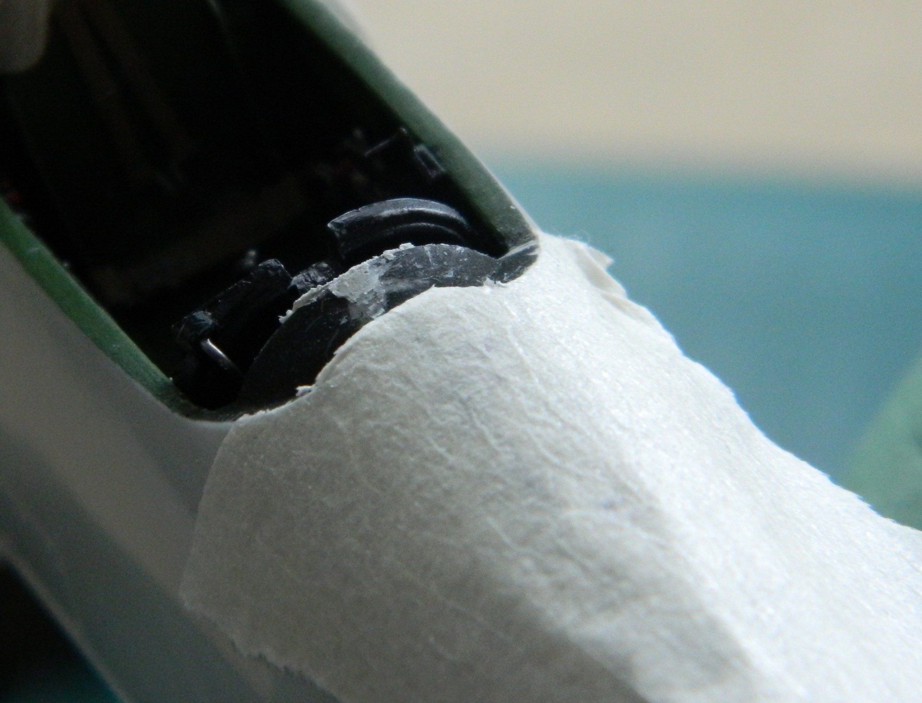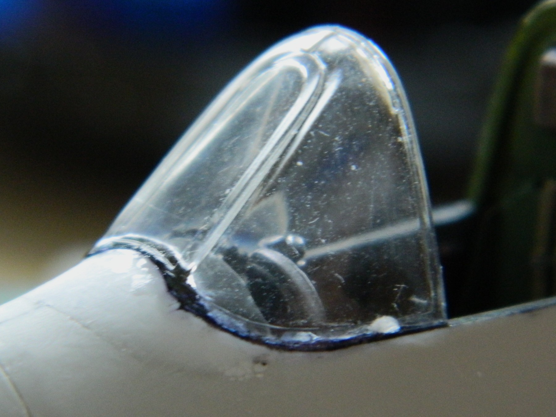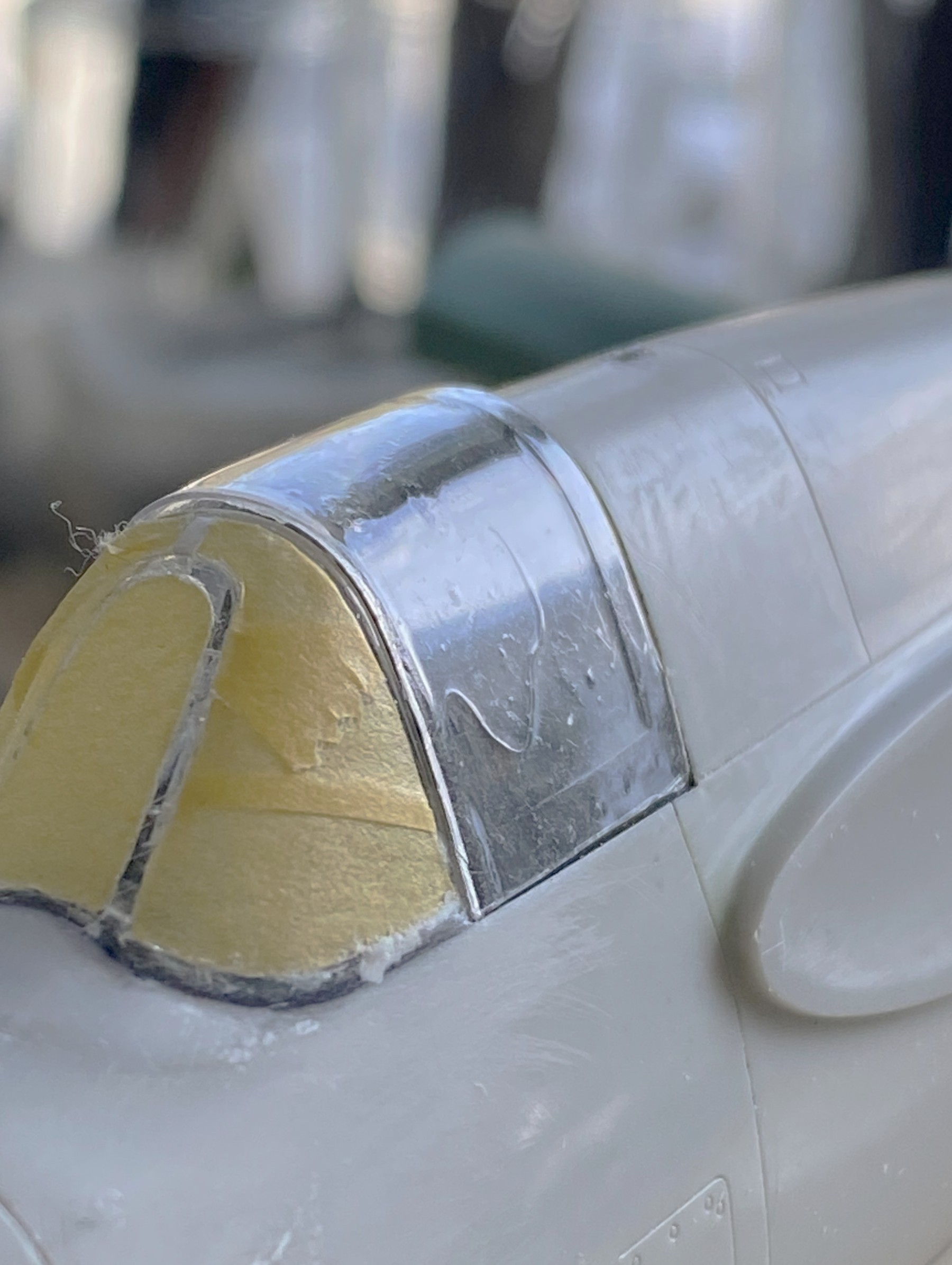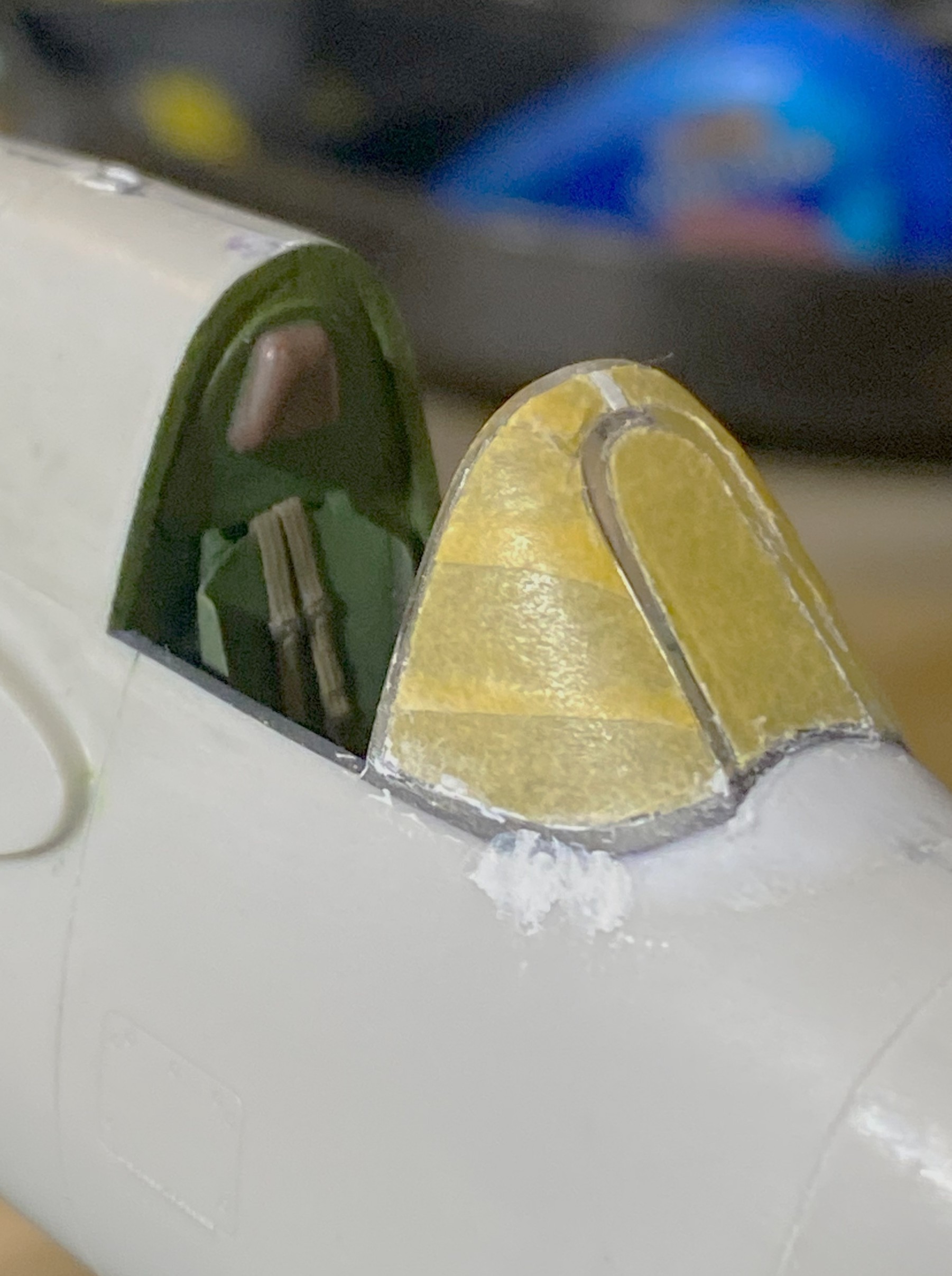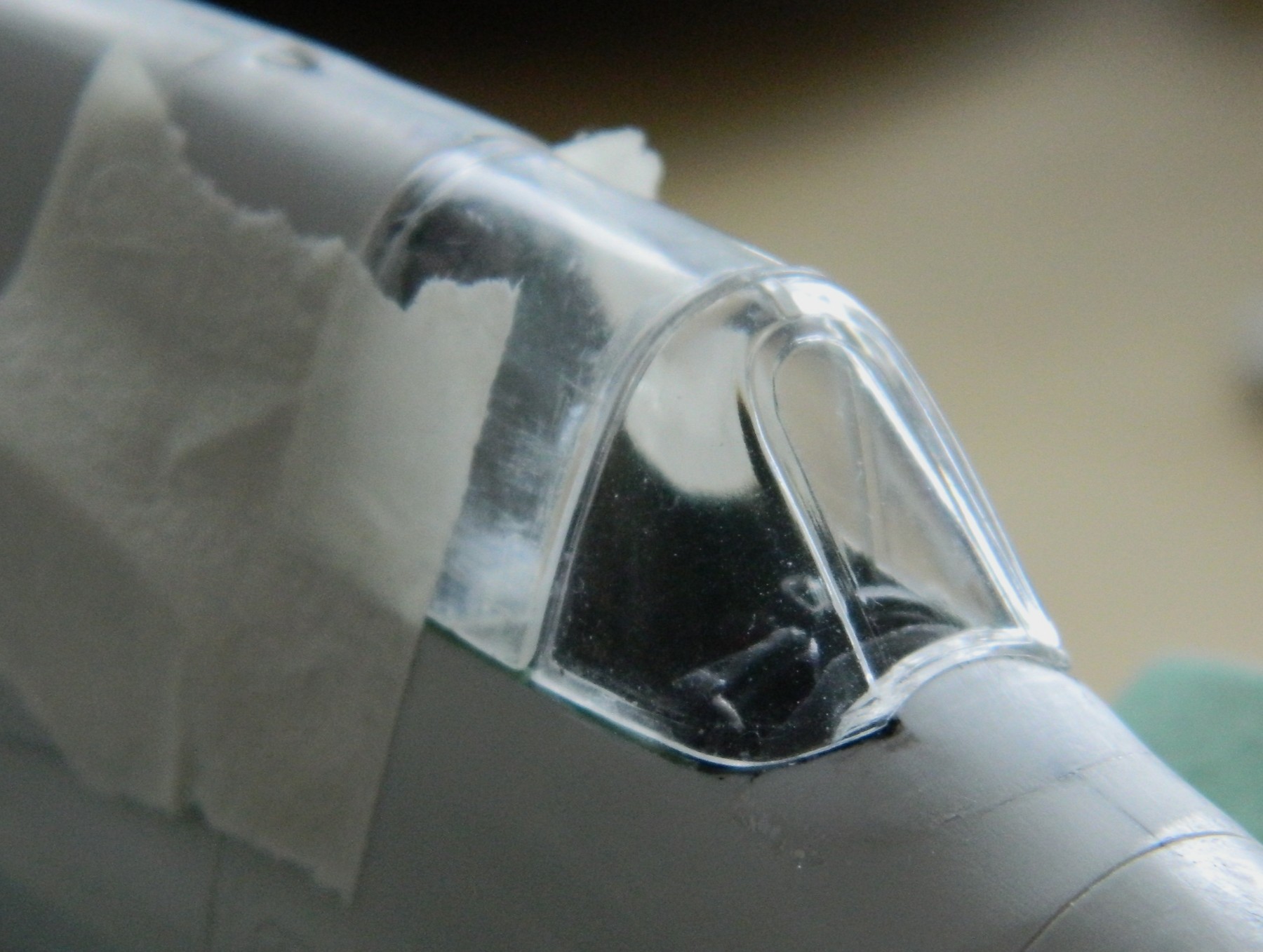 Then I spread the part to fit the other side of the fuselage with a fingertip (using the base of the finger is painful and bloody). Considerable pressure outward was applied and I kept waiting for the attached side to snap free. It didn’t move at all! I filled in (most of) depressions left by applying multiple coats of resin so that I would have enough to sand down to invisibility. But before I did that, I masked the sections I want to remain clear because brain-fade can strike at any time. I have this one part that must be used, and I wanted to protect it from being scratched. Once masked, files and sandpaper blended the canopy to the fuselage. There were a few areas that needed minuscule amounts of putty, but so does the rest of it so putty was applied: