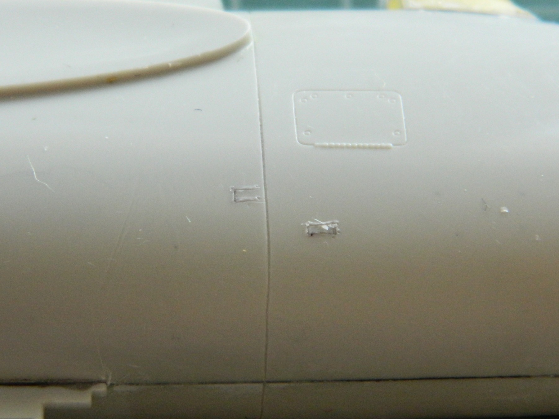 And speaking of “cuts” and “points”, this aircraft had four weapons (not counting rockets or bombs), four 20mm cannons and four .50 caliber machine guns. What the kit didn’t have was any shell ejection ports. So references showed me where they’d go, they were marked, and much annoying cutting with sharp points added them:
