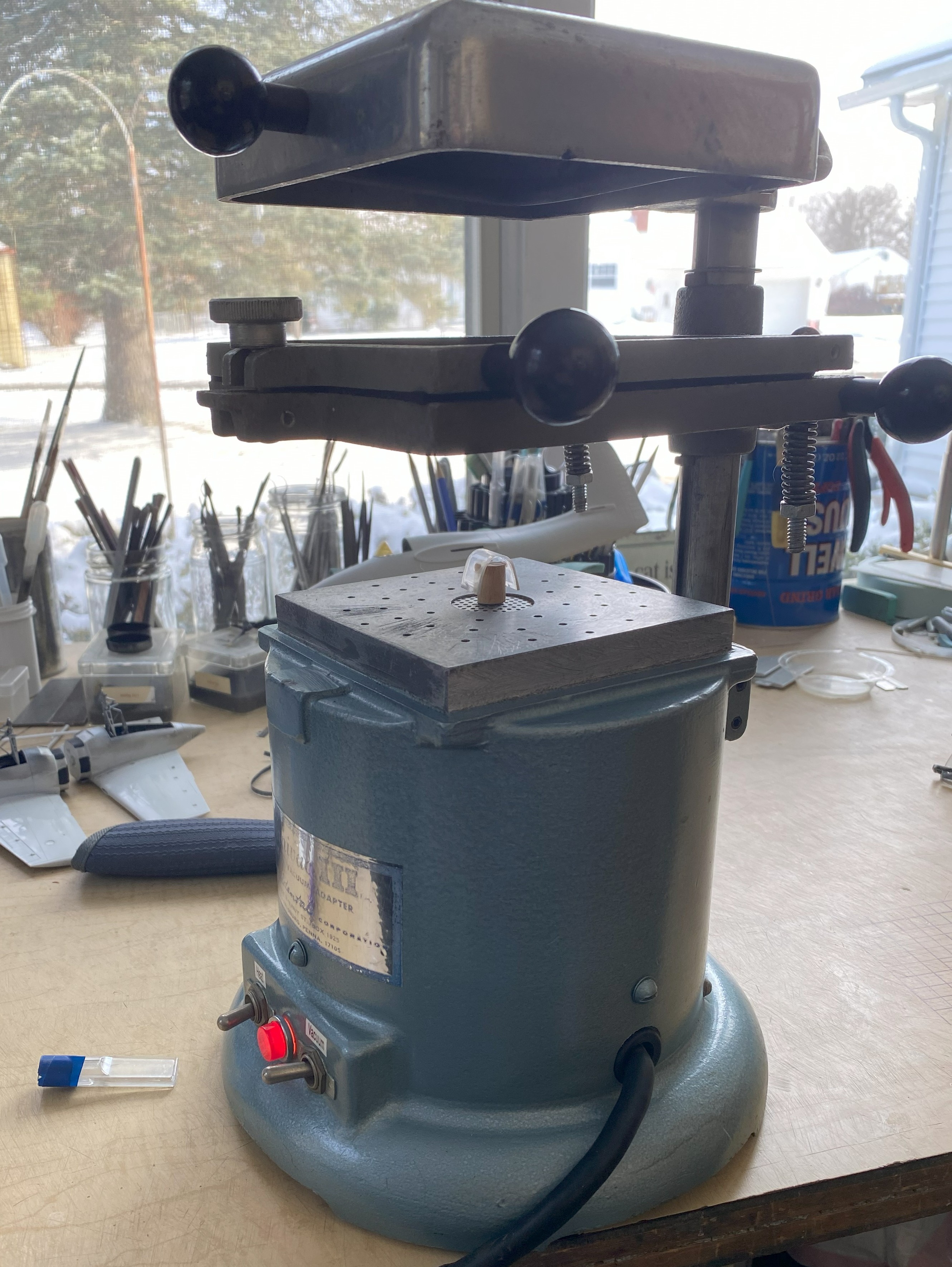 I set up the vacuum molder and mounted the buck on a stand (replacing the superglue I’d usually use for this and used the UV-setting resin instead and had at it):