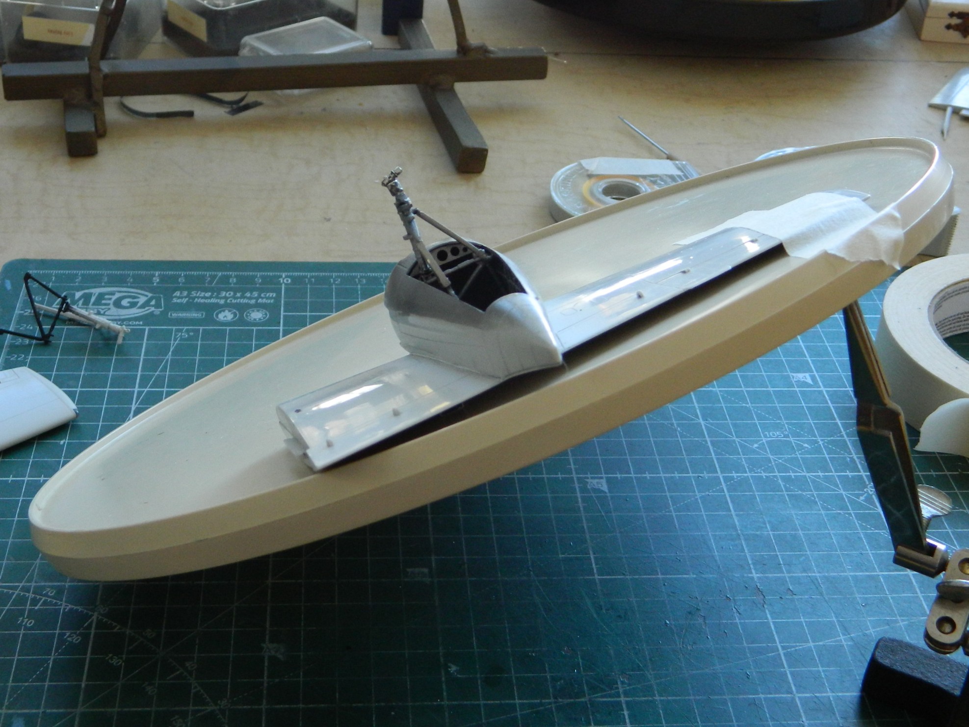Then followed much sanding, filing, and fitting until it finally fit correctly (or at least the way I want it to fit, which I’m hoping is the same thing) (the sliding part of the canopy was also fitted and filed; it’s only use for it is to pull plastic over with the vacuum mold and in place to confirm that I had the front of the canopy correctly fitted):