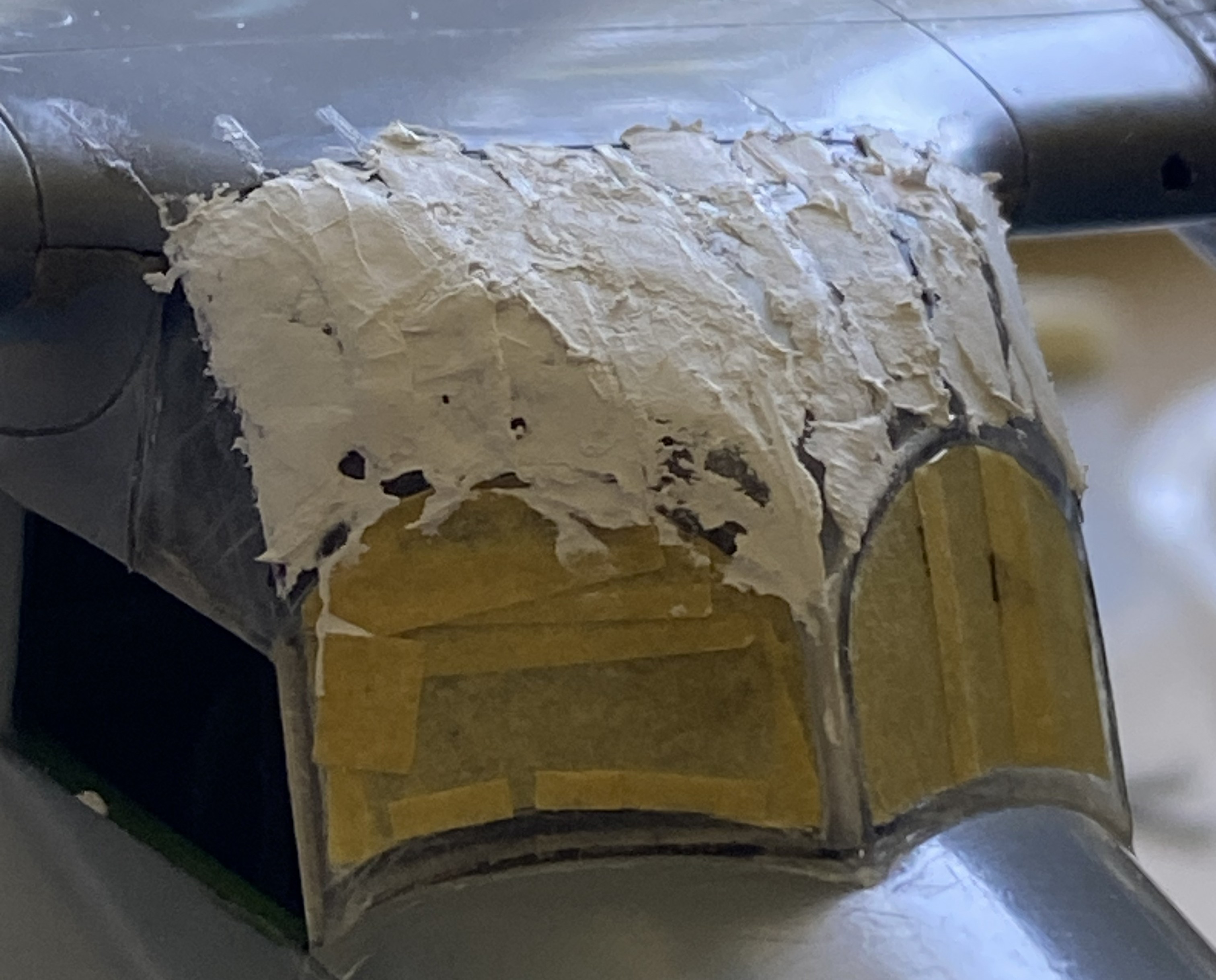 With the putty dry, I went back to the fuselage over the flight deck. ::sighs:: Where to begin… A lot of work ensued. Almost all the putty was sanded away to see if I could (I couldn’t) refine the shapes and lines of this area. As so often happens, once I’ve decided on a method to accomplish whatever oddball thing I’m trying to do, often I have to invent a way to do it (and frequently that is not a hurried process, regardless of how it may look). While doing the work of that invention on the model, it is quite common for me to figure out a different (and hypothetically better) way of accomplishing the task. It’s also not uncommon for that epiphany to come too late to use on what I got the idea from. This was one of those. While removing putty and trying to refine the shapes into something I want, I realized that what I should have done was not add the strips and putty at all. The panel lines should have been scribed and cut away to create the lapped effect. And then I noticed that the lines aren’t just on the clear part, they extend rearward to the pencil line on the main wing, which is how I came to the realization that adding the strips and putty was a total waste of time/effort (and I added the resin scoops to the left sides of the nacelles):