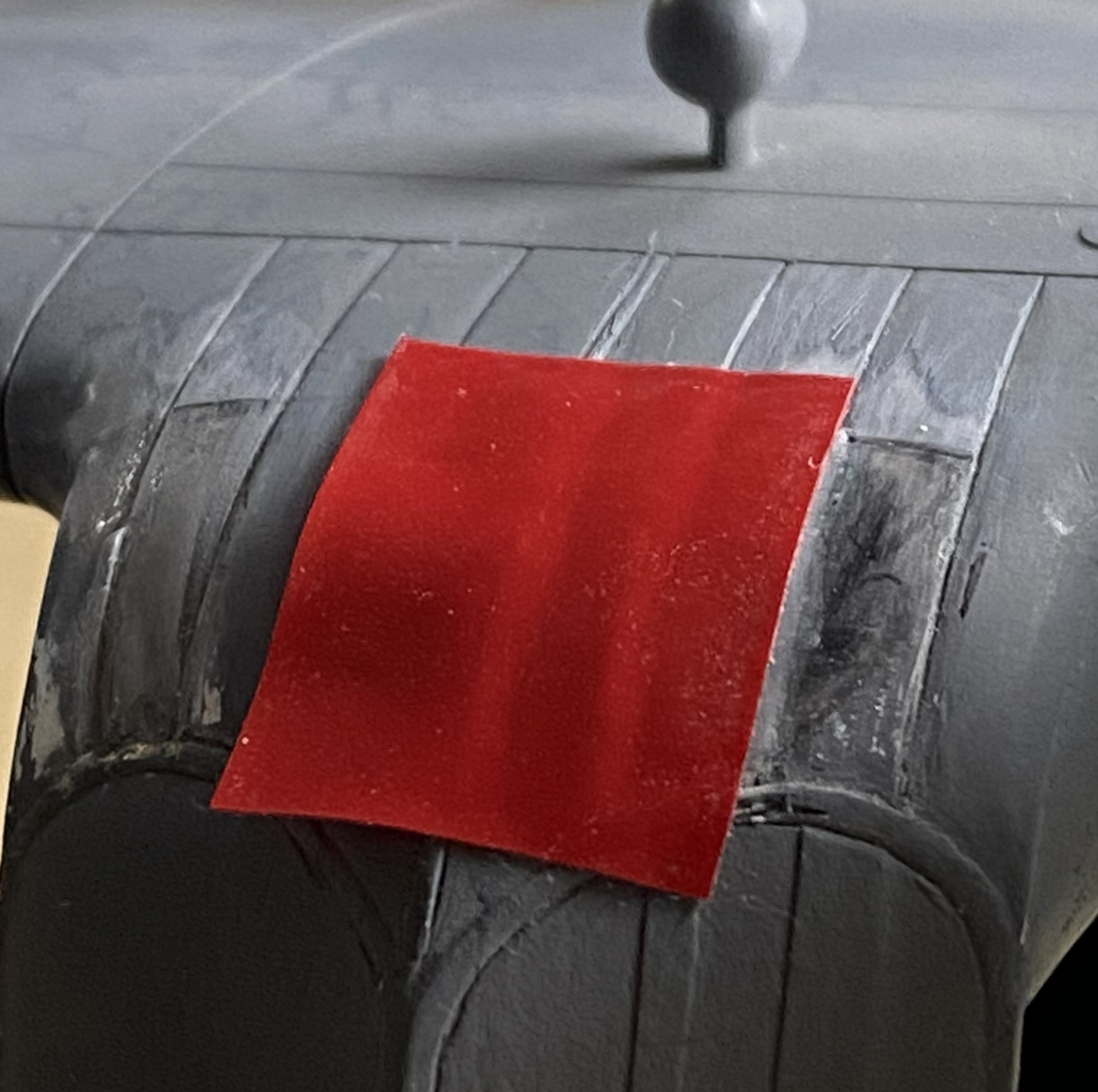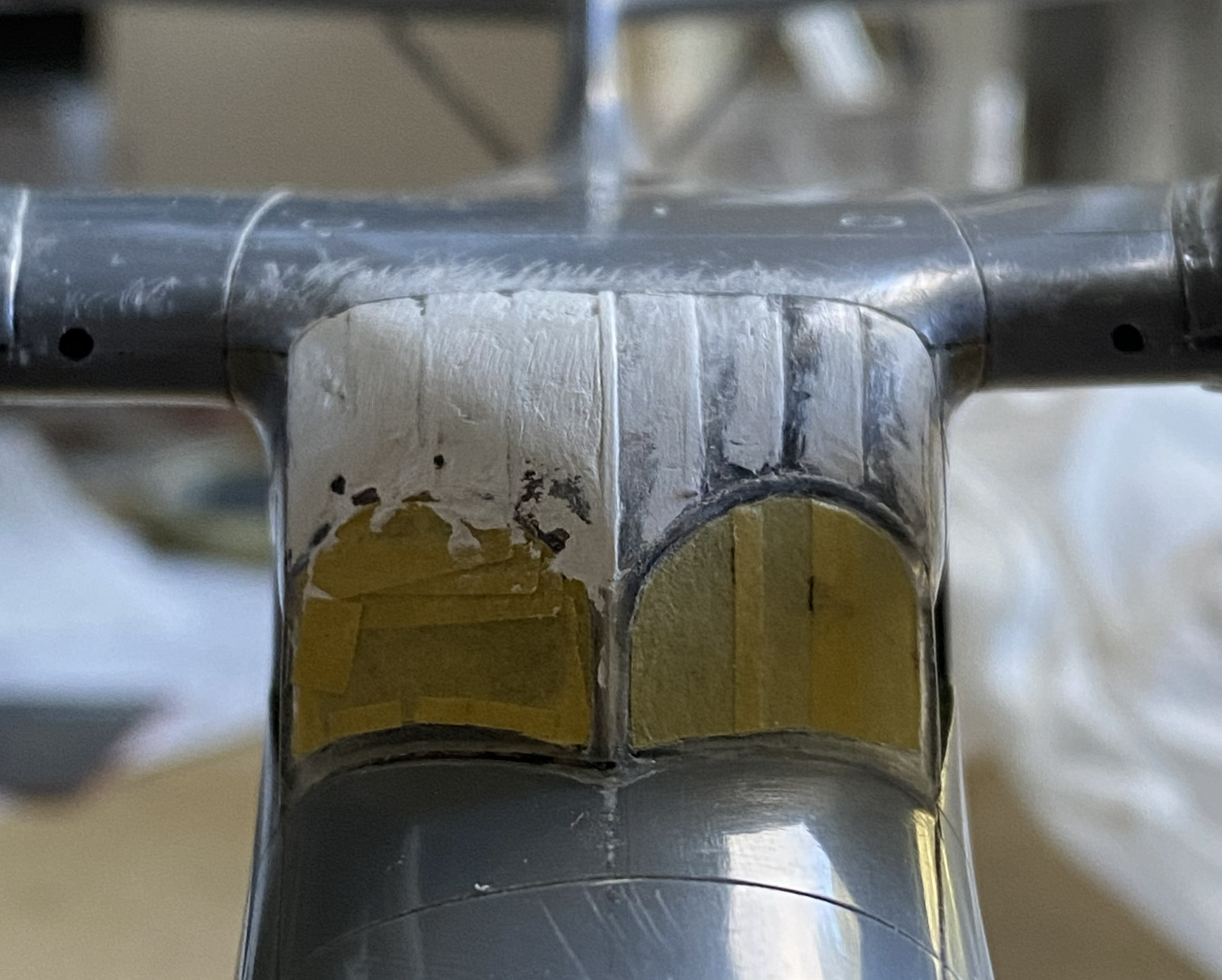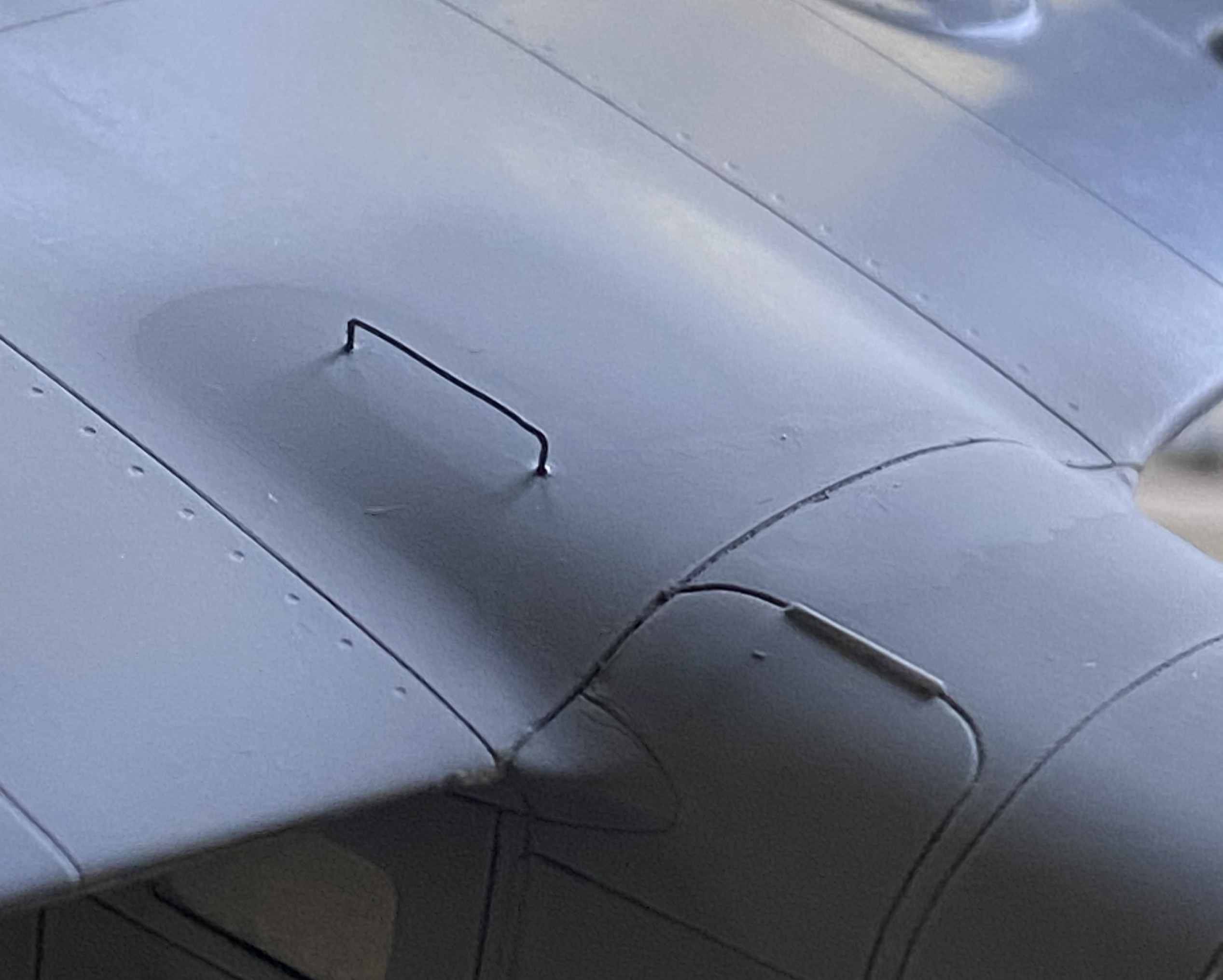 The fuselage over the flight deck (or cockpit, you choose) has a prominent feature. The curved shape is created on the actual aircraft by using flat panels. In some photos the panels appear to be butt-joined (the edge of each panel abutting the next), in some photos they seem to be scaled (where one side of the panel overlaps the next, sitting on top of it), and none of them are definitive. I made my guess (several guesses, really) and decided I’d go with the scaled (overlapped) presentation. I laid down strips of .005″ (.127mm) and then faired them in with 3M Acrylic Putty: