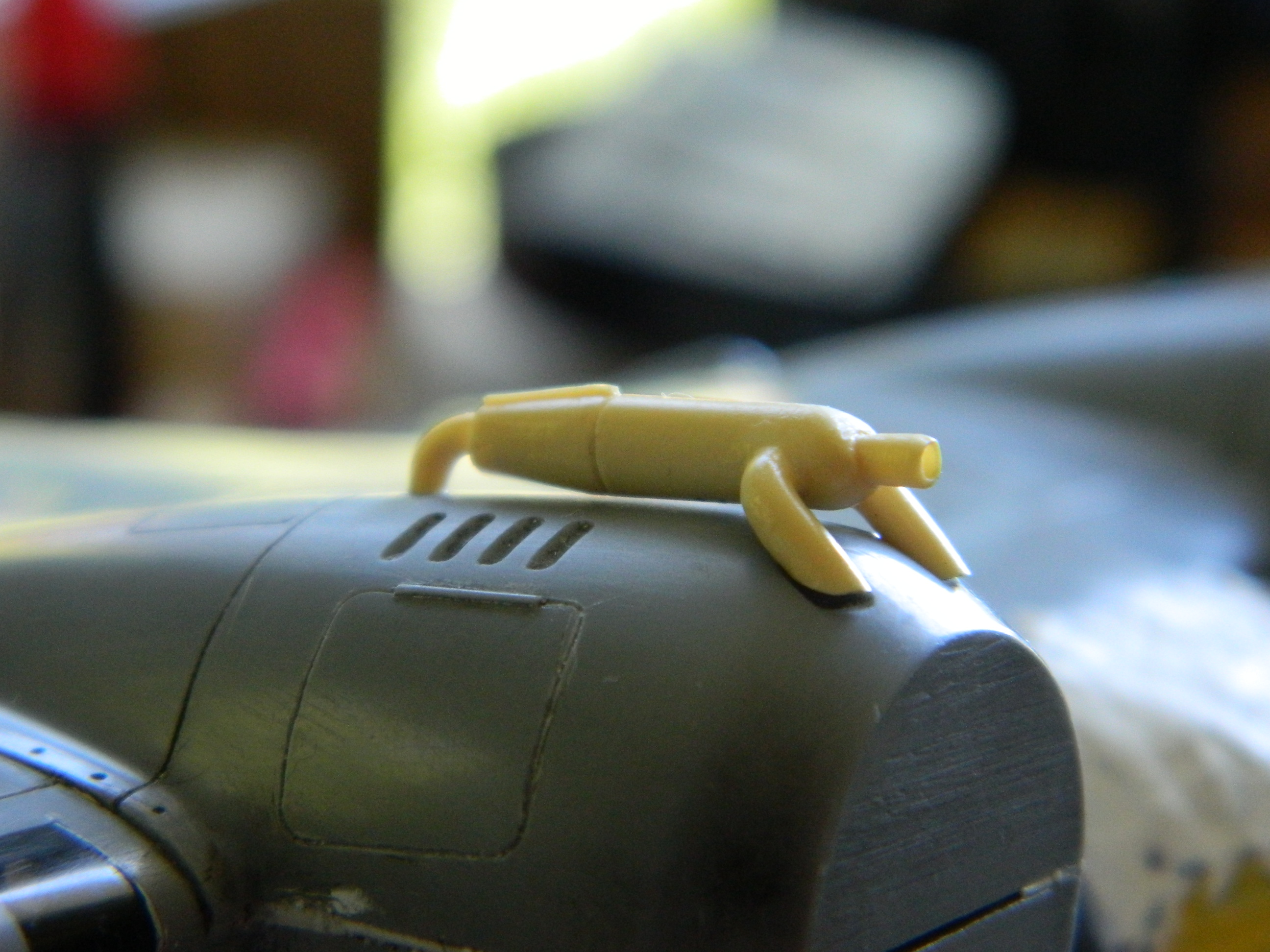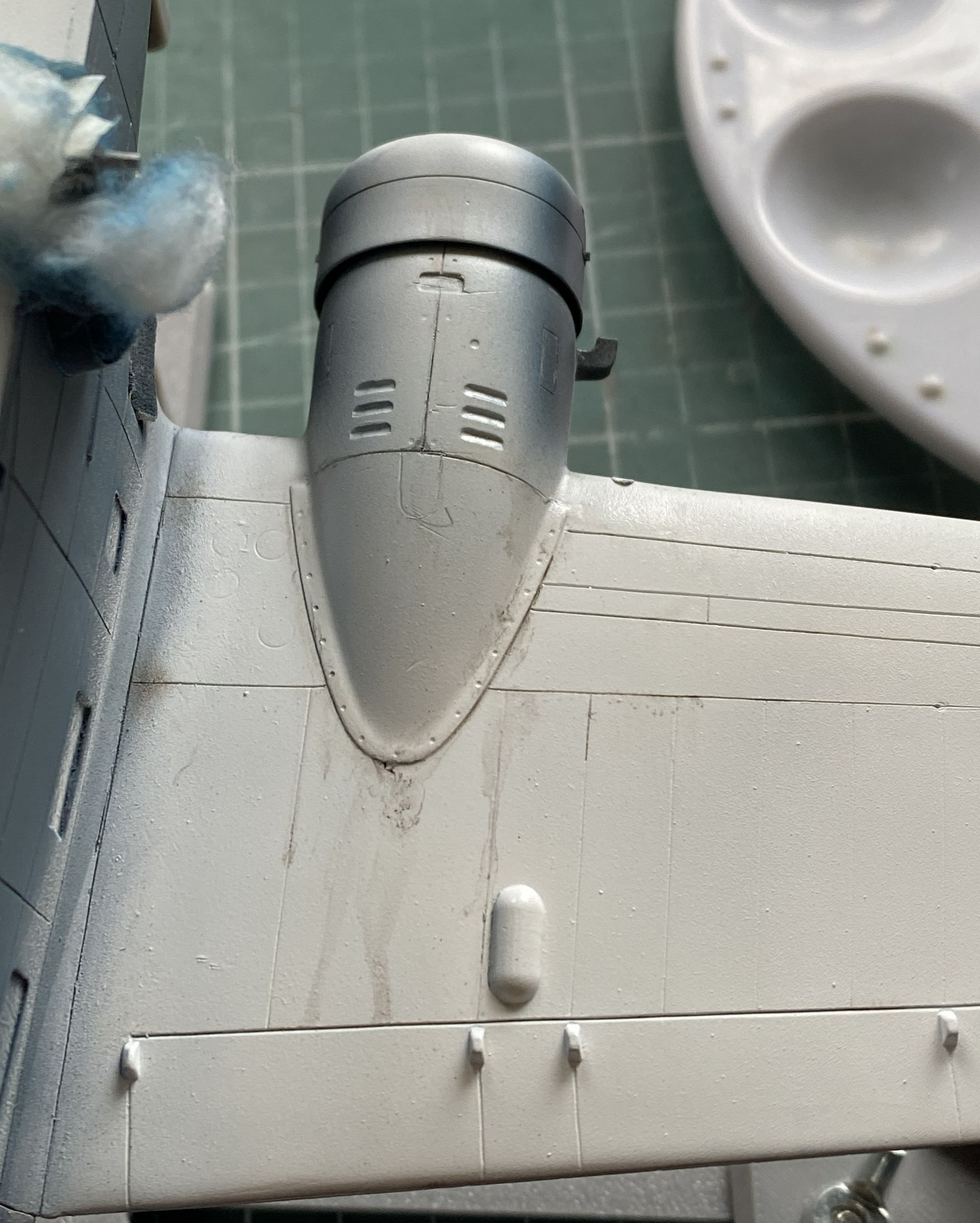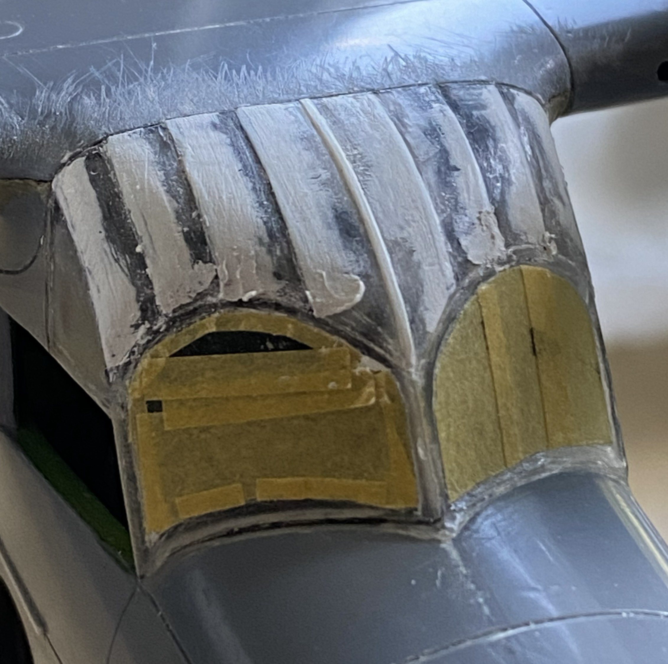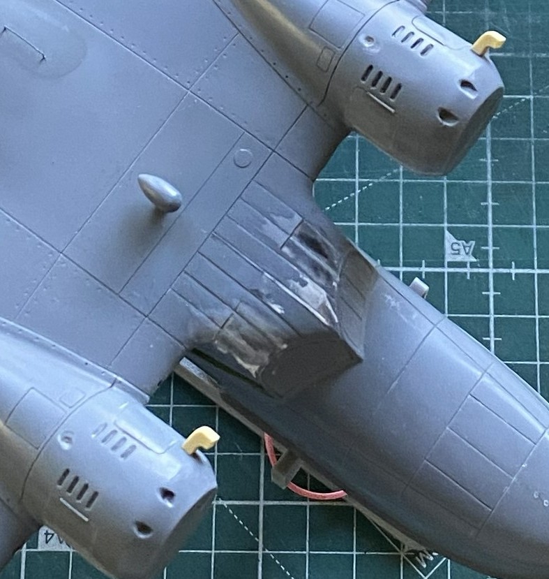 While the putty is drying, I fitted the heat exchangers on top of the engine nacelles. Originally it looked like a small, resin, cat standing on a hot griddle. Way too high off the nacelles. Fiddle, file, sand, cut at they now sit correctly:
