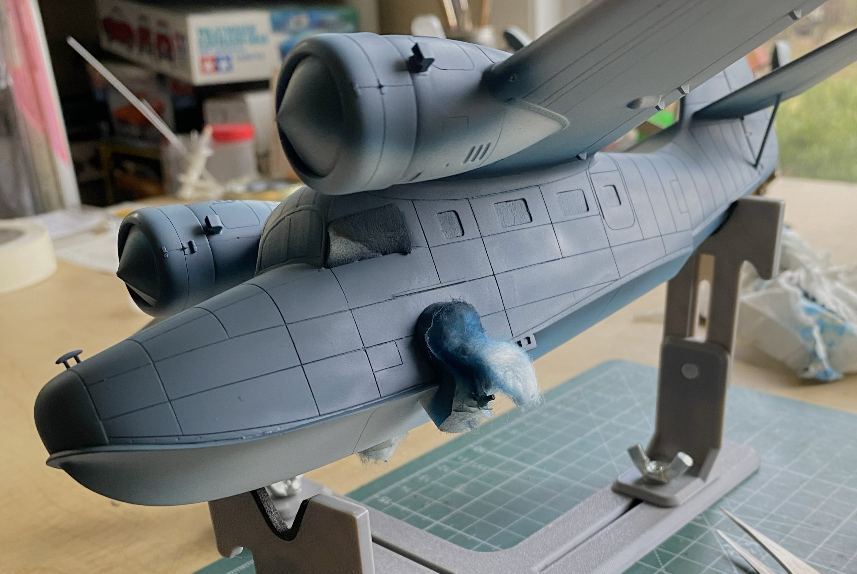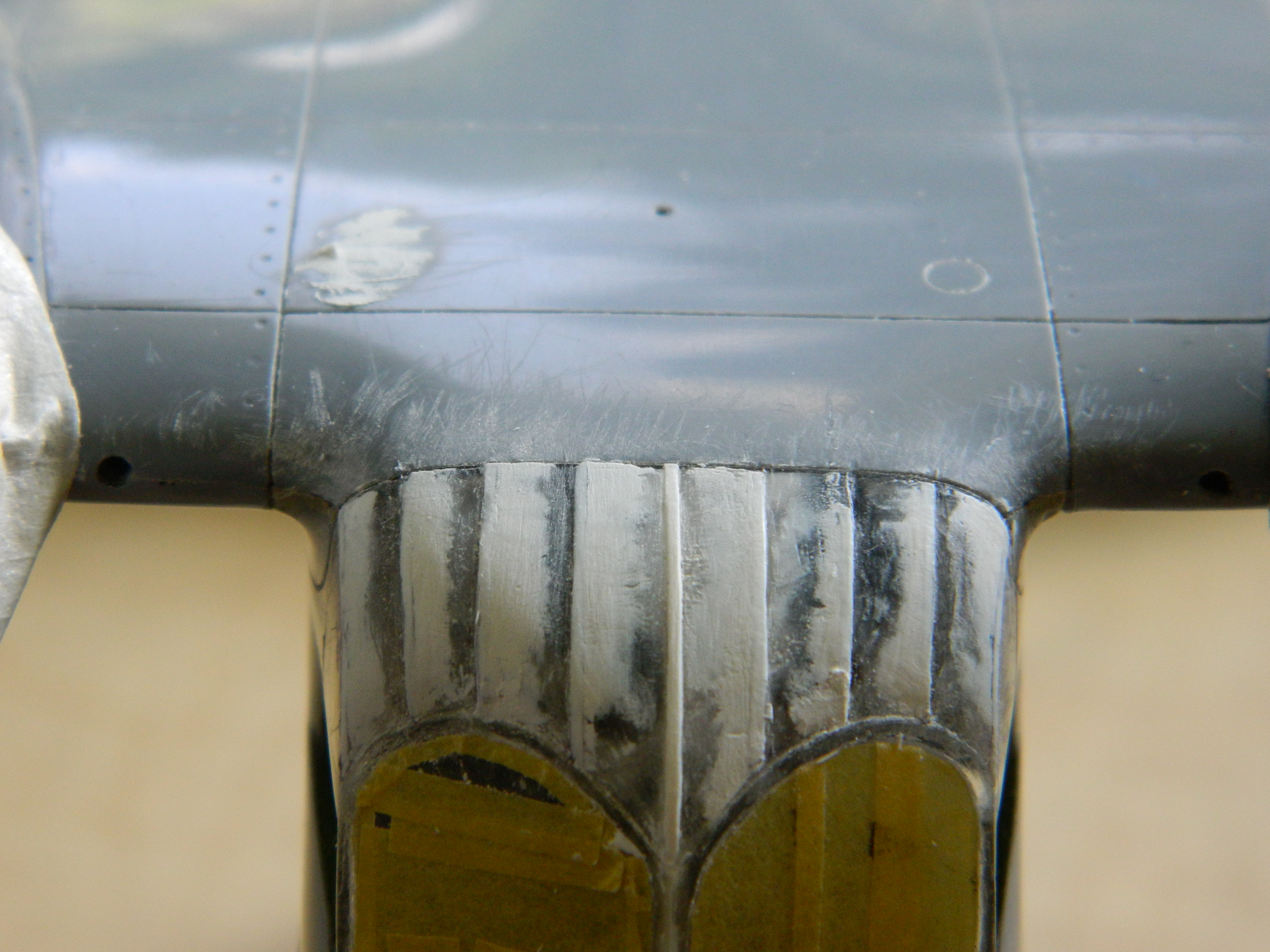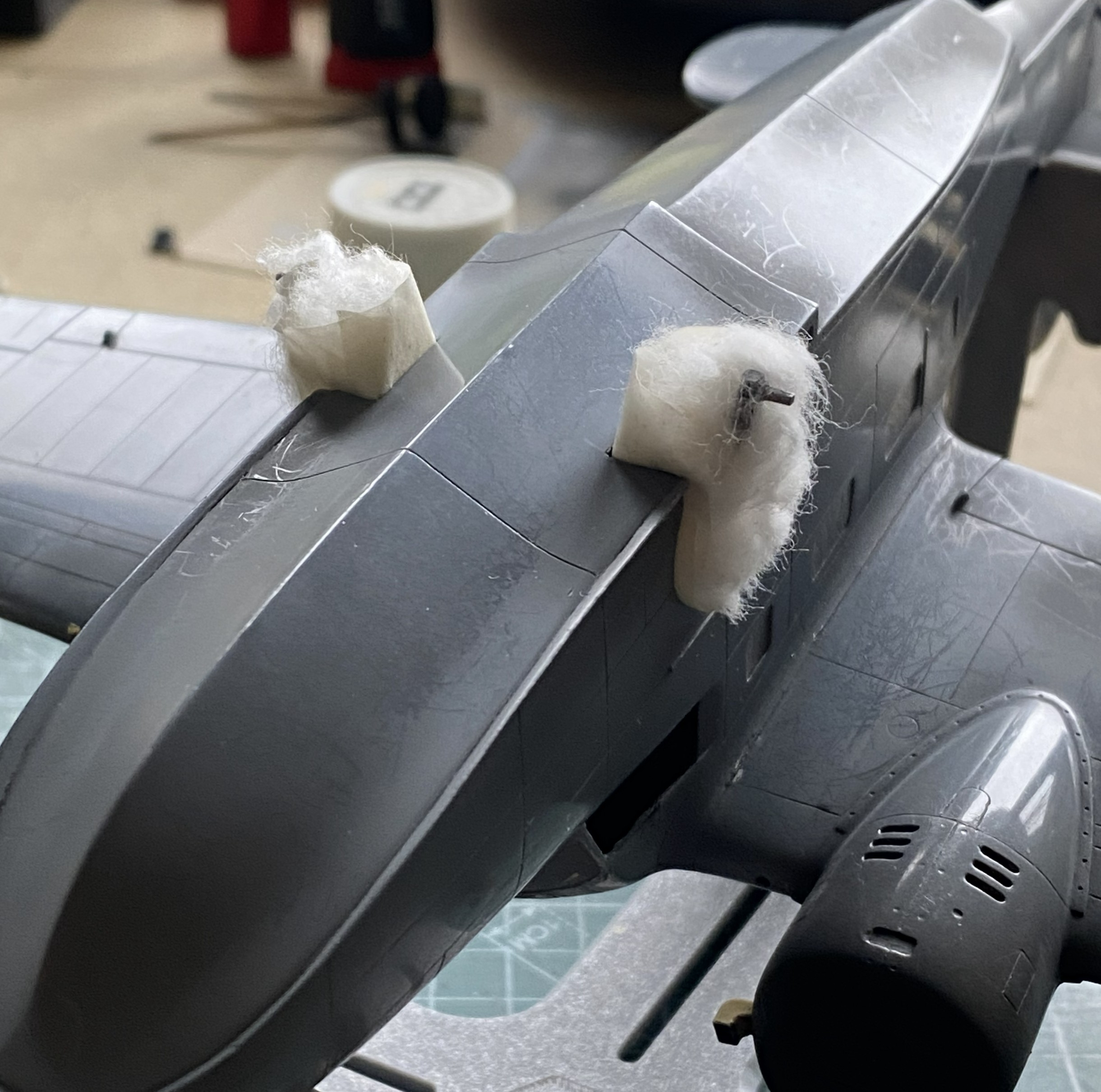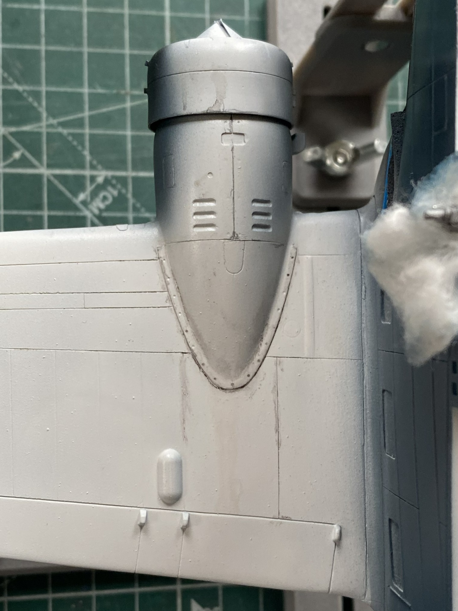 While the putty is drying, I fitted the heat exchangers on top of the engine nacelles. Originally it looked like a small, resin, cat standing on a hot griddle. Way too high off the nacelles. Fiddle, file, sand, cut at they now sit correctly: