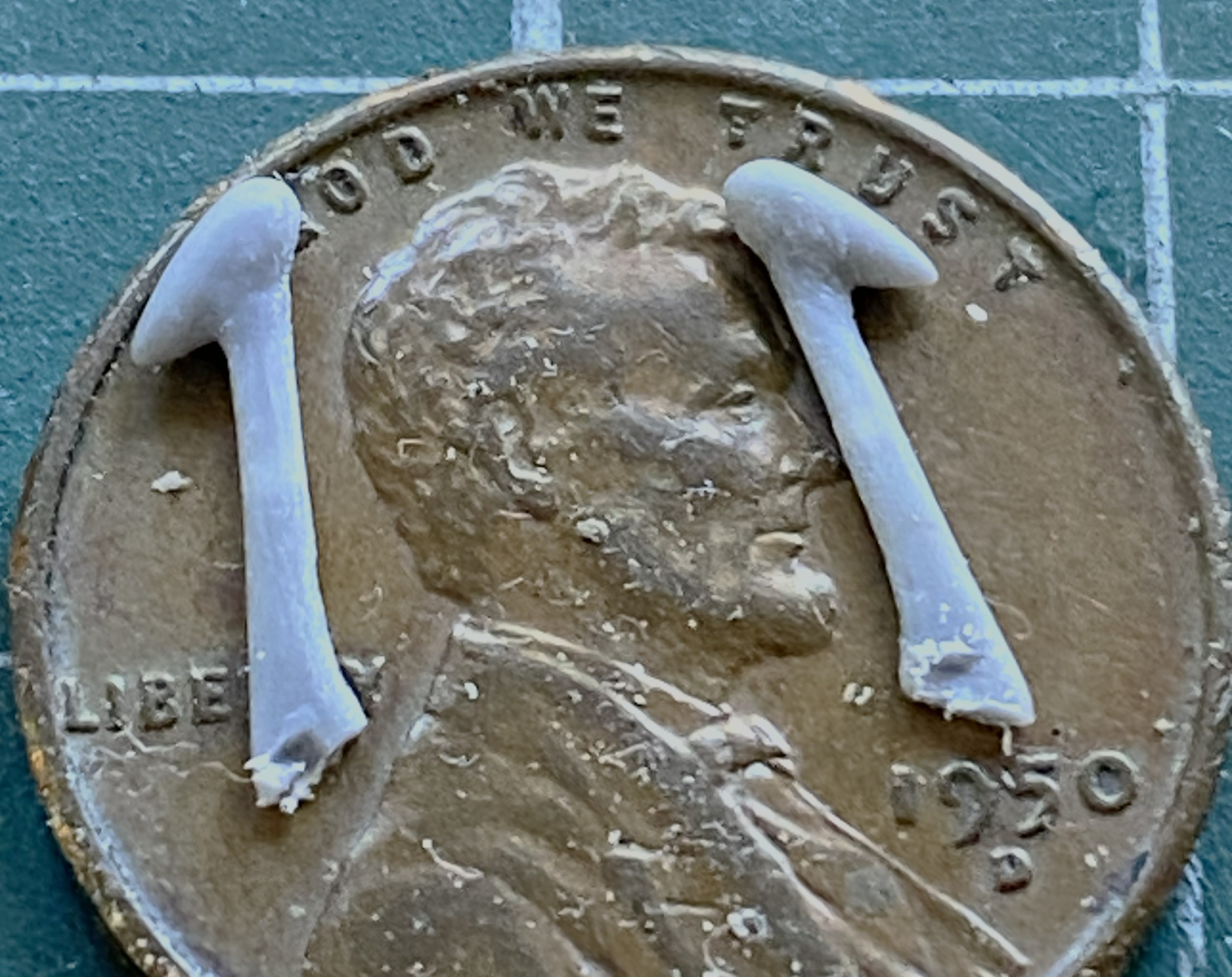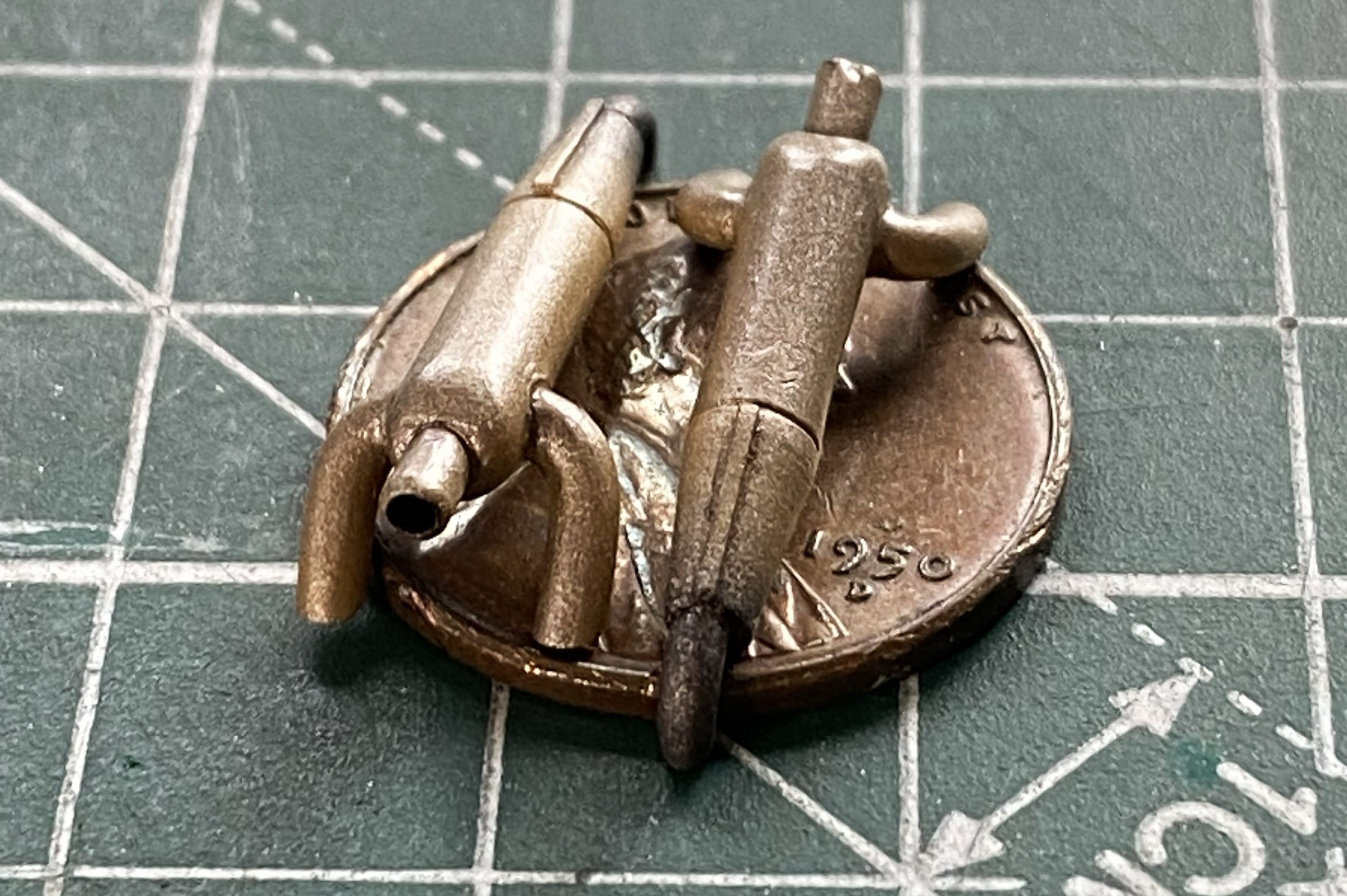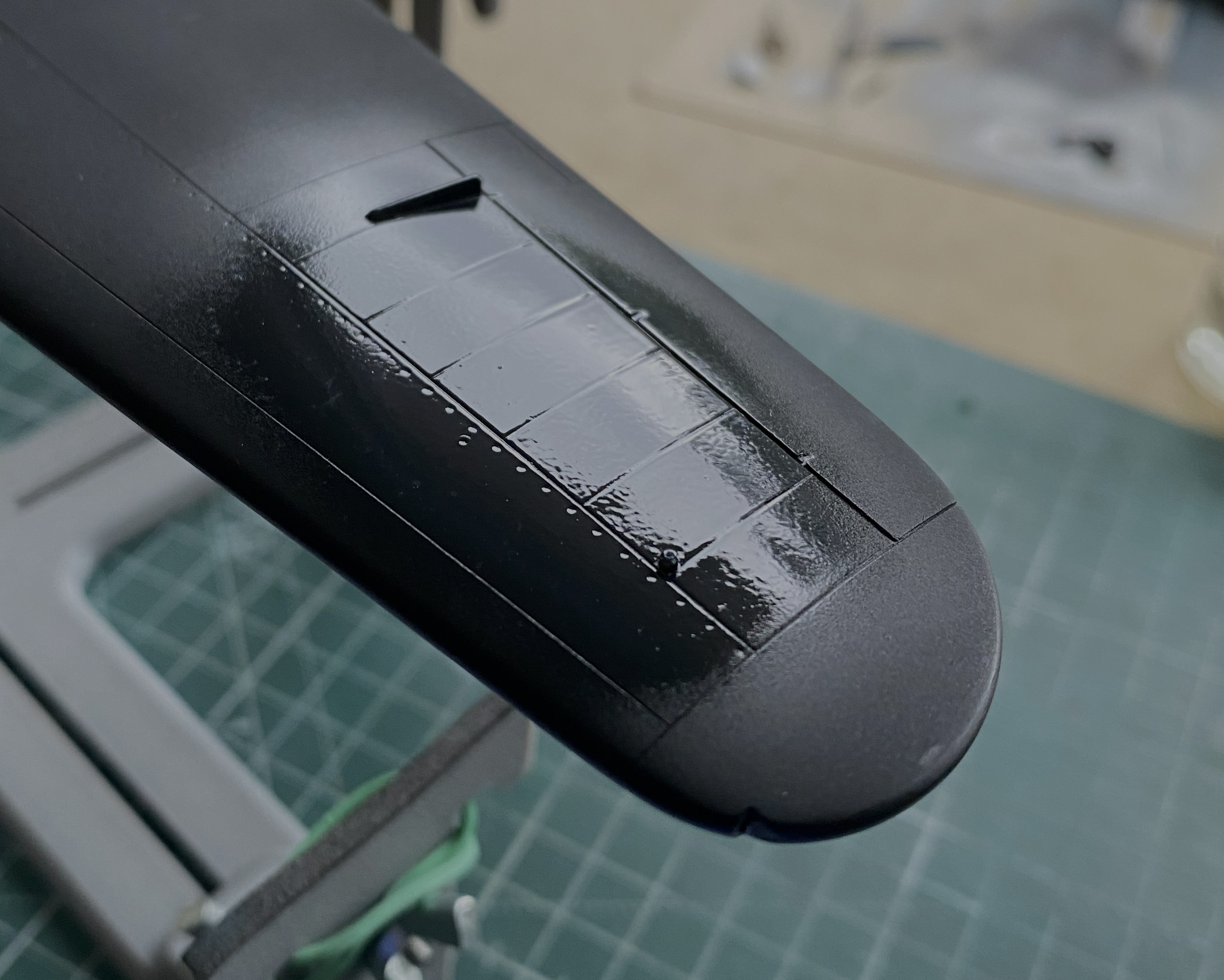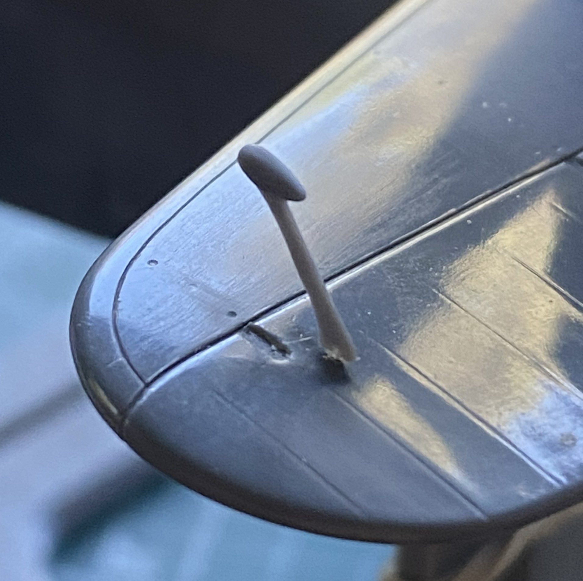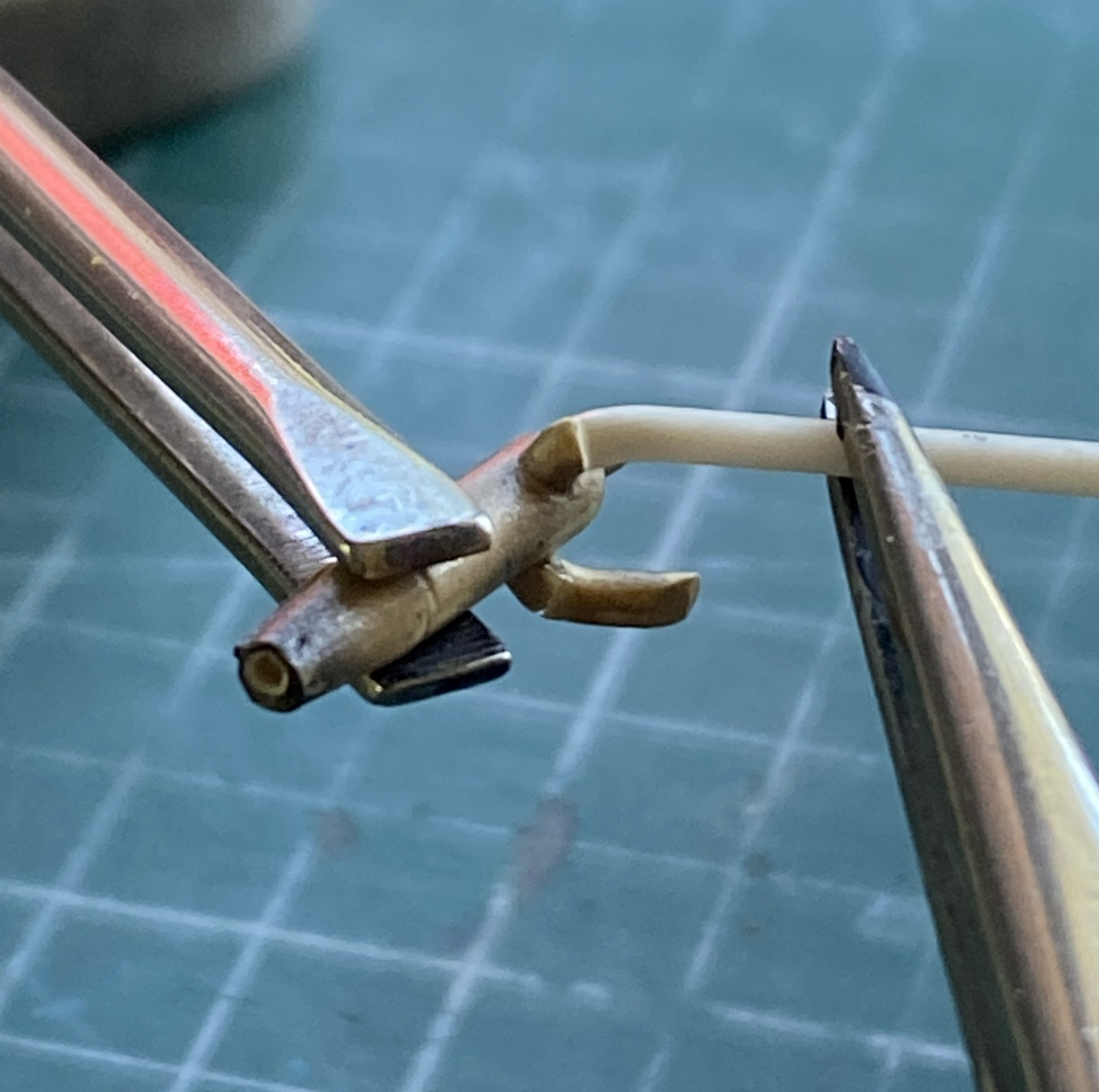 The mass balancers on the elevators. They’re so small that I left them attached to the sprue runners while I cleaned them up. I knew that I was going to make them removable using 22awg wire as pins. I didn’t need magnification to see that the bases are too small. 22awg was the smallest wire I was willing to use (anything smaller would be too flexible), so instead of even trying to get the notch I’d have to cut for the wires centered on the bases, I excised a slot slightly less than halfway through the base to recess the wire into. No…not accurate. Yes…practical: