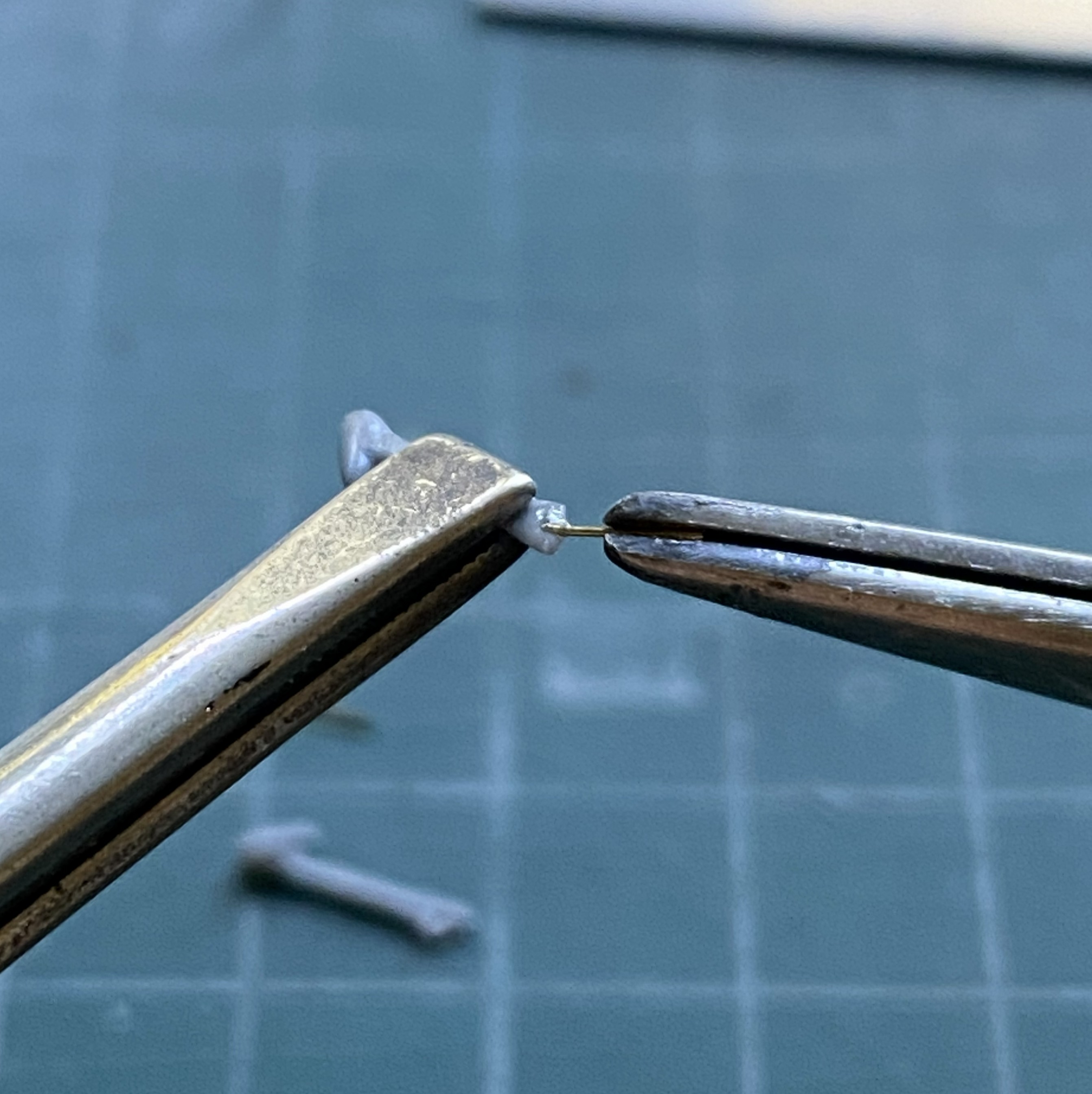 Jeweler’s files. The self-locking tweezers that are attached to stands. If you don’t have any, get two. They are so useful in getting pissy parts aligned, and keep them aligned, while glue sets. I use my pair on every build at some point and it’s time to use them again to keep the stretched sprue in place while the glue sets up: