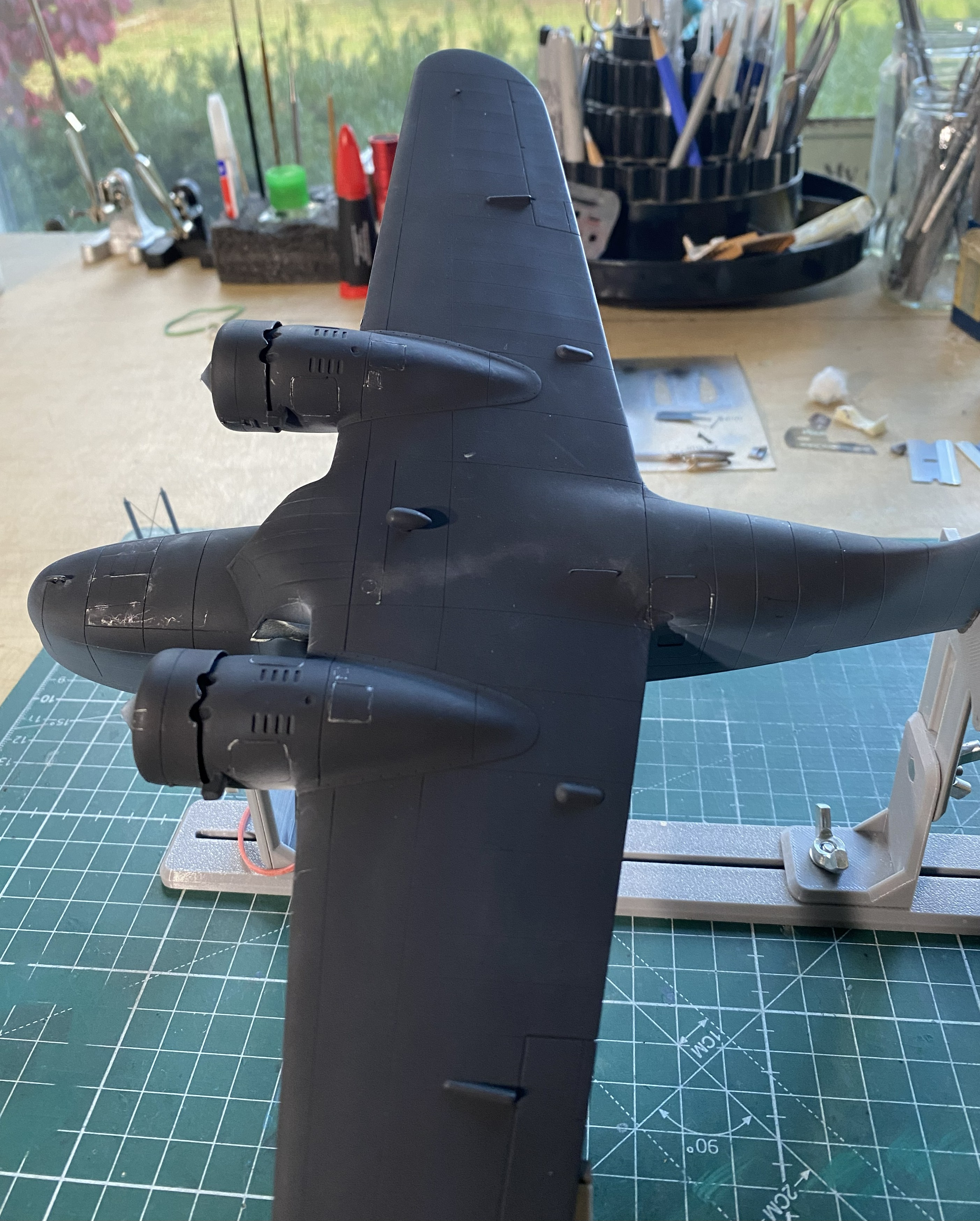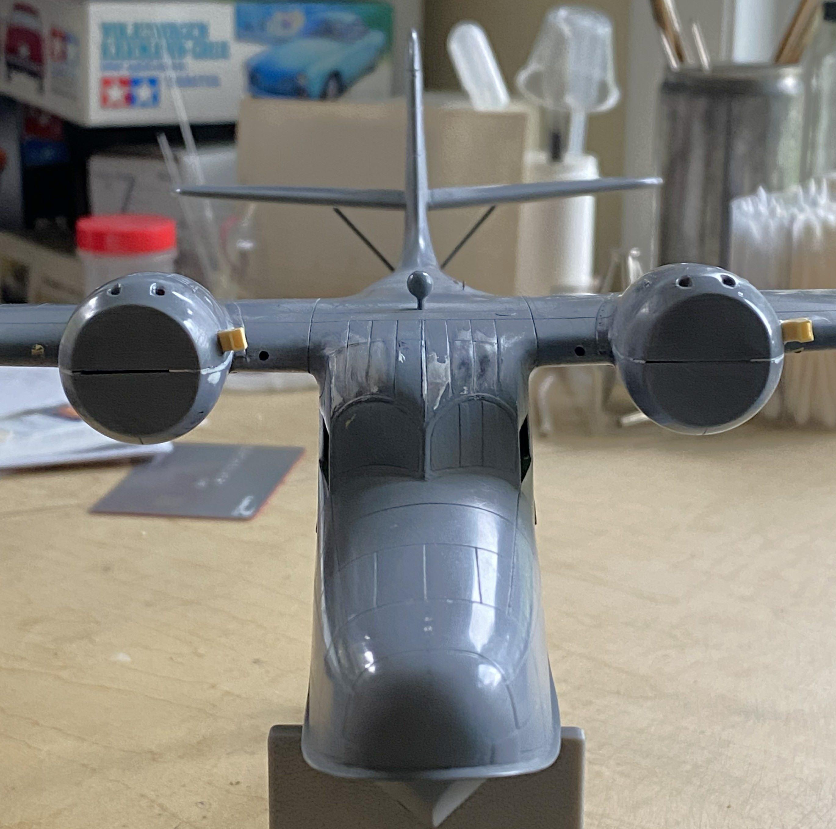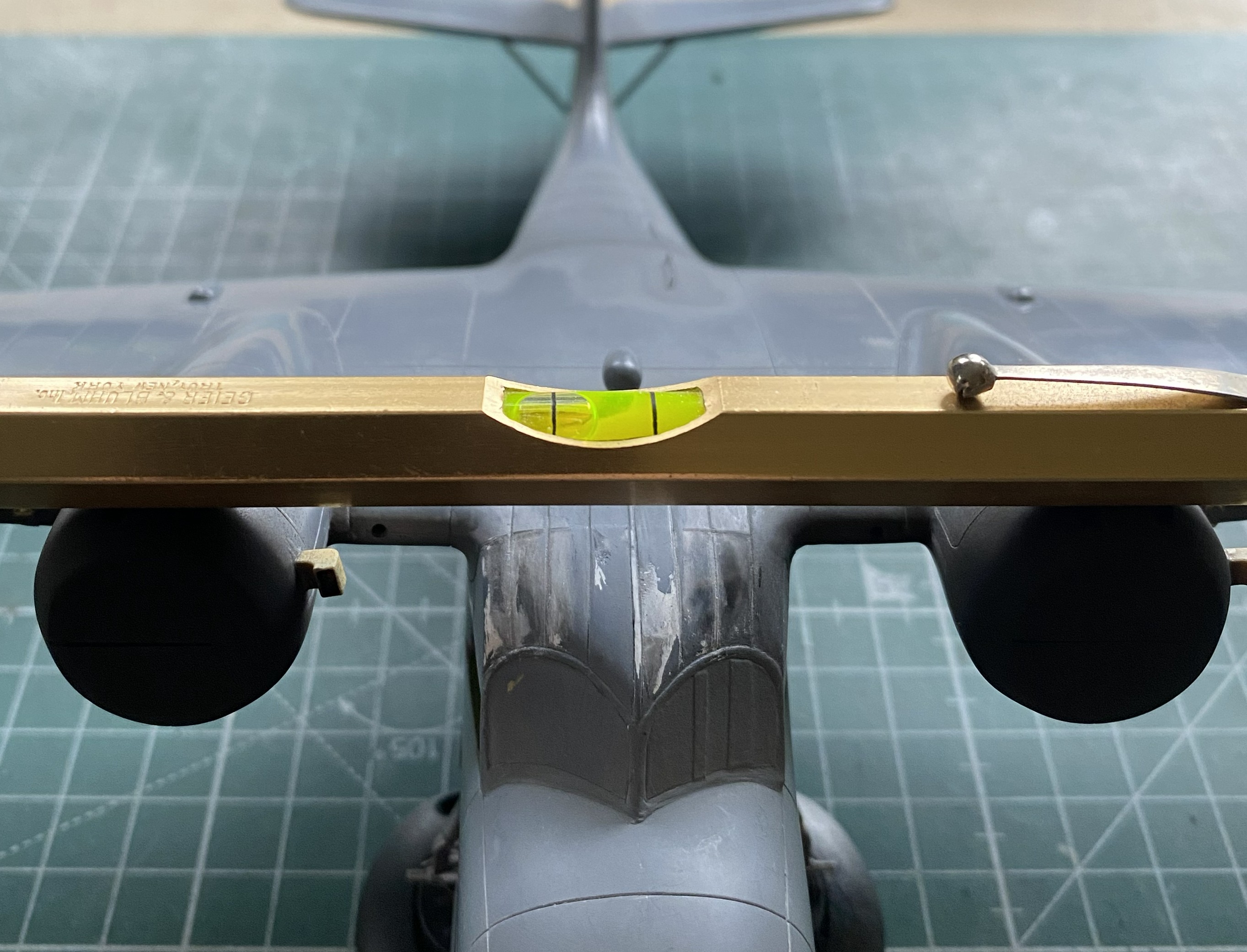 The next drill is going to be figuring out how to get this to sit level. It’s about 1/32″ (a little more than 1.5mm) off from side to side. This will be fun to fix. But to get that measurement, I had to have this build standing on its feet. While I had the wheels on, I decided to stick the props on as well to get a notion as to how it will display: