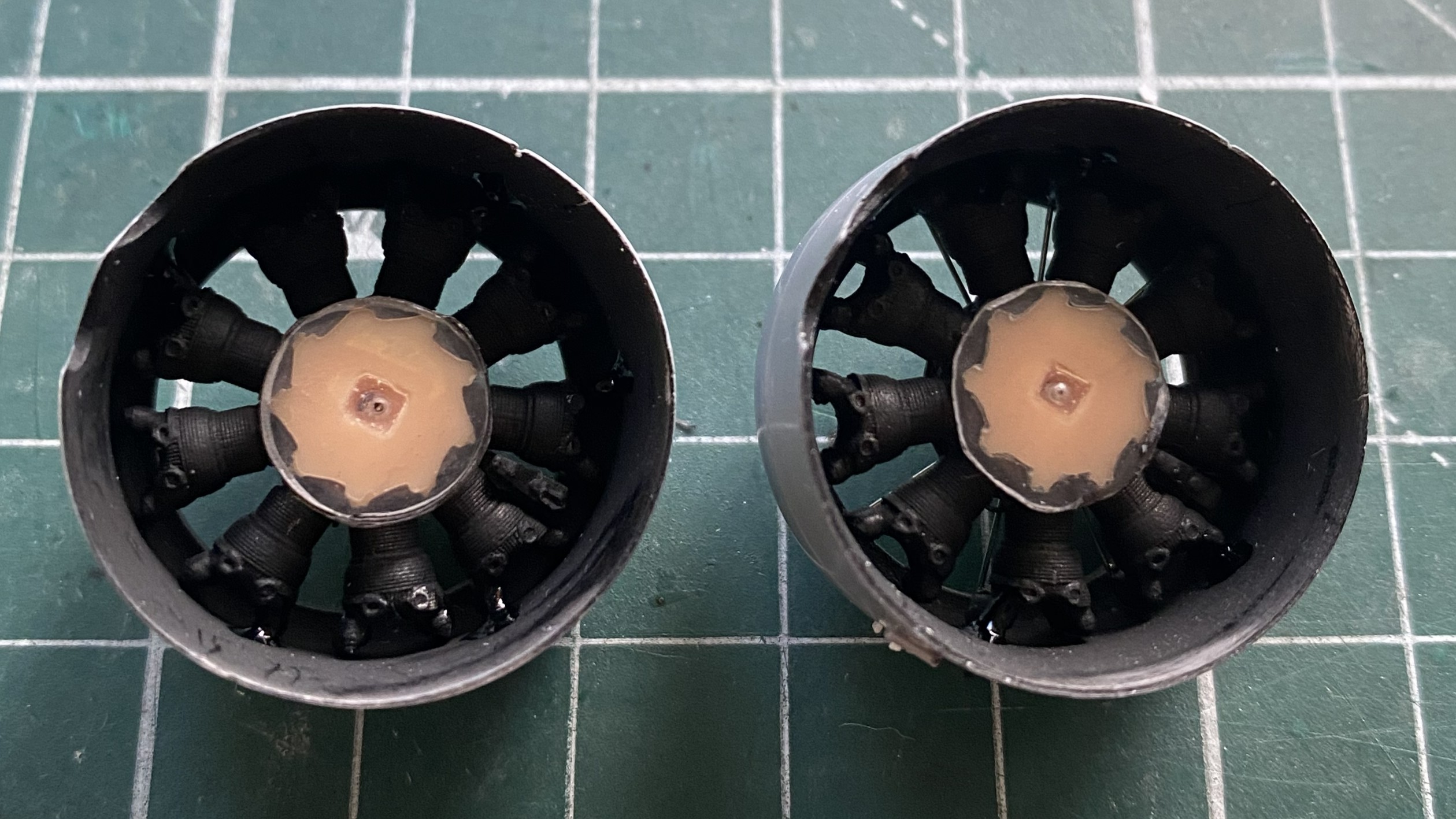 I’m glad I had the foresight to remember that however the cowling mounted, where the engines mount would be important. But, seeing as the engines are resin and mounting to plastic, superglue won’t allow me enough time to align them correctly. To get around that limitation, I superglued 0.010″(.254mm) clear styrene to the backs of the engines. This will allow me the to join styrene to styrene and fiddle them into alignment (I used clear plastic so that the added disks would be easier to center over the engines):