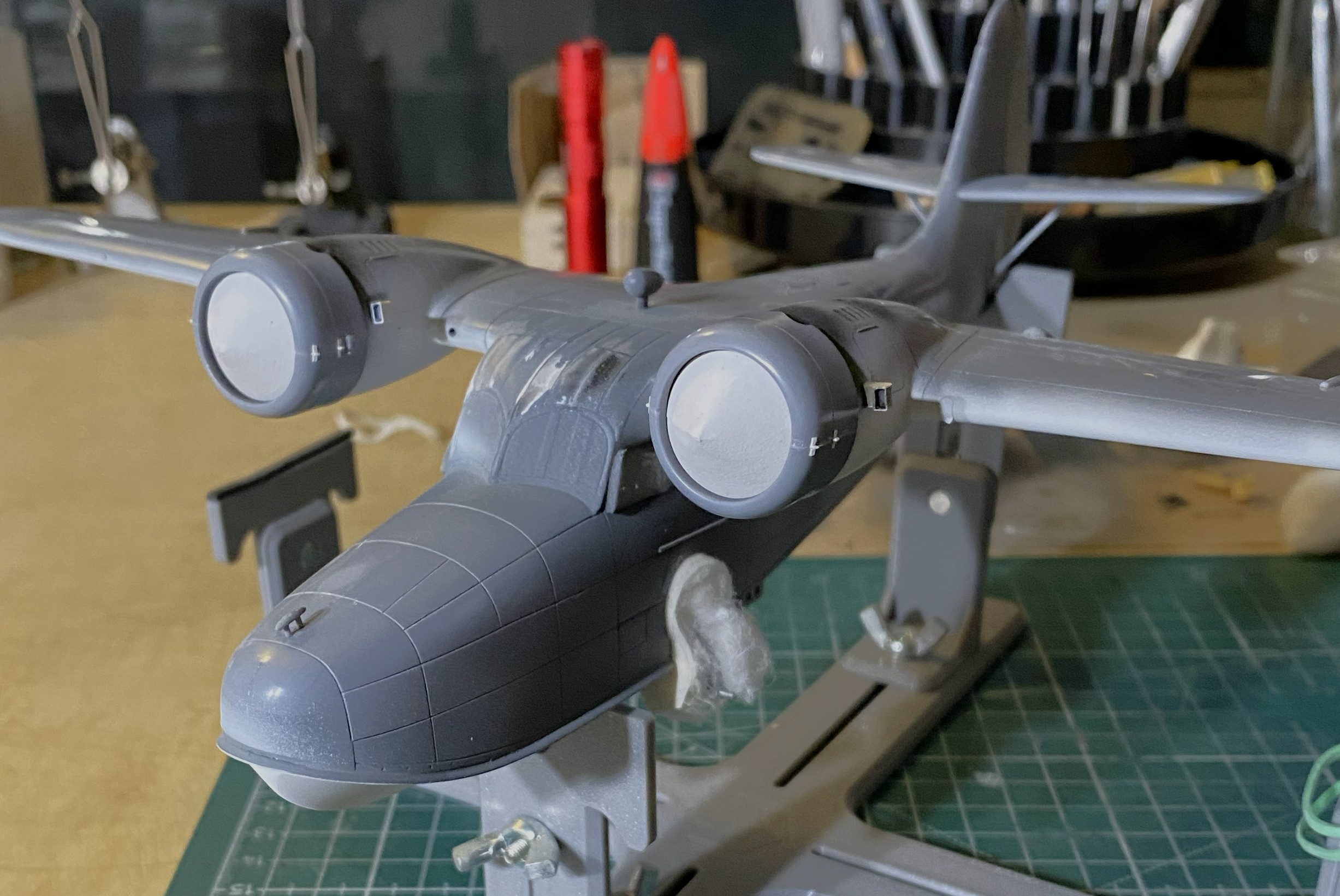 As this will have a three-color paint job, and the nacelles are definitely part of that paint job, I decided that adding the engines now would make all the color demarcations line up later. Before I added the engines, I traced the back of the cowl on paper, traced two circles (one for each engine), and after determining the center of the circles, cut from the center to the edge. This would give me paper cones that would fit in the cowling openings and mask the engines from the incipient painting (and if you look closely behind the engine that’s on the right in the photo, you can see the trimmed foam in the cockpit’s window behind it). With that done, I glued the engine/cowling assemblies in place (shortly after these photos were taken, I painted the undersides of the cowlings white as well):