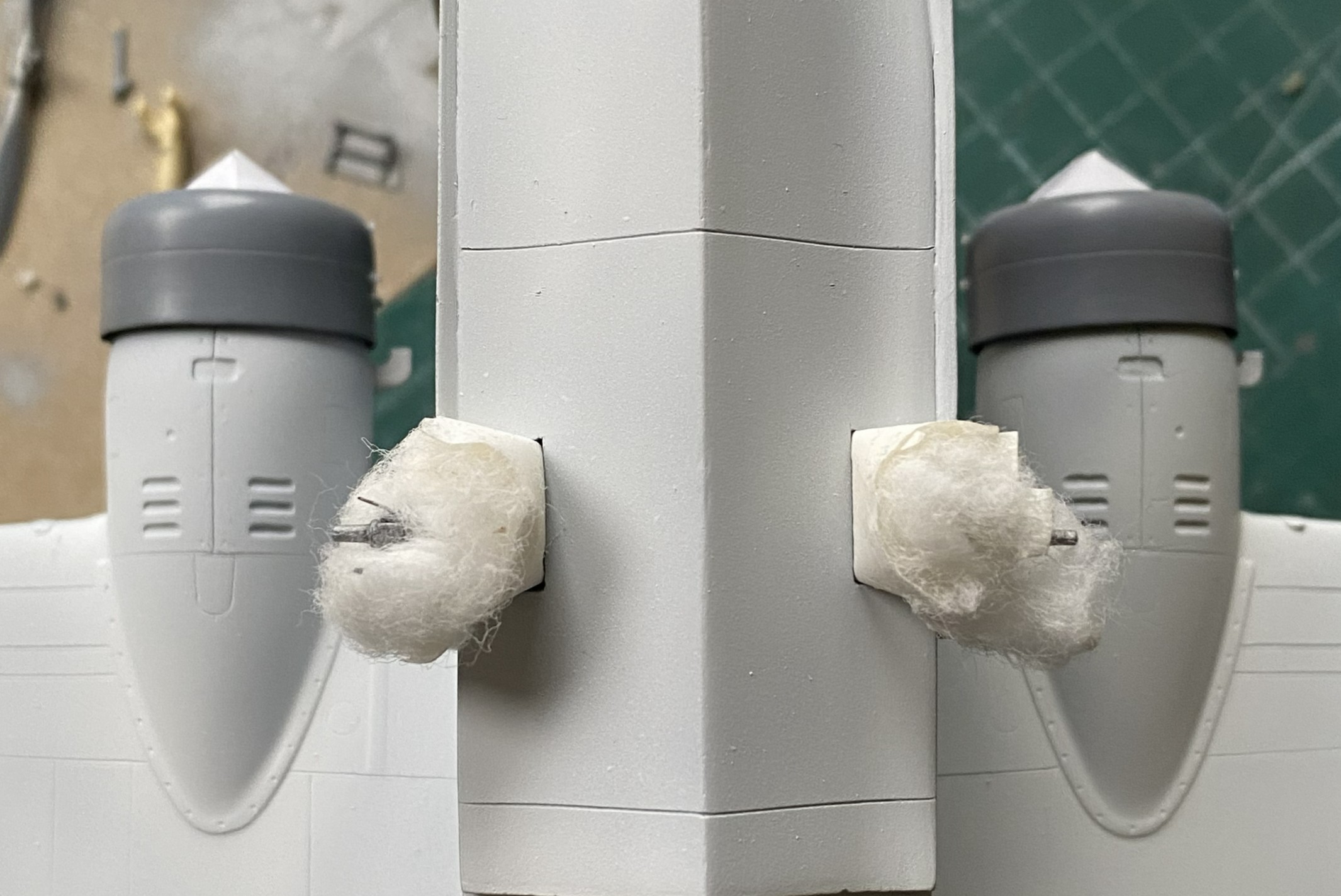 My next task was to start throwing paint at this. Of course I started with the light colors and worked darker, but where I started was figuring out how to mask this using cotton balls for the landing gear, front and rear. For the cockpits, I took foam wedges (nail care section of the drugstore/apothecary) and cut them oversized so that they would hold themselves in position (usually):