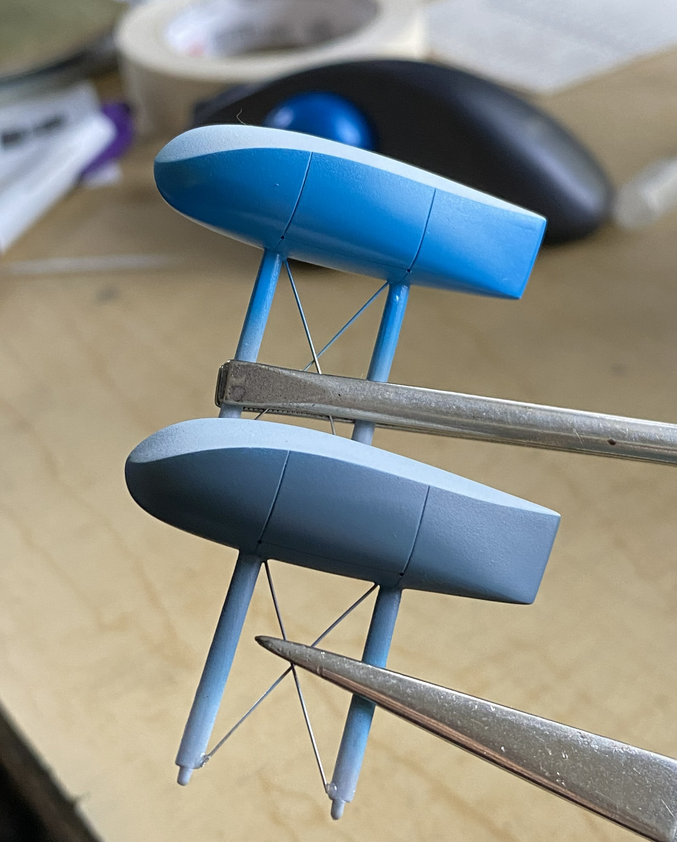 When the paint arrived, XF-18 Medium Blue, I started the repainting with the floats. I’m sure you can figure out which was the before and which is the after: