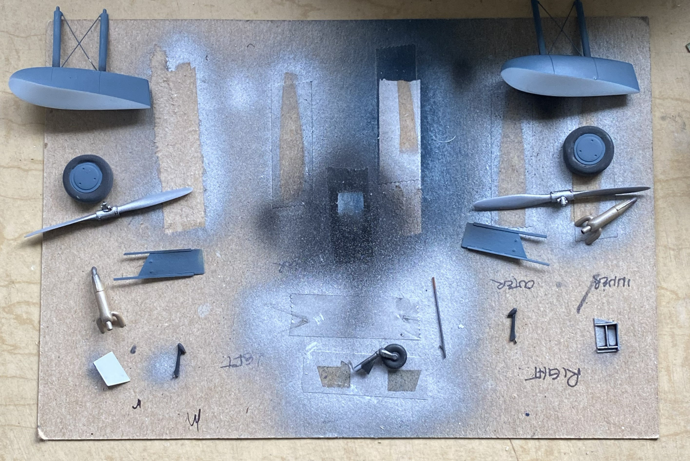 It’s at this point that I got to see what happens when I get interrupted in the middle of something. I’ll forget the second half of something. I had one propeller all painted and ready. The other? Well, I got the hub painted and washed… Yeah. Let’s fix that before somebody notices: