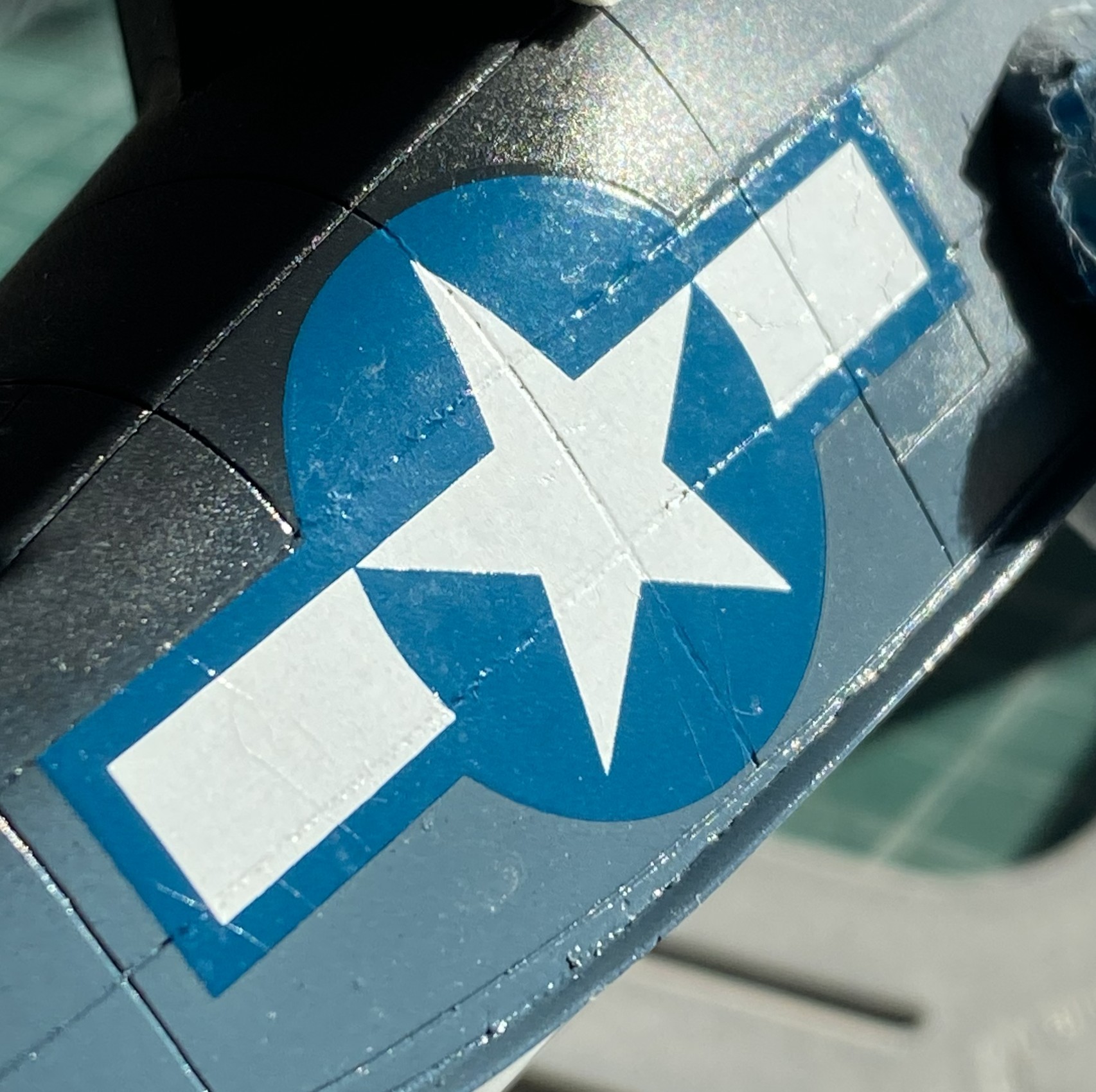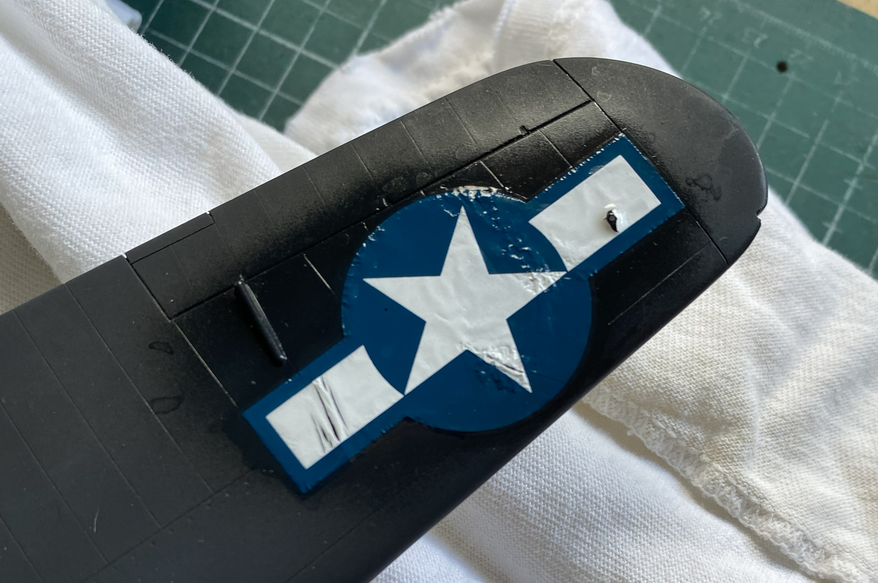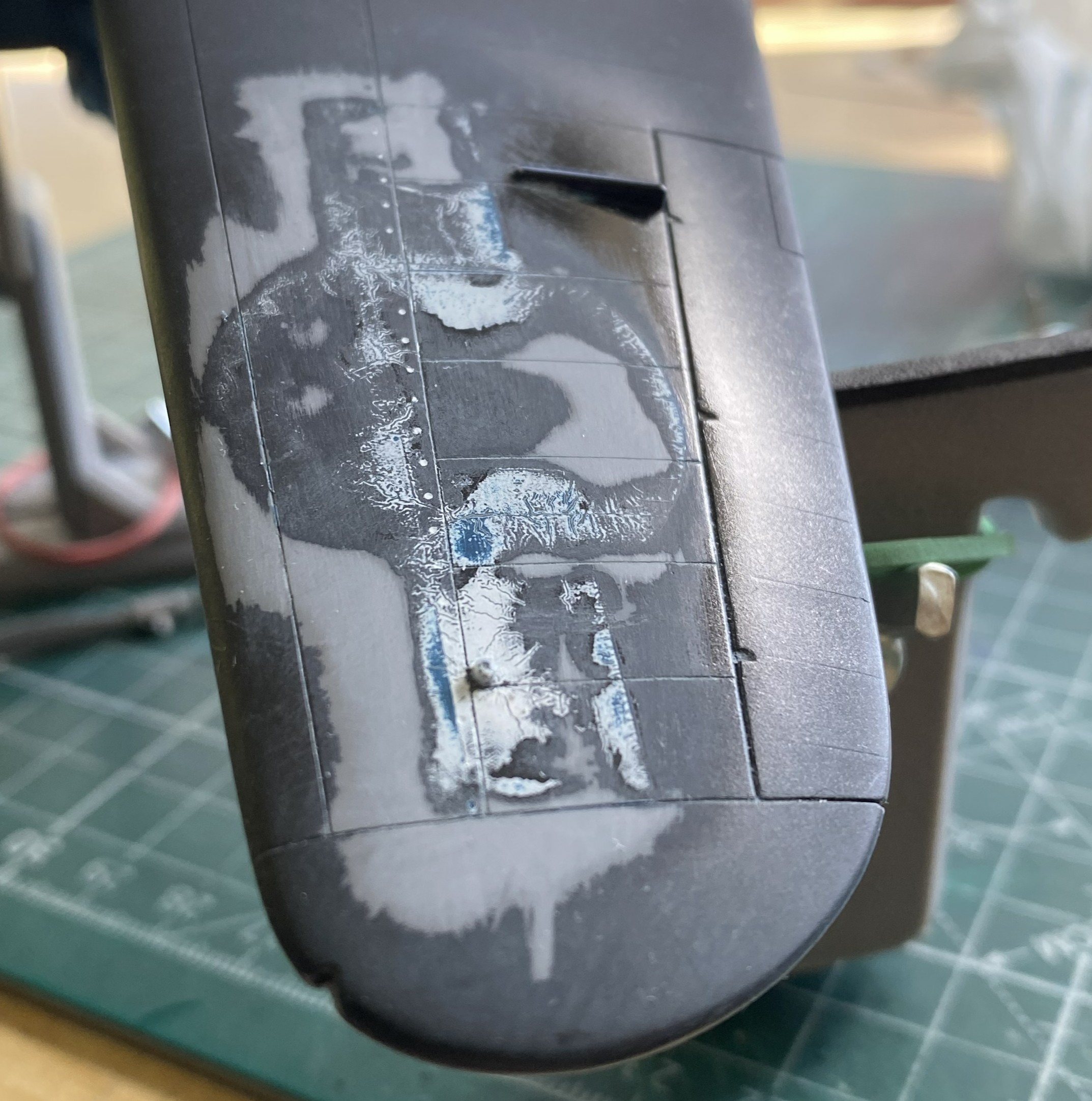 The second photo above was the best Solvaset could manage. Not acceptable. I only know of one way to remove blown decals. Sand them off, reapply paint, and start over: