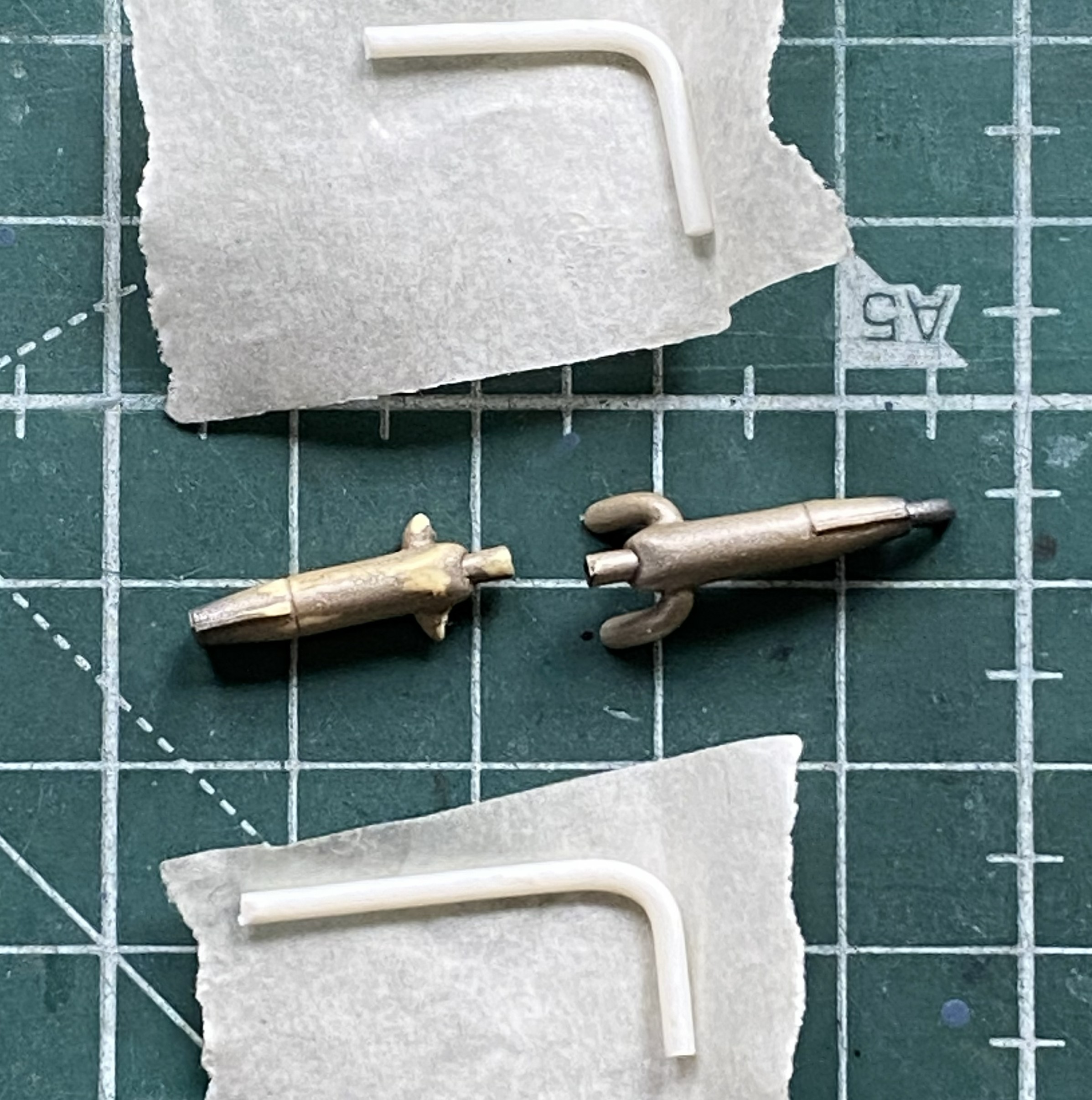 Okay, so I get to reattach the tail and make new arms. I didn’t have the exact diameter styrene rod, but I had styrene rod that was maybe 0.005″ (.127mm) less in diameter and that was close enough. Plastic has a memory so if I wanted a 90-degree bend, I’d have to over-bend them and let them sit overnight to attain their new memory:
