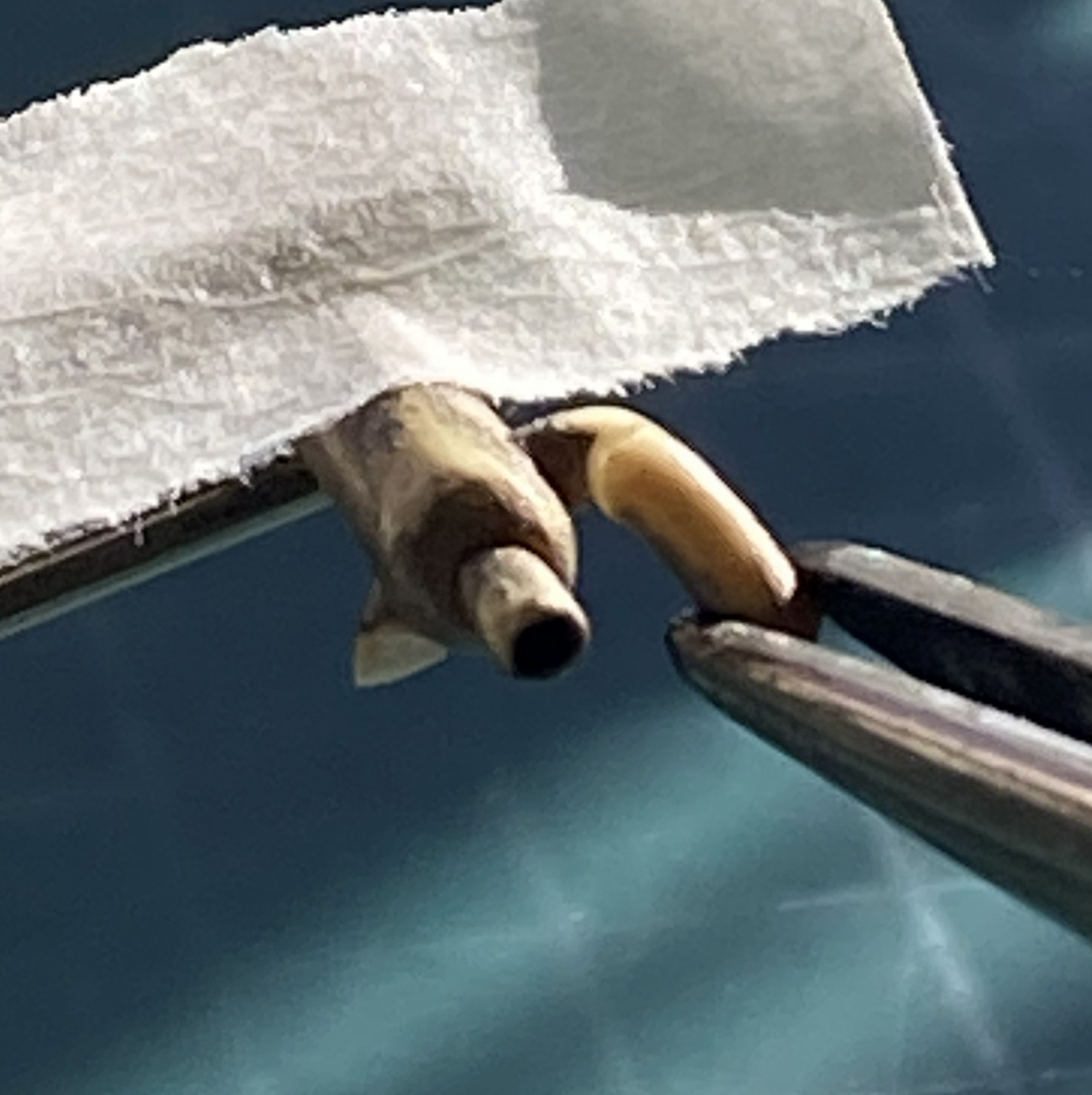 At this point, a regular occurrence occurred. I dropped something and realized that the floor between my feet was CRUDDY. Okay, pick up the dropped tool and sweep the floor. Once the detritus was in the dust pan, there was one of the two arms sitting right there. Okay…let’s attach that NOW so I did using UV-setting resin: