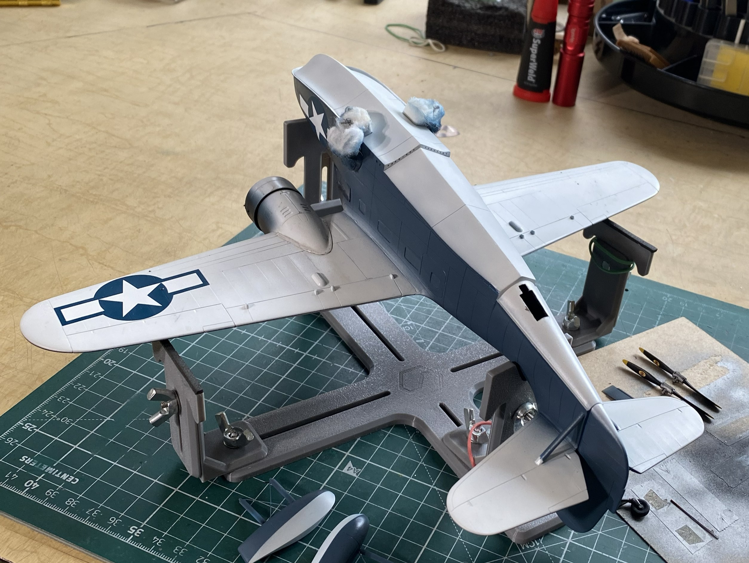 Seeing as I clearly can’t keep track of where my fingers go, I needed a method that would enable me to handle the model as it was being painted. Since I was starting with the bottom, next I would do the sides, and then finally the color on top of the aircraft. And since I want to finish this in a semi-gloss finish, I would also need a painting order for that as well. I let that rattle around inside my wig for now and set about getting that wrong blue covered.